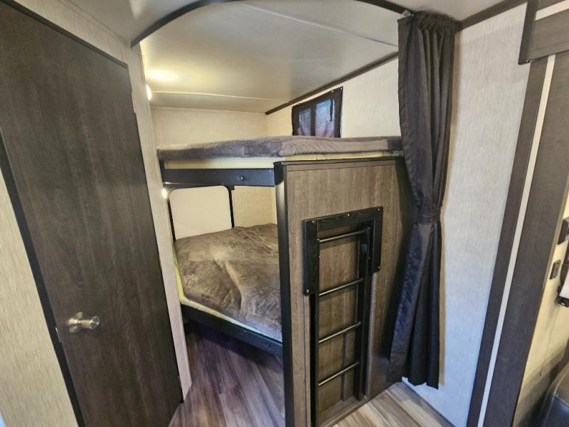 The kids or friends will be begging to go camping every other weekend in this travel trailer that includes double-size bunks. You'll appreciate the door by the bunks and the bottom hinge that will allow you to easily load luggage, coolers, or lawn chairs. Set up the power awning once you arrive at your destination, then prepare lunch on the outside kitchen. You can dine outside on the picnic table, or sit around the U-shaped dinette inside the unit. Mom and dad will love the front private bedroom that includes a king bed for all-around comfort, plus their own exterior entry door for convenience!