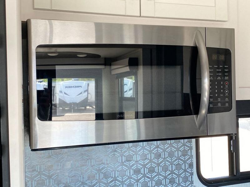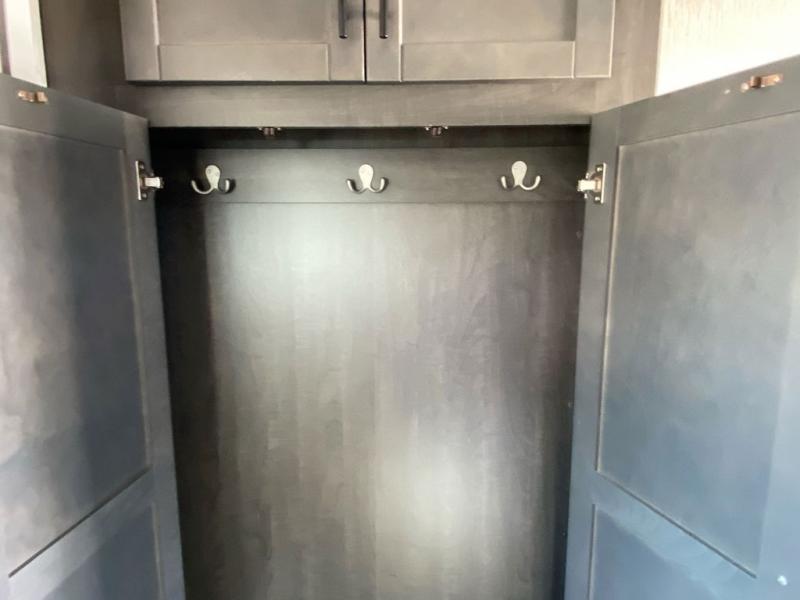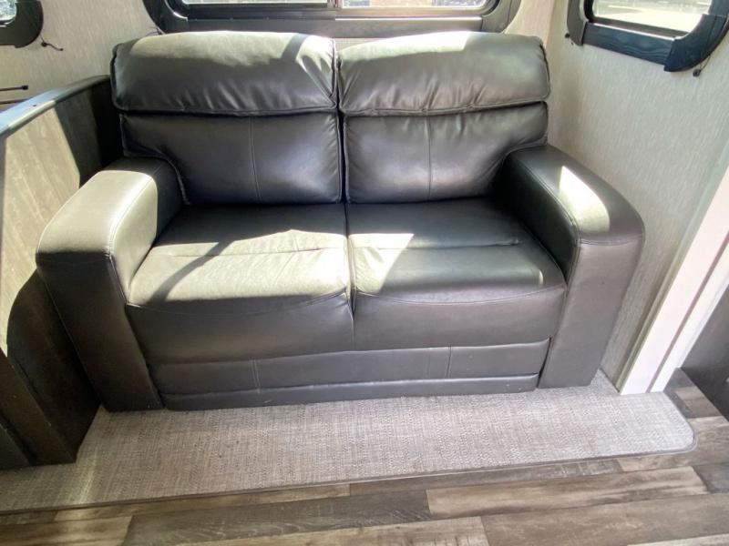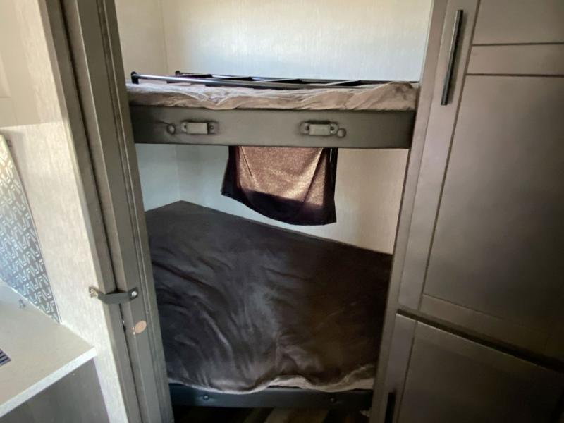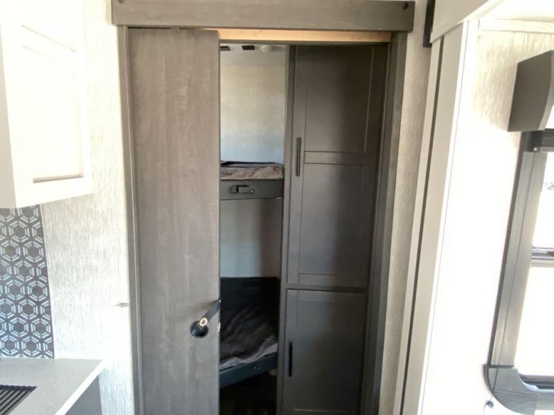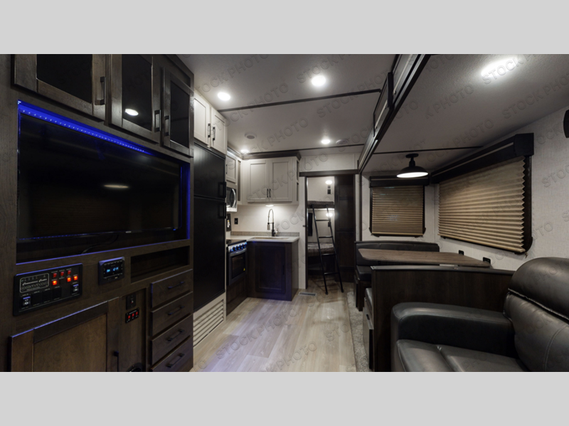 What makes a fifth wheel great? Spacious living areas, abundant sleeping space, and convenient features; you'll find them all in this unit! The little ones or your friends are sure to love the double-size bunks, plus there is storage under the bunks with outside access for convenience. The large slide out in the main living area provides the chef of the family space to cook a meal, or they may want to cook on the outside kitchen if the weather is nice. You will appreciate your seating options in this model, including the optional table and chairs in place of the booth dinette, and the optional theatre seating in place of the tri-fold sofa. Everyone can clean up in the full bath each day, and the front private bedroom with a king bed will feel just like home!