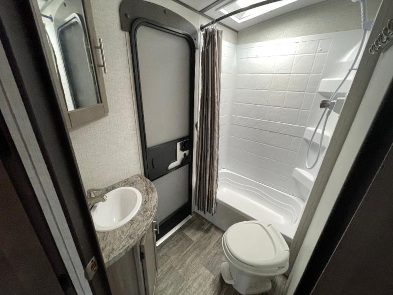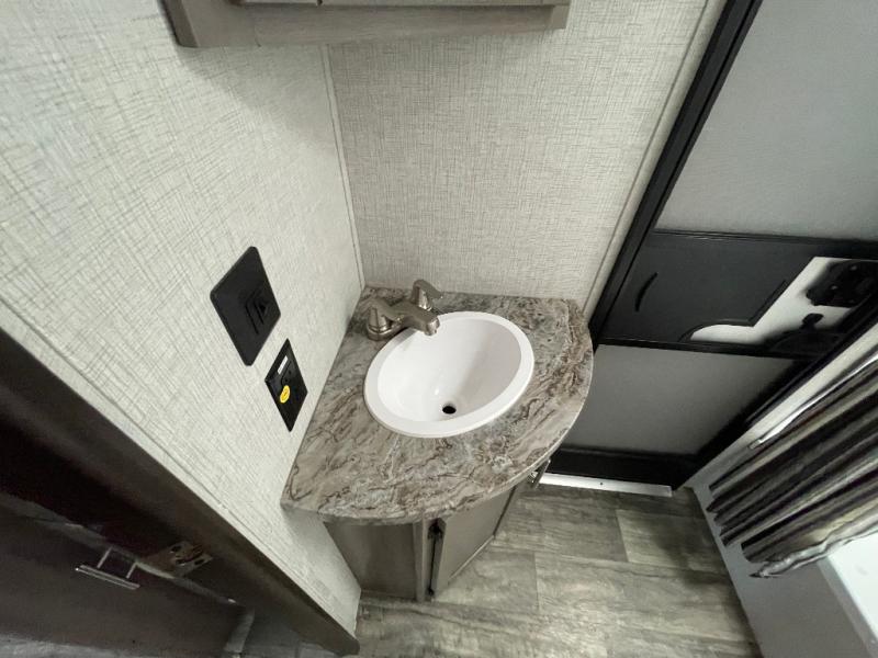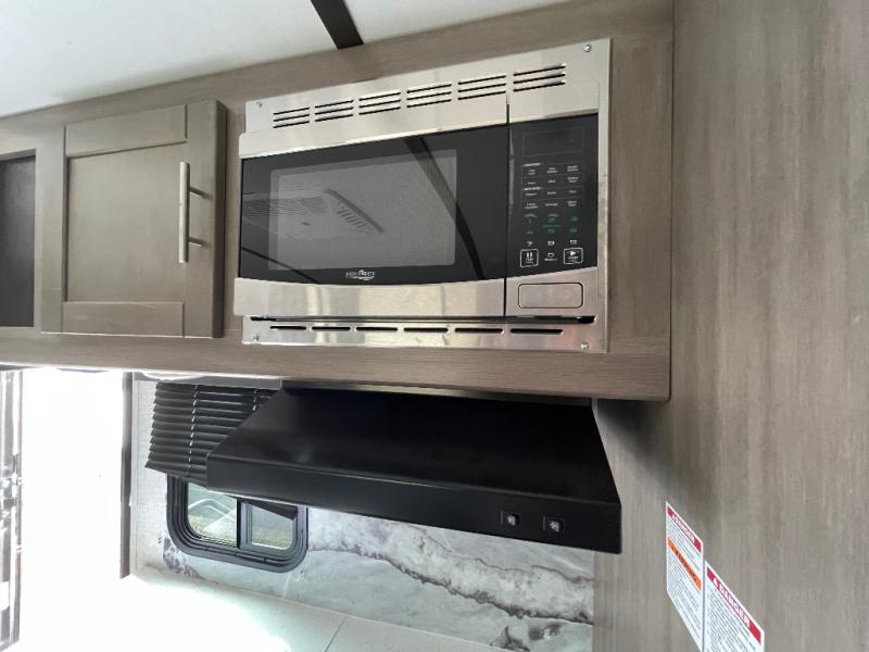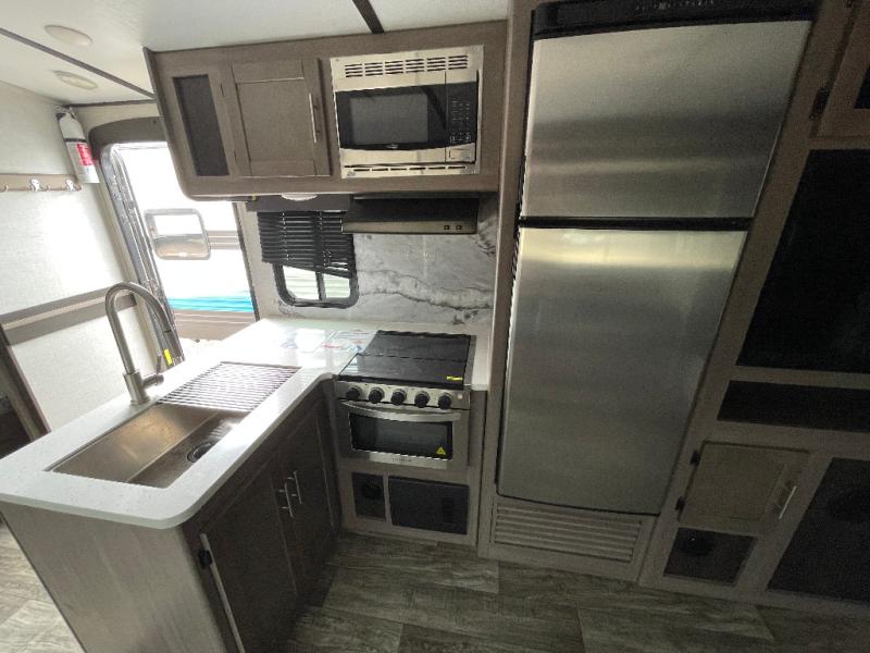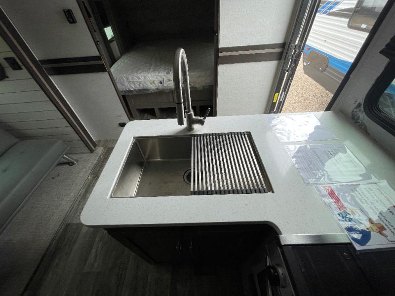 With any Sunset Trail travel trailer by CrossRoads RV, the interior offers a stainless steel farmhouse single bowl sink with a cover, solid surface countertops in the kitchen, a 12 volt refrigerator, USB ports in the bedroom and main area, and a Connexx entertainment TV with soundbar for inside enjoyment. Also included is the Extreme Weather package with maximum insulation with reflective foil, a 30,000 BTU furnace, and a 2" heat duct in the enclosed underbelly for four seasons of traveling. And the Blade Air system offers 20% more airflow and re-engineered components on the A/C. The HyperDeck flooring is water resistant, fiberglass reinforced and has polypropylene layers. Make your lightweight and comfortable RV decision today!