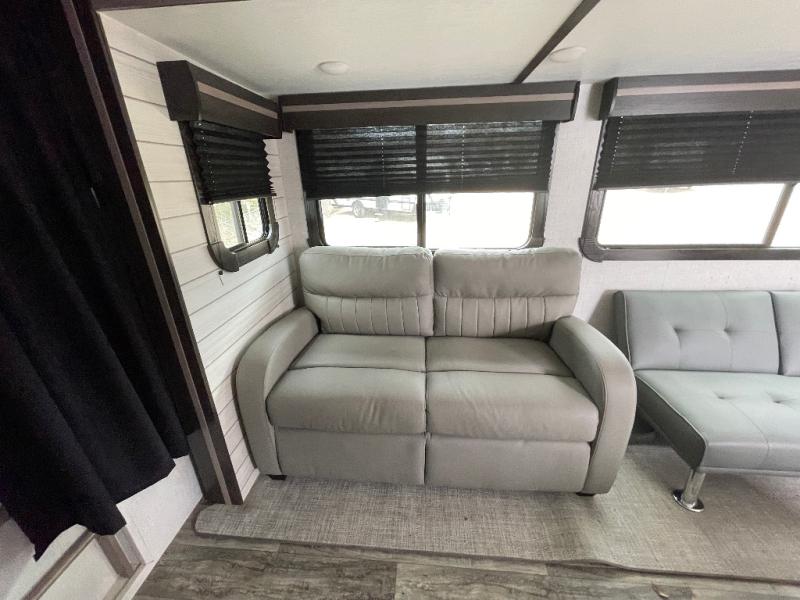 This travel trailer can comfortably sleep ten people each night, so invite the cousins for whole-family fun! The kids are sure to love the double-size bunks, and the owners will have their own private bedroom up front with a king bed. Within the large slide out you'll find the XL booth dinette which can sleep two, plus the tri-fold sofa that can be replaced by an optional theater seating if you choose. Whip up dinner in a flash on the glass top range or use the exterior camp kitchen. The full bath includes its own exterior entrance door for convenience, and there is a power awning with LED lights for the perfect outdoor living space!