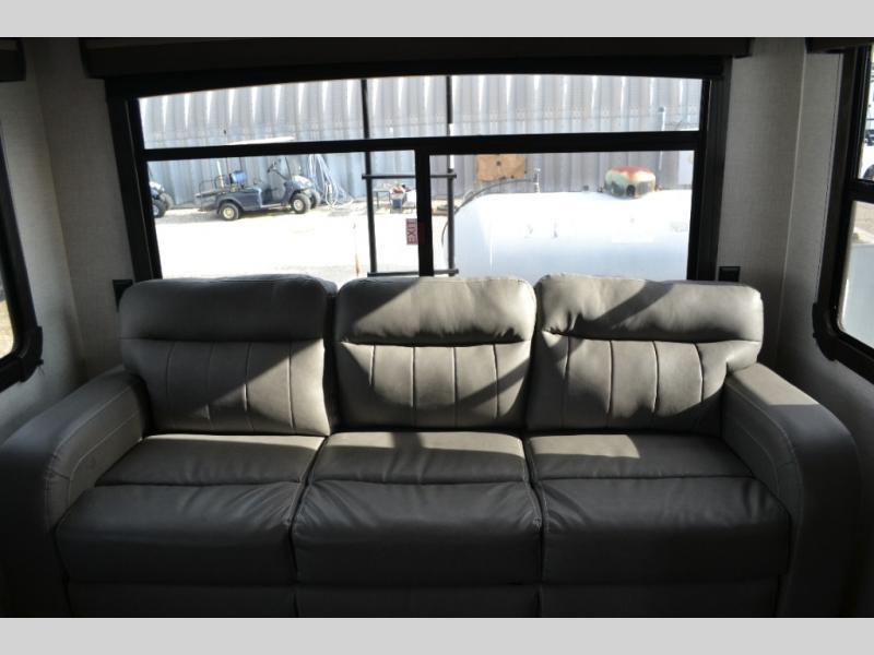 Rear living area with comfortable seating and entertainment center