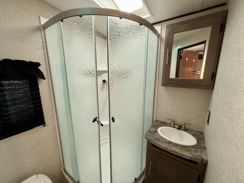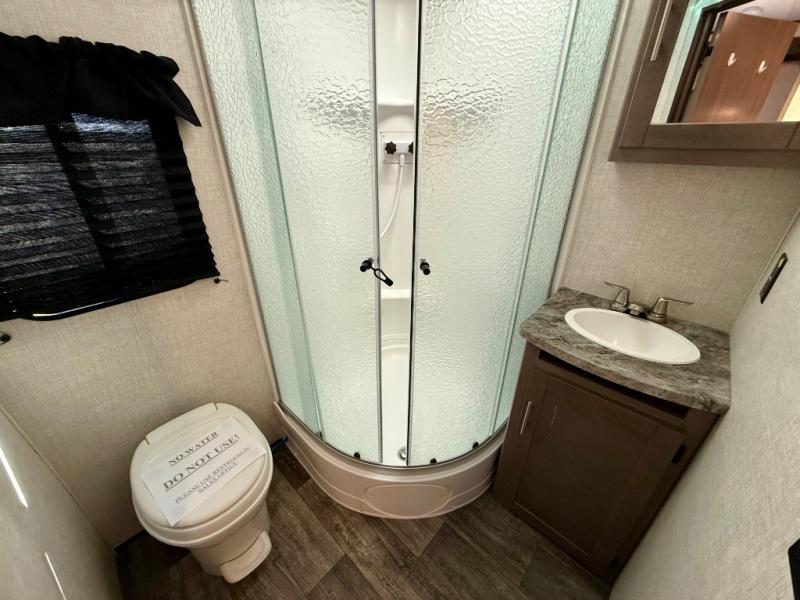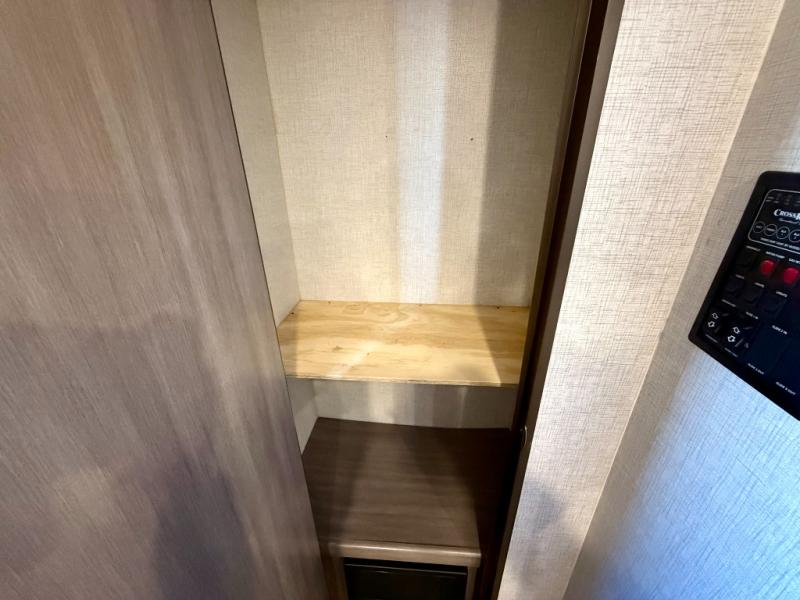 Nothing says luxury like a king bed in the front bedroom, plus a slide out for added interior space. Your crew can relax on the tri-fold sofa and chaise lounge before heading off to find a trail or two. There is a convenient shoe storage and pet station for your furry friends, and the dual wardrobes can store all your clothes for the week. Freshen up in the full bath that includes a shower skylight, then head to the kitchen to prepare a meal on the glass top range or use the handy stainless steel microwave. This model also includes a pantry just as you enter the unit, plus plenty of overhead compartments for all your belongings!