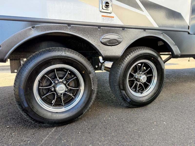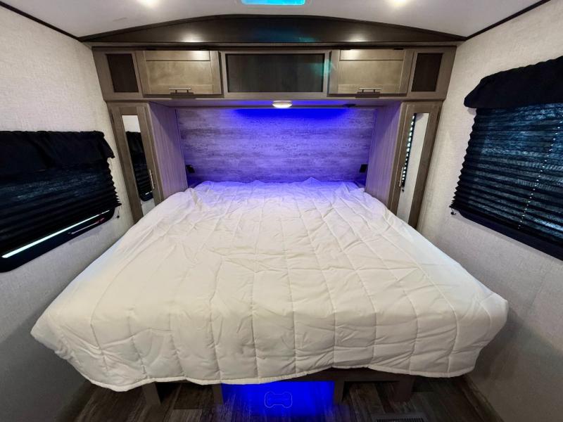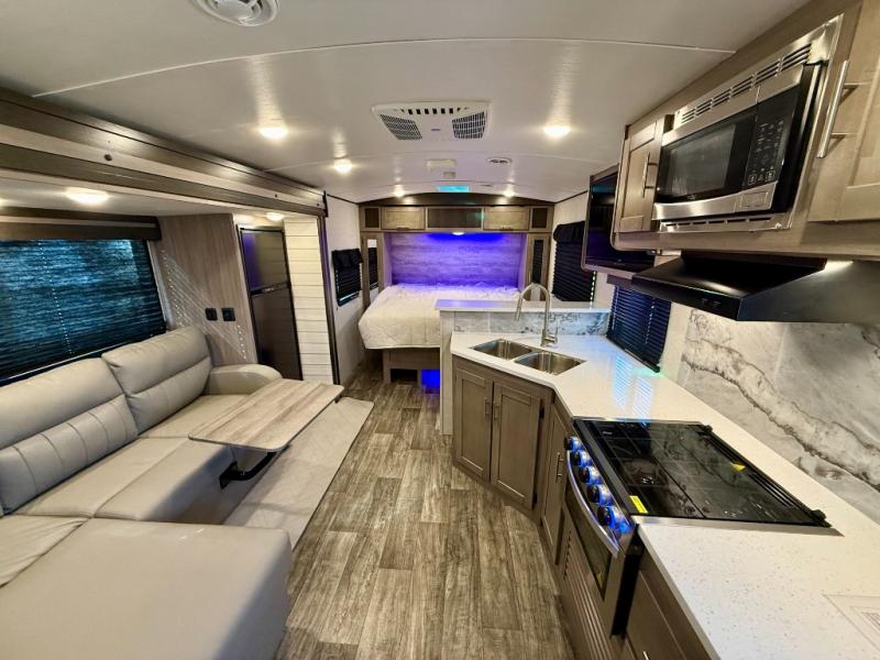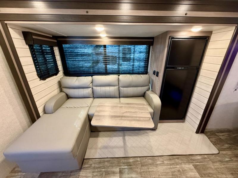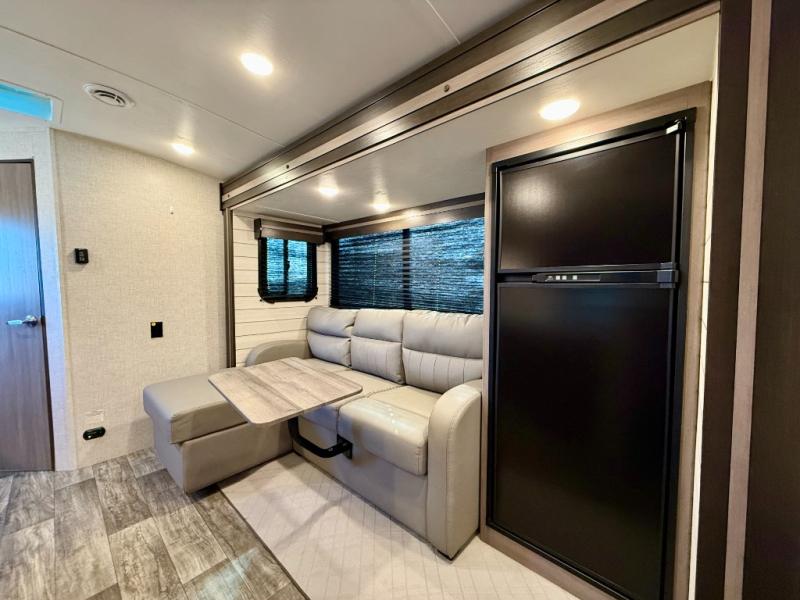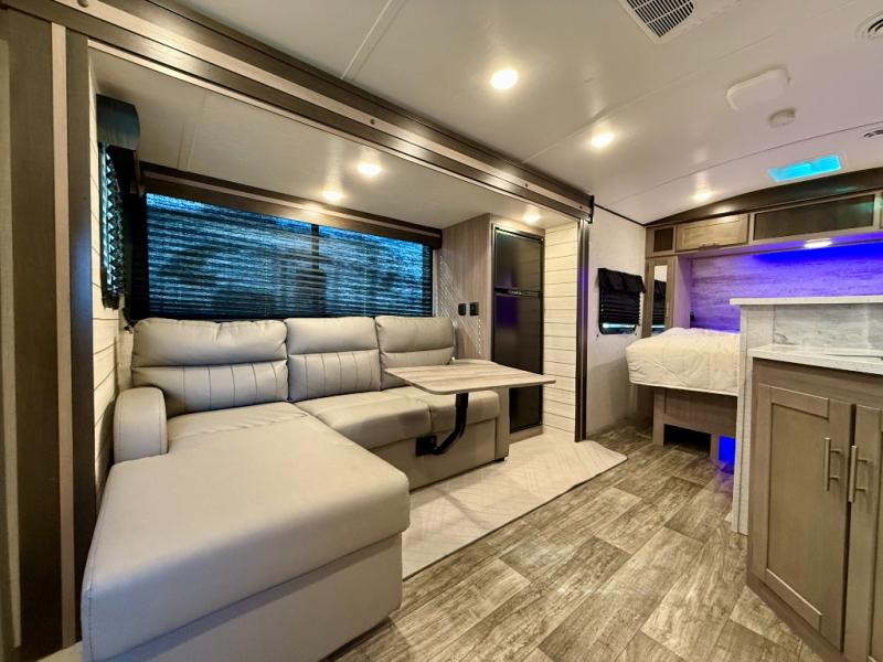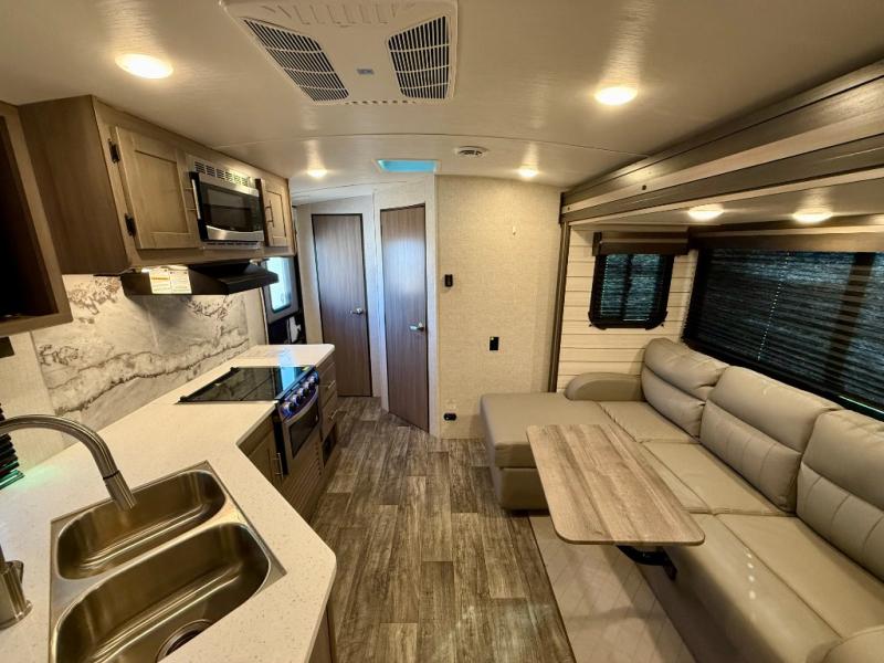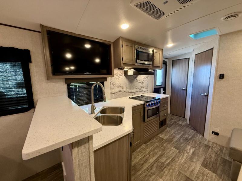 With any Sunset Trail travel trailer by CrossRoads RV, the interior offers a stainless steel farmhouse single bowl sink with a cover, solid surface countertops in the kitchen, a 12 volt refrigerator, USB ports in the bedroom and main area, and a Connexx entertainment TV with soundbar for inside enjoyment. Also included is the Extreme Weather package with maximum insulation with reflective foil, a 30,000 BTU furnace, and a 2" heat duct in the enclosed underbelly for four seasons of traveling. And the Blade Air system offers 20% more airflow and re-engineered components on the A/C. The HyperDeck flooring is water resistant, fiberglass reinforced and has polypropylene layers. Make your lightweight and comfortable RV decision today!