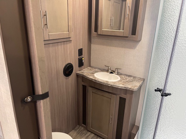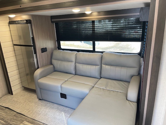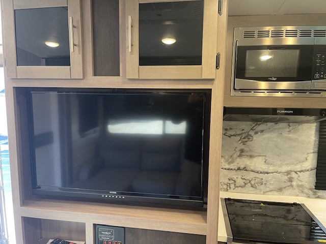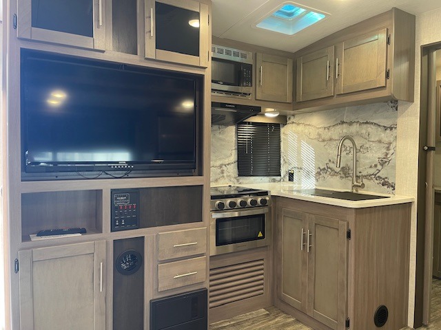 It's time to upgrade your RV to this spacious travel trailer! The slide out in the main living area will provide the dog space to stretch out, and within the slide out you'll find the tri-fold sofa/chaise lounge for your comfort. The full rear bath is both spacious and convenient with its shower skylight, medicine cabinet, and linen closet for clean towels. Head to the kitchen to prepare lunch on the glass top range or take your preparations outside to cook on the exterior camp kitchen. This model also features a front private bedroom with a king bed, dual wardrobes, plus a shoe storage and pet station for your loyal buddy, plus there is an available optional 8 cu. ft. refrigerator, and more!