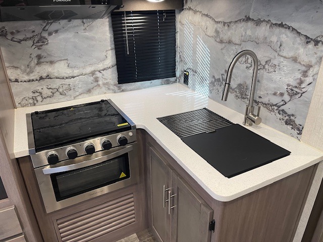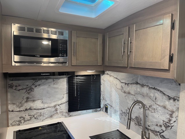 With any Sunset Trail travel trailer by CrossRoads RV, the interior offers a stainless steel farmhouse single bowl sink with a cover, solid surface countertops in the kitchen, a 12 volt refrigerator, USB ports in the bedroom and main area, and a Connexx entertainment TV with soundbar for inside enjoyment. Also included is the Extreme Weather package with maximum insulation with reflective foil, a 30,000 BTU furnace, and a 2" heat duct in the enclosed underbelly for four seasons of traveling. And the Blade Air system offers 20% more airflow and re-engineered components on the A/C. The HyperDeck flooring is water resistant, fiberglass reinforced and has polypropylene layers. Make your lightweight and comfortable RV decision today!