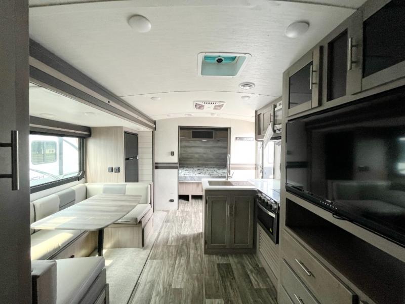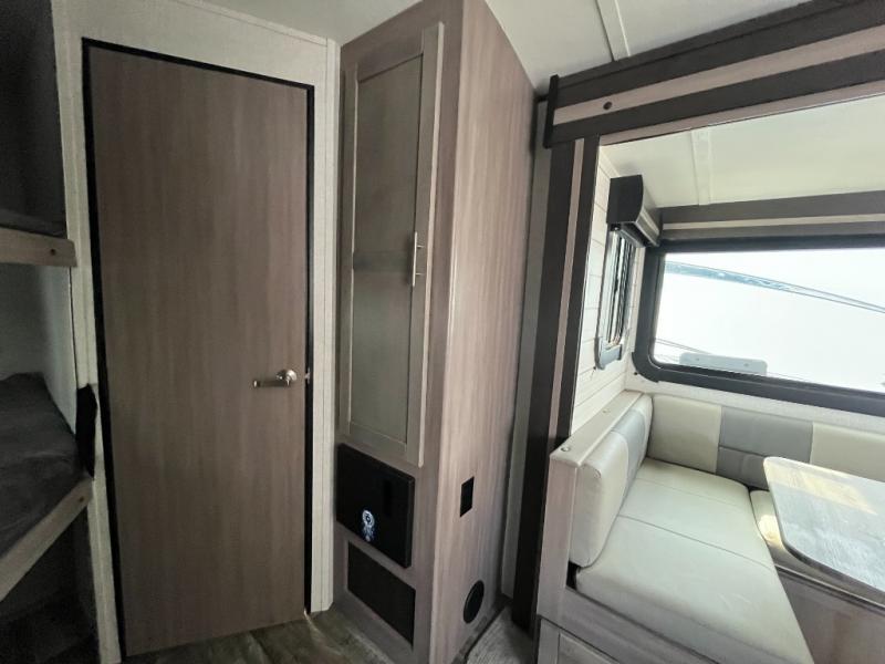 From the front private bedroom with a king bed and a slide out, to the rear corner bath and double-size bunks, you will love everything about this travel trailer. When you wake up in the morning you can prepare breakfast on the exterior camp kitchen, and if it's raining outside, the glass top range indoors will get the job done. There is also a stainless steel microwave for quick meals, and the wardrobe/pantry can store paper goods and the kids' cereal. Play a game of cards around the U-shaped dinette before heading off to bed in the front private bedroom!