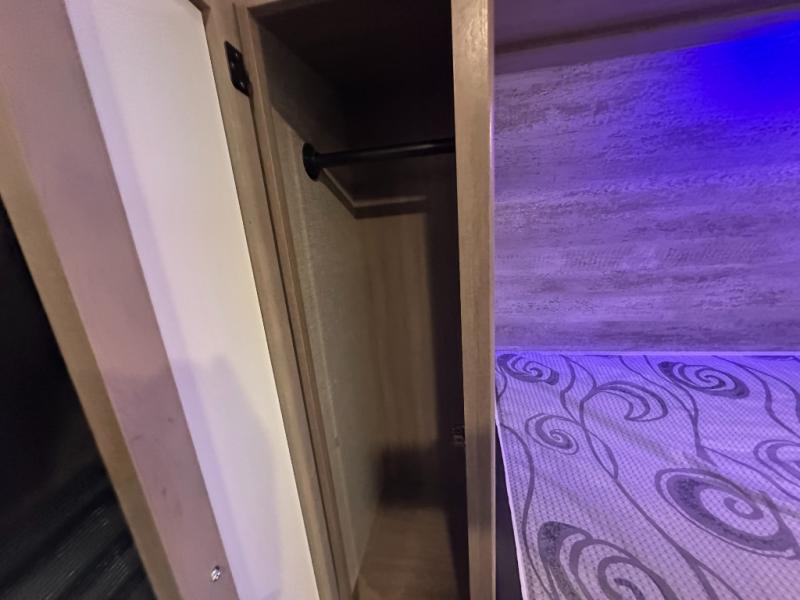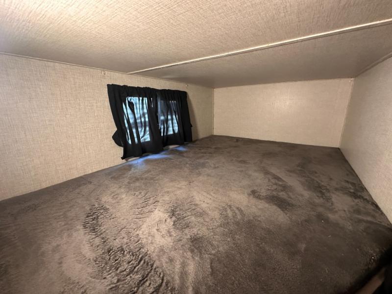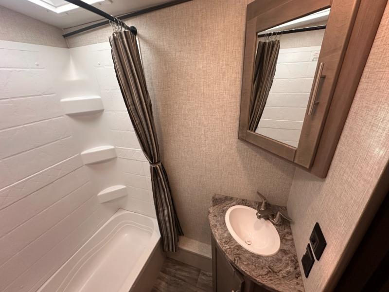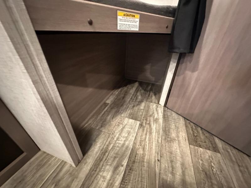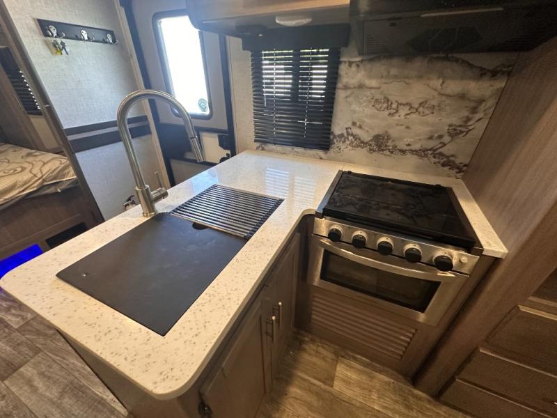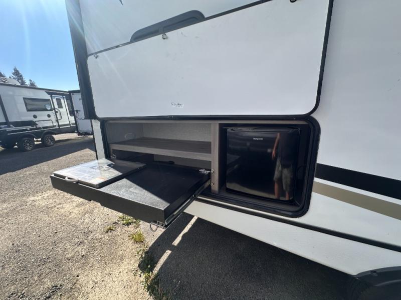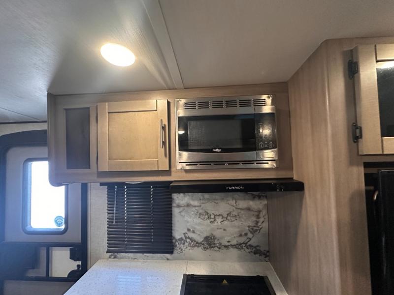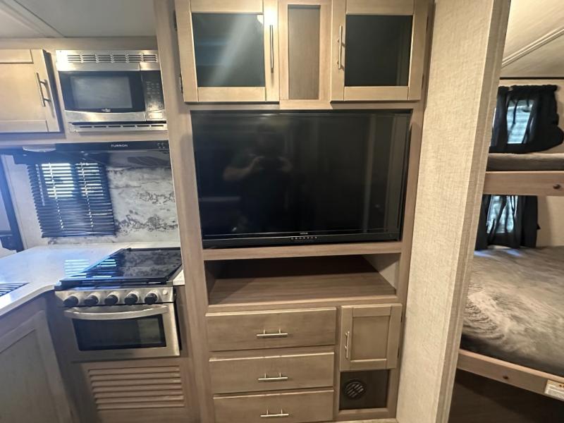 From the front private bedroom with a king bed and a slide out, to the rear corner bath and double-size bunks, you will love everything about this travel trailer. When you wake up in the morning you can prepare breakfast on the exterior camp kitchen, and if it's raining outside, the glass top range indoors will get the job done. There is also a stainless steel microwave for quick meals, and the wardrobe/pantry can store paper goods and the kids' cereal. Play a game of cards around the U-shaped dinette before heading off to bed in the front private bedroom!