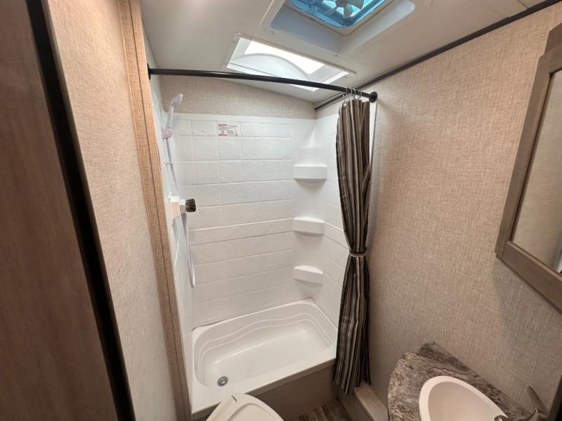 With any Sunset Trail travel trailer by CrossRoads RV, the interior offers a stainless steel farmhouse single bowl sink with a cover, solid surface countertops in the kitchen, a 12 volt refrigerator, USB ports in the bedroom and main area, and a Connexx entertainment TV with soundbar for inside enjoyment. Also included is the Extreme Weather package with maximum insulation with reflective foil, a 30,000 BTU furnace, and a 2" heat duct in the enclosed underbelly for four seasons of traveling. And the Blade Air system offers 20% more airflow and re-engineered components on the A/C. The HyperDeck flooring is water resistant, fiberglass reinforced and has polypropylene layers. Make your lightweight and comfortable RV decision today!