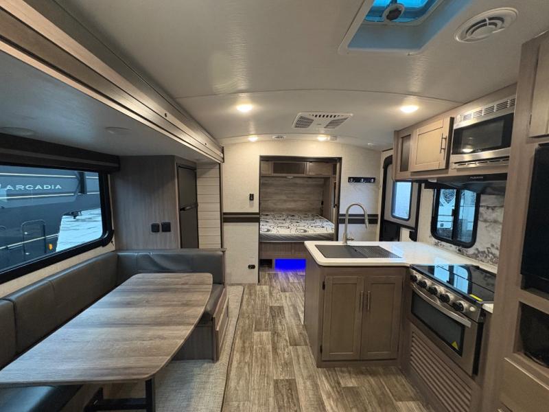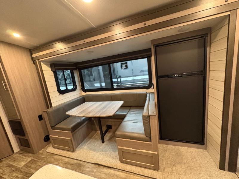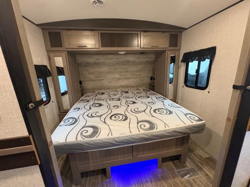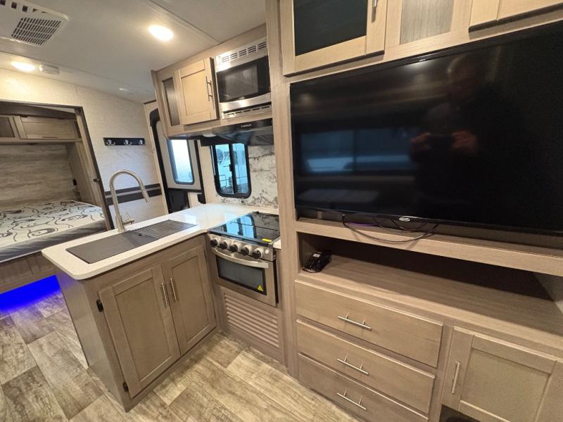 From the front private bedroom with a king bed and a slide out, to the rear corner bath and double-size bunks, you will love everything about this travel trailer. When you wake up in the morning you can prepare breakfast on the exterior camp kitchen, and if it's raining outside, the glass top range indoors will get the job done. There is also a stainless steel microwave for quick meals, and the wardrobe/pantry can store paper goods and the kids' cereal. Play a game of cards around the U-shaped dinette before heading off to bed in the front private bedroom!