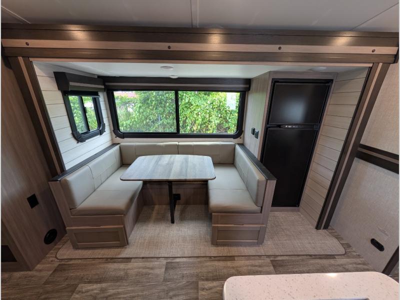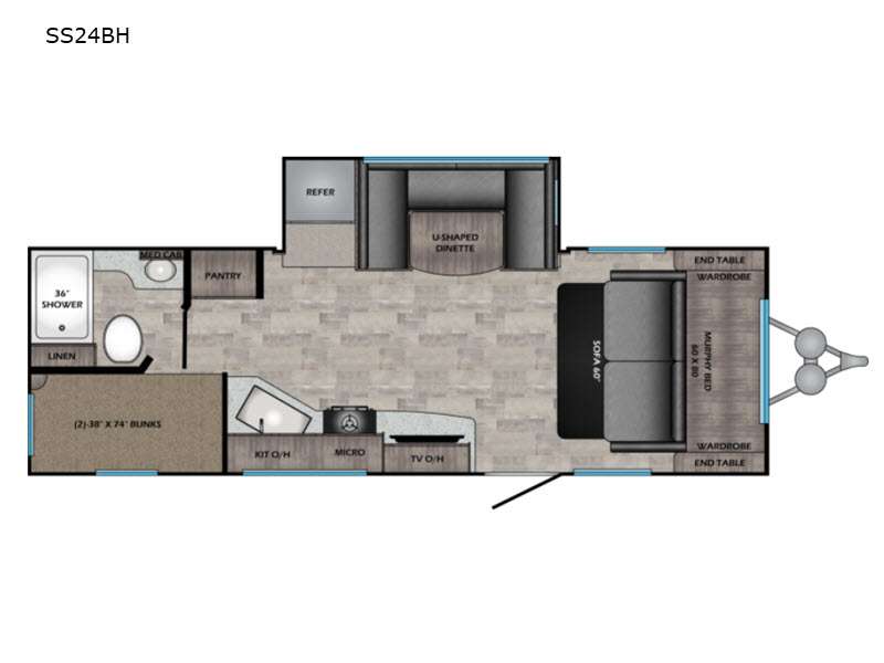 The whole gang can join in on the fun with this travel trailer! It features a rear corner set of 38" x 74" bunk beds for the kiddos and a front 60" x 80" Murphy bed for you, plus the U-shaped dinette can also transform into an extra sleeping space. After a fun-filled day outside, grab a snack from the large pantry and take a quick nap on the front sofa or take a relaxing, hot shower in the rear corner bathroom with a 36" shower and linen closet close by to store your towels!