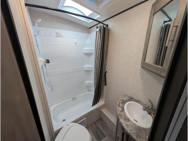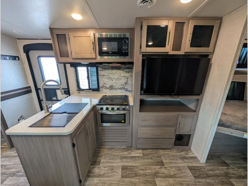 With any Sunset Trail travel trailer by CrossRoads RV, the interior offers a stainless steel farmhouse single bowl sink with a cover, solid surface countertops in the kitchen, a 12 volt refrigerator, USB ports in the bedroom and main area, and a Connexx entertainment TV with soundbar for inside enjoyment. Also included is the Extreme Weather package with maximum insulation with reflective foil, a 30,000 BTU furnace, and a 2" heat duct in the enclosed underbelly for four seasons of traveling. And the Blade Air system offers 20% more airflow and re-engineered components on the A/C. The HyperDeck flooring is water resistant, fiberglass reinforced and has polypropylene layers. Make your lightweight and comfortable RV decision today!
