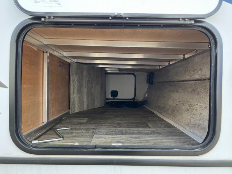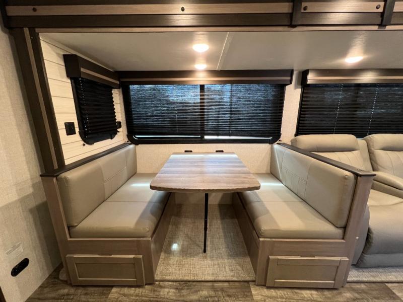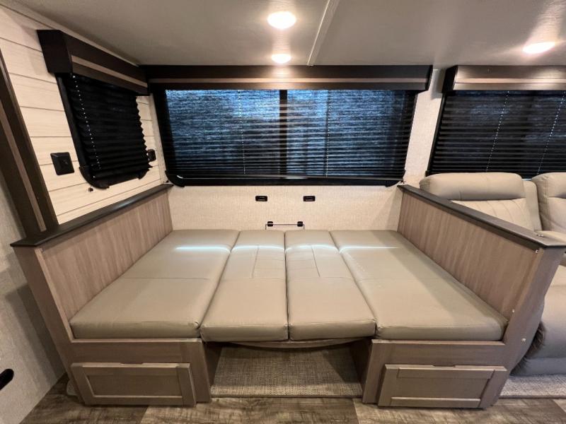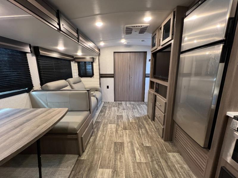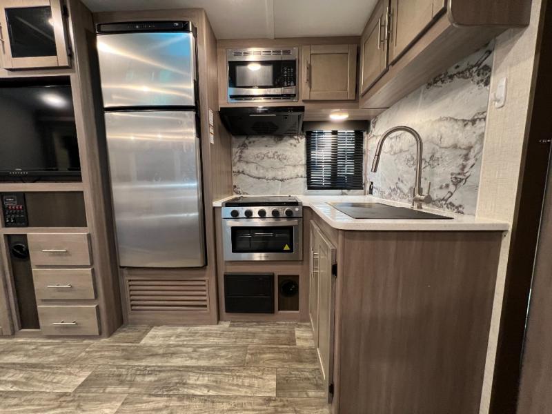 You will love the added interior space you have in this travel trailer thanks to the large slide out in the main living area. Here, you'll enjoy playing cards at the XL booth dinette and relaxing on the tri-fold sofa. Make home-cooked meals on the glass top range or use the exterior camp kitchen. There is even an exterior refrigerator for cold drinks, and the power awning will shade you from the hot summer sun. This model features a full rear bath for added privacy, and the shower skylight will allow natural light in. The front private bedroom includes a king bed, dual wardrobes, plus a shoe storage and pet station for your convenience!