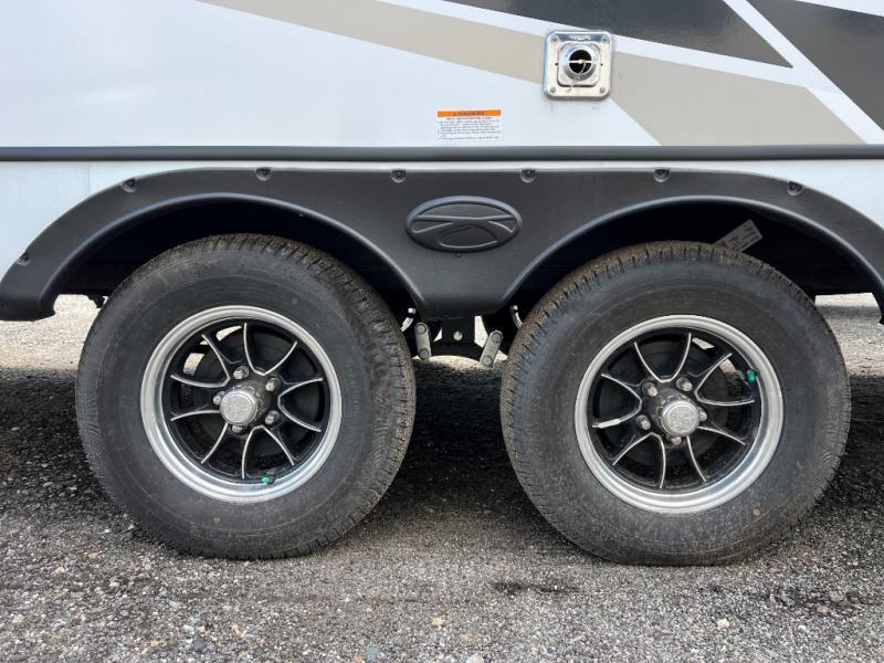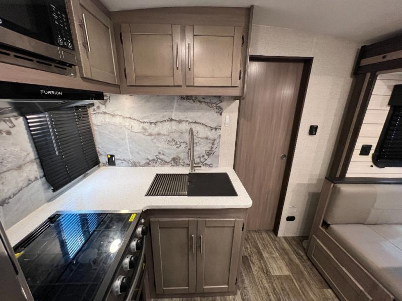 With any Sunset Trail travel trailer by CrossRoads RV, the interior offers a stainless steel farmhouse single bowl sink with a cover, solid surface countertops in the kitchen, a 12 volt refrigerator, USB ports in the bedroom and main area, and a Connexx entertainment TV with soundbar for inside enjoyment. Also included is the Extreme Weather package with maximum insulation with reflective foil, a 30,000 BTU furnace, and a 2" heat duct in the enclosed underbelly for four seasons of traveling. And the Blade Air system offers 20% more airflow and re-engineered components on the A/C. The HyperDeck flooring is water resistant, fiberglass reinforced and has polypropylene layers. Make your lightweight and comfortable RV decision today!
