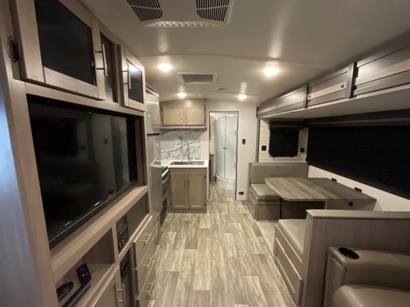 You will love the added interior space you have in this travel trailer thanks to the large slide out in the main living area. Here, you'll enjoy playing cards at the XL booth dinette and relaxing on the tri-fold sofa. Make home-cooked meals on the glass top range or use the exterior camp kitchen. There is even an exterior refrigerator for cold drinks, and the power awning will shade you from the hot summer sun. This model features a full rear bath for added privacy, and the shower skylight will allow natural light in. The front private bedroom includes a king bed, dual wardrobes, plus a shoe storage and pet station for your convenience!