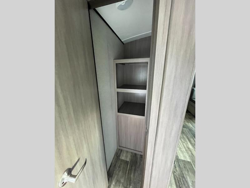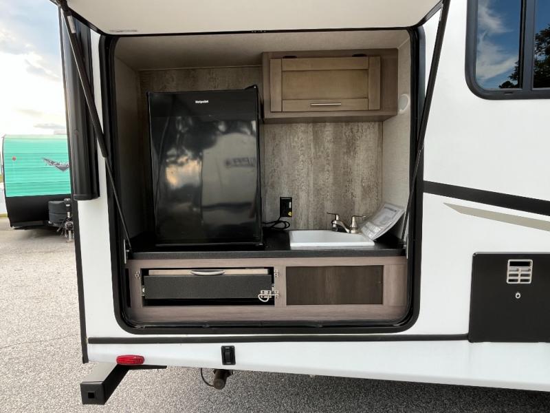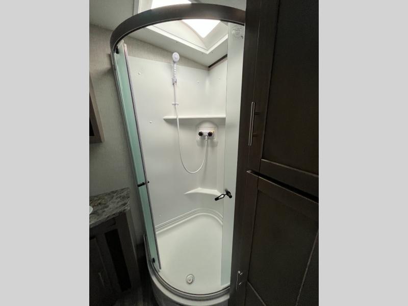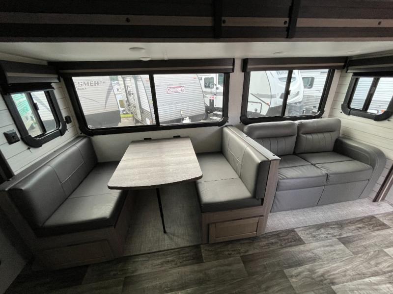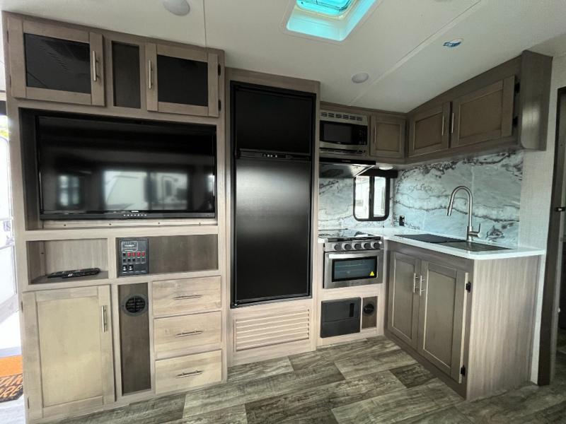 You will love the added interior space you have in this travel trailer thanks to the large slide out in the main living area. Here, you'll enjoy playing cards at the XL booth dinette and relaxing on the tri-fold sofa. Make home-cooked meals on the glass top range or use the exterior camp kitchen. There is even an exterior refrigerator for cold drinks, and the power awning will shade you from the hot summer sun. This model features a full rear bath for added privacy, and the shower skylight will allow natural light in. The front private bedroom includes a king bed, dual wardrobes, plus a shoe storage and pet station for your convenience!