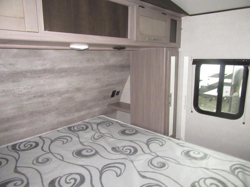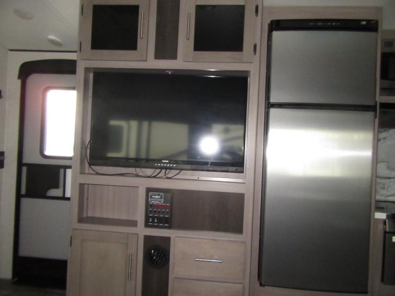 You will love the added interior space you have in this travel trailer thanks to the large slide out in the main living area. Here, you'll enjoy playing cards at the XL booth dinette and relaxing on the tri-fold sofa. Make home-cooked meals on the glass top range or use the exterior camp kitchen. There is even an exterior refrigerator for cold drinks, and the power awning will shade you from the hot summer sun. This model features a full rear bath for added privacy, and the shower skylight will allow natural light in. The front private bedroom includes a king bed, dual wardrobes, plus a shoe storage and pet station for your convenience!