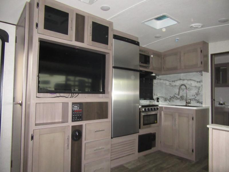 With any Sunset Trail travel trailer by CrossRoads RV, the interior offers a stainless steel farmhouse single bowl sink with a cover, solid surface countertops in the kitchen, a 12 volt refrigerator, USB ports in the bedroom and main area, and a Connexx entertainment TV with soundbar for inside enjoyment. Also included is the Extreme Weather package with maximum insulation with reflective foil, a 30,000 BTU furnace, and a 2" heat duct in the enclosed underbelly for four seasons of traveling. And the Blade Air system offers 20% more airflow and re-engineered components on the A/C. The HyperDeck flooring is water resistant, fiberglass reinforced and has polypropylene layers. Make your lightweight and comfortable RV decision today!