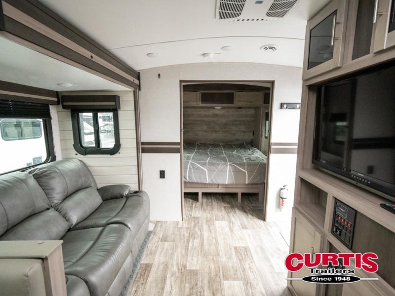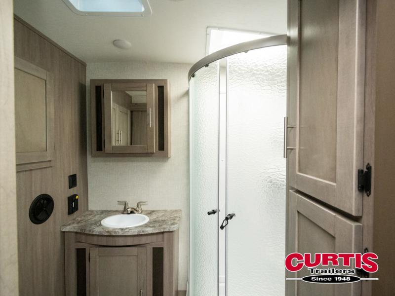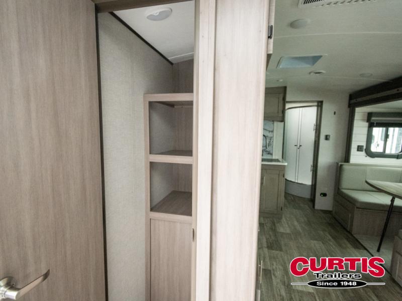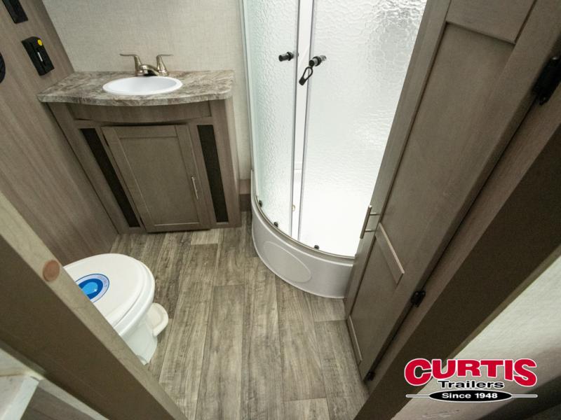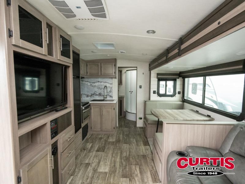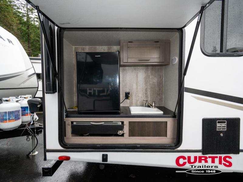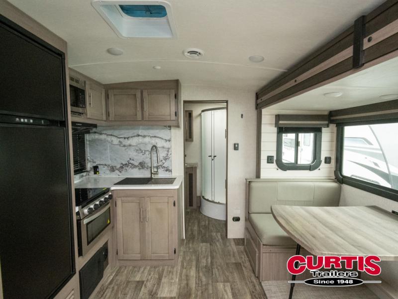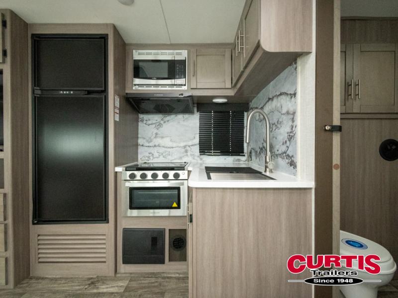 You will love the added interior space you have in this travel trailer thanks to the large slide out in the main living area. Here, you'll enjoy playing cards at the XL booth dinette and relaxing on the tri-fold sofa. Make home-cooked meals on the glass top range or use the exterior camp kitchen. There is even an exterior refrigerator for cold drinks, and the power awning will shade you from the hot summer sun. This model features a full rear bath for added privacy, and the shower skylight will allow natural light in. The front private bedroom includes a king bed, dual wardrobes, plus a shoe storage and pet station for your convenience!