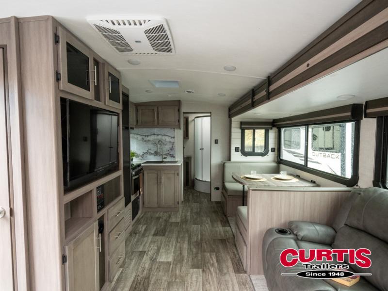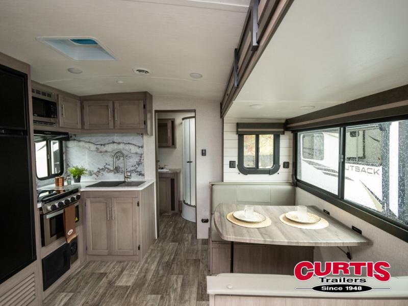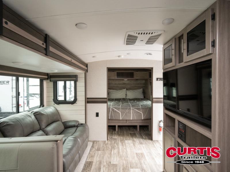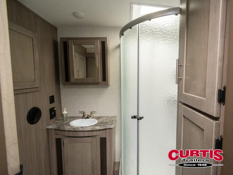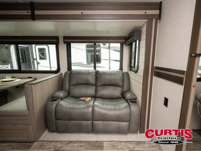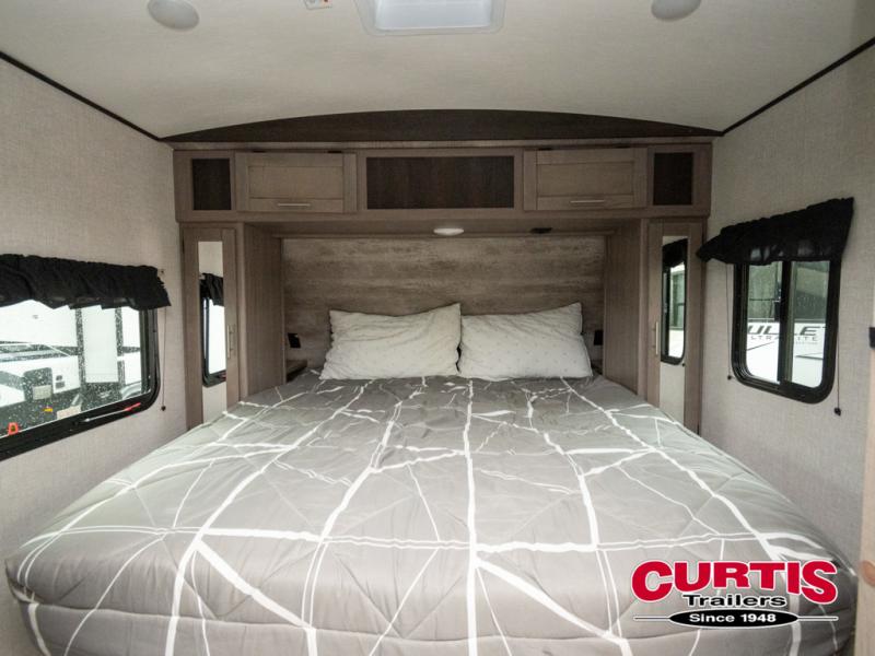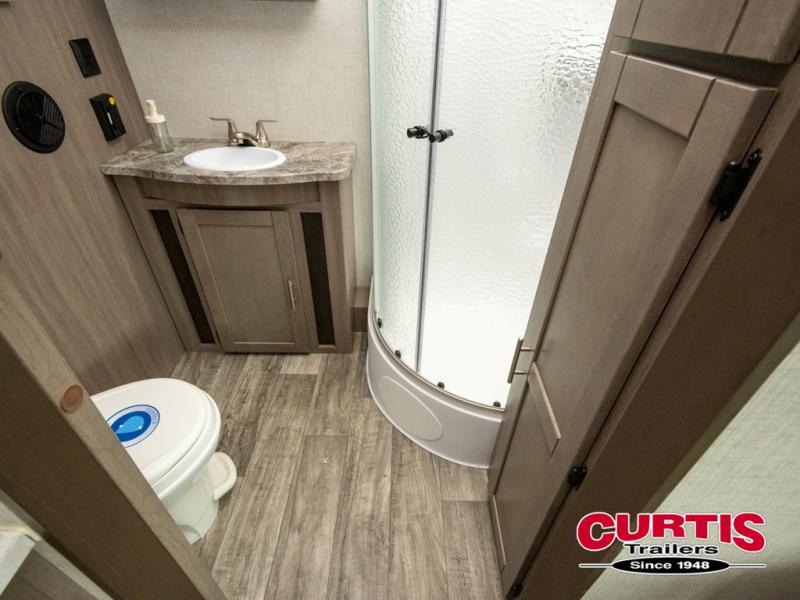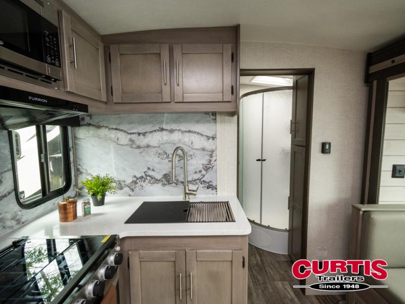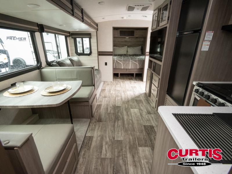 You will love the added interior space you have in this travel trailer thanks to the large slide out in the main living area. Here, you'll enjoy playing cards at the XL booth dinette and relaxing on the tri-fold sofa. Make home-cooked meals on the glass top range or use the exterior camp kitchen. There is even an exterior refrigerator for cold drinks, and the power awning will shade you from the hot summer sun. This model features a full rear bath for added privacy, and the shower skylight will allow natural light in. The front private bedroom includes a king bed, dual wardrobes, plus a shoe storage and pet station for your convenience!