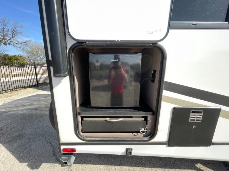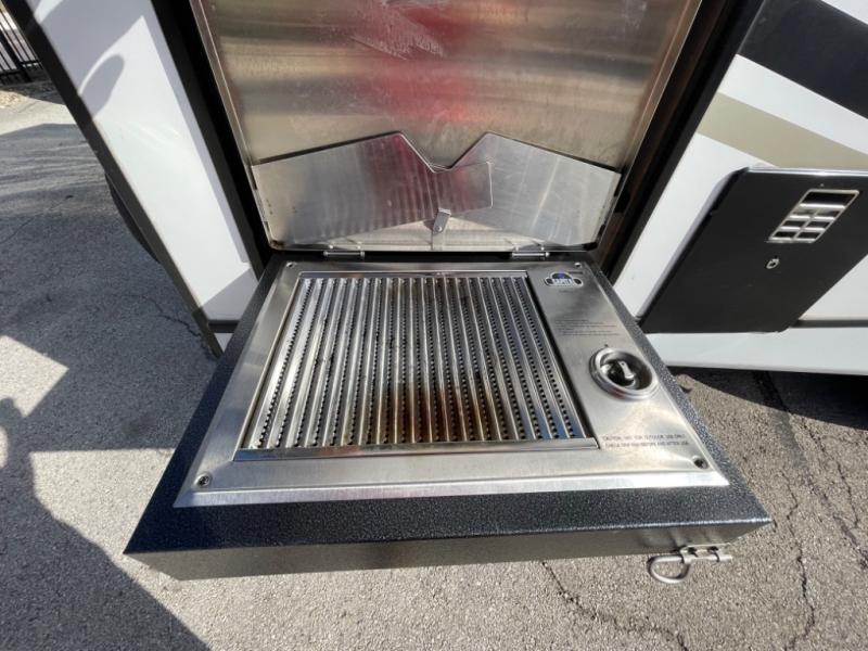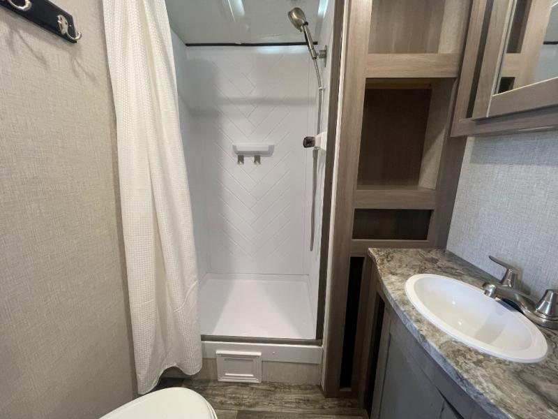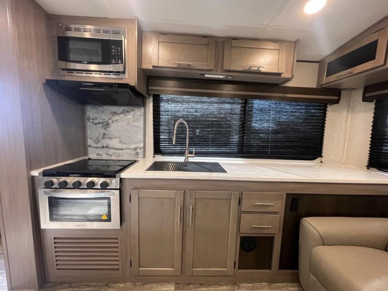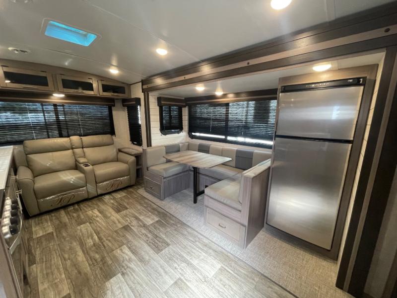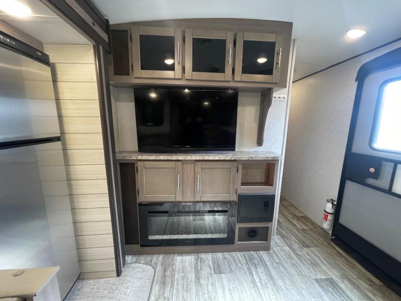 Eat, sleep, relax, and play in this travel trailer that can sleep four people each night. You can dine around the U-shaped dinette and this area can also convert to comfortable sleeping space for the grandkids at night. You will enjoy the 60" theater seating that sits directly across from the entertainment center and fireplace for convenience. The chef of the family can prepare meals on the glass top range or use the stainless steel microwave. This model includes a full bath with a 30" x 36" shower, plus the skylight will provide natural light as you get ready for the day. You will feel right at home in the front private bedroom that includes wardrobes on either side of the king bed, a closet with a wardrobe, plus a pet station for Fluffy!