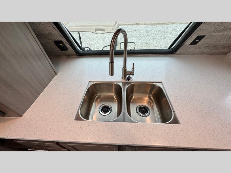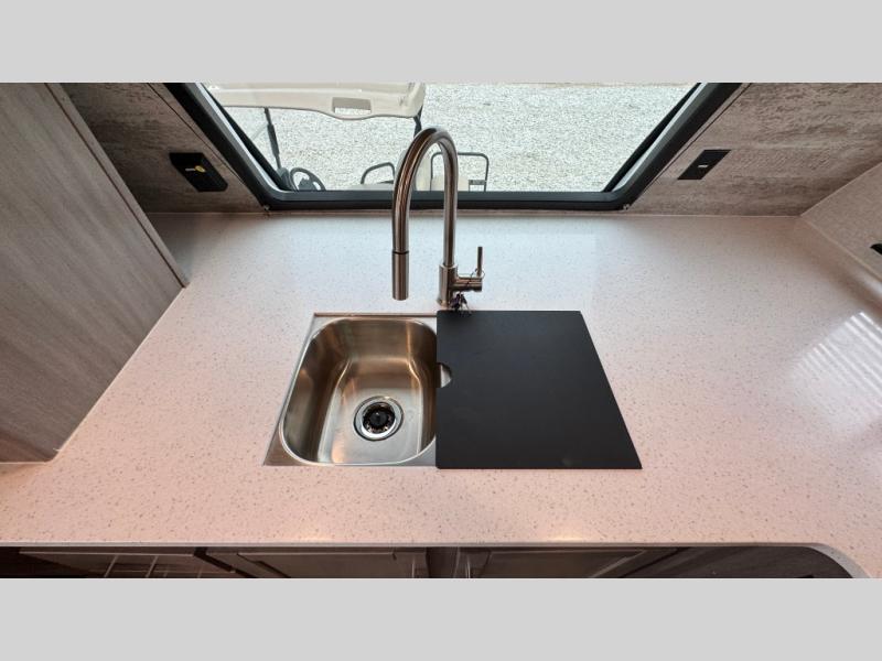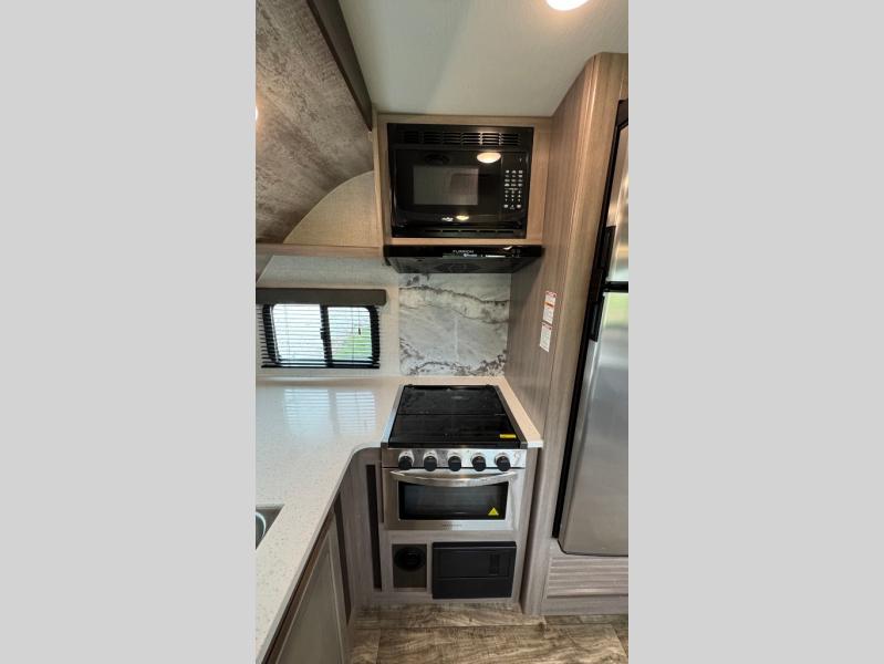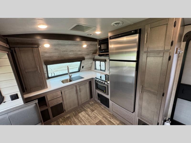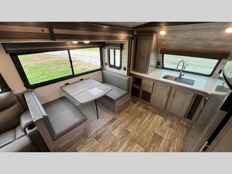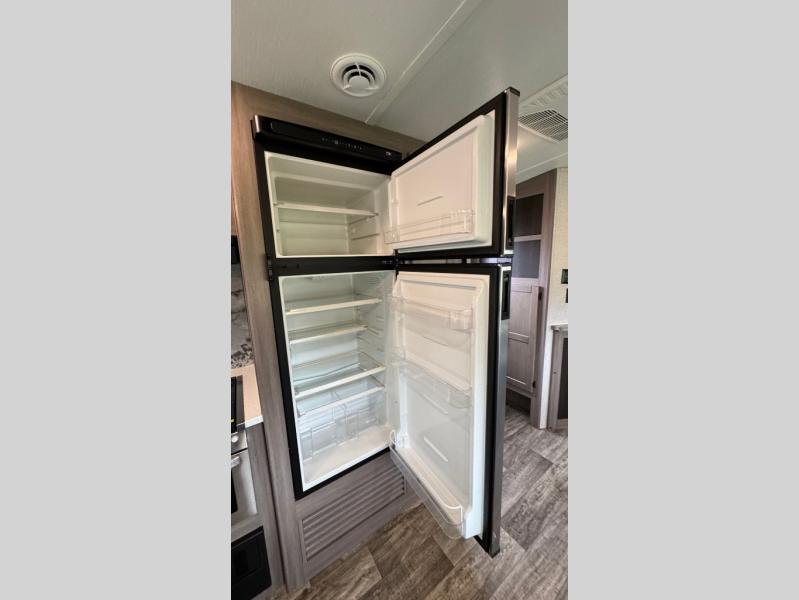 With any Sunset Trail travel trailer by CrossRoads RV, the interior offers a stainless steel farmhouse single bowl sink with a cover, solid surface countertops in the kitchen, a 12 volt refrigerator, USB ports in the bedroom and main area, and a Connexx entertainment TV with soundbar for inside enjoyment. Also included is the Extreme Weather package with maximum insulation with reflective foil, a 30,000 BTU furnace, and a 2" heat duct in the enclosed underbelly for four seasons of traveling. And the Blade Air system offers 20% more airflow and re-engineered components on the A/C. The HyperDeck flooring is water resistant, fiberglass reinforced and has polypropylene layers. Make your lightweight and comfortable RV decision today!
