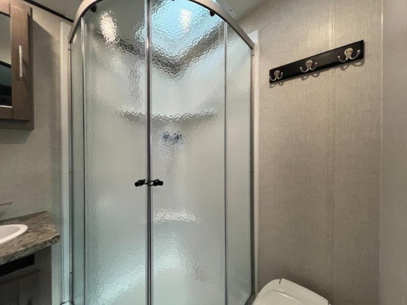 You will love this trailer for many reasons beginning with having dual entry for easy access to the spacious rear bedroom or the main living and kitchen area. The cook will love the front kitchen with lots of counter space, a window to enjoy the view and all the kitchen amenities to make warm meals for the two of you plus anyone that visits. The slide out sofa and booth dinette offer sleeping space for the grandkids on top of relaxation inside when you aren't outside under the electric awning with LED strip. You will have a full bathroom to get cleaned up after a fun day outside, and a rear master bedroom with a king bed slide out, storage and a rear window for more great views!