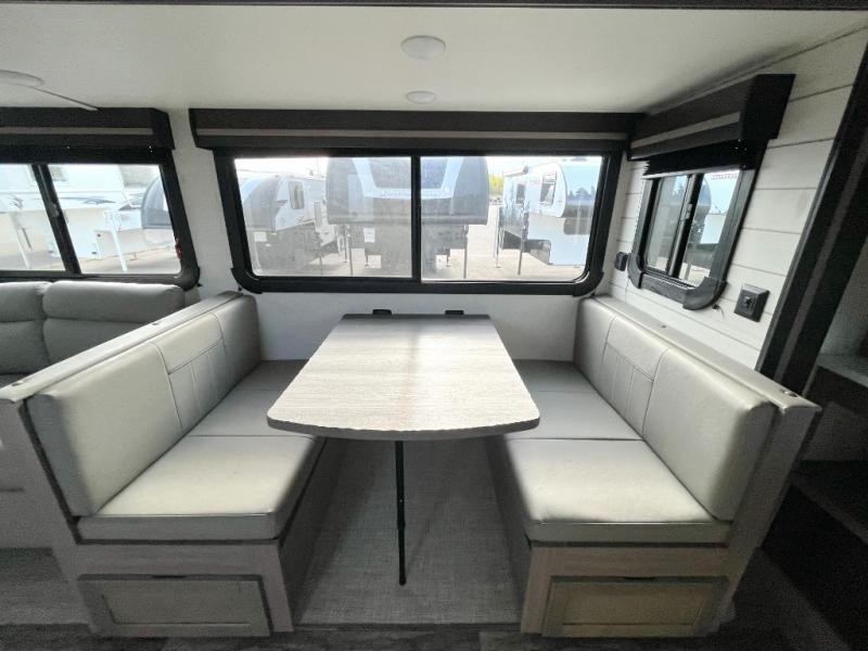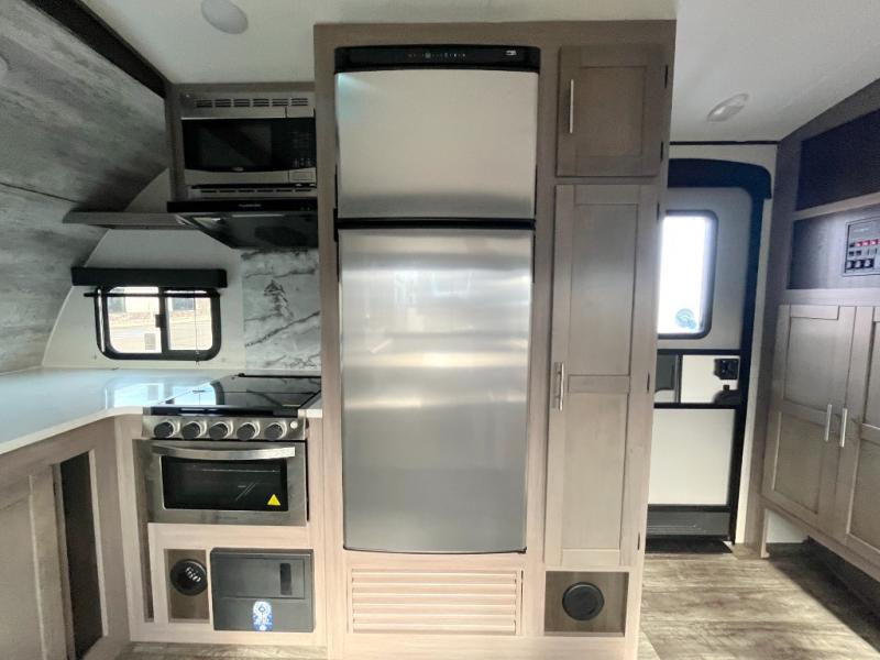 With any Sunset Trail travel trailer by CrossRoads RV, the interior offers a stainless steel farmhouse single bowl sink with a cover, solid surface countertops in the kitchen, a 12 volt refrigerator, USB ports in the bedroom and main area, and a Connexx entertainment TV with soundbar for inside enjoyment. Also included is the Extreme Weather package with maximum insulation with reflective foil, a 30,000 BTU furnace, and a 2" heat duct in the enclosed underbelly for four seasons of traveling. And the Blade Air system offers 20% more airflow and re-engineered components on the A/C. The HyperDeck flooring is water resistant, fiberglass reinforced and has polypropylene layers. Make your lightweight and comfortable RV decision today!