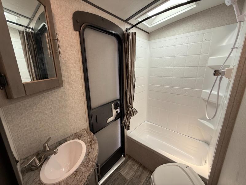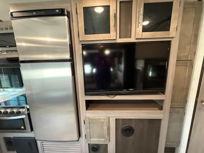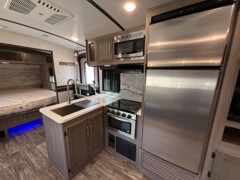 With any Sunset Trail travel trailer by CrossRoads RV, the interior offers a stainless steel farmhouse single bowl sink with a cover, solid surface countertops in the kitchen, a 12 volt refrigerator, USB ports in the bedroom and main area, and a Connexx entertainment TV with soundbar for inside enjoyment. Also included is the Extreme Weather package with maximum insulation with reflective foil, a 30,000 BTU furnace, and a 2" heat duct in the enclosed underbelly for four seasons of traveling. And the Blade Air system offers 20% more airflow and re-engineered components on the A/C. The HyperDeck flooring is water resistant, fiberglass reinforced and has polypropylene layers. Make your lightweight and comfortable RV decision today!