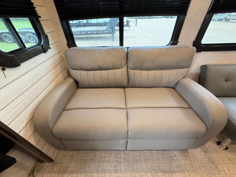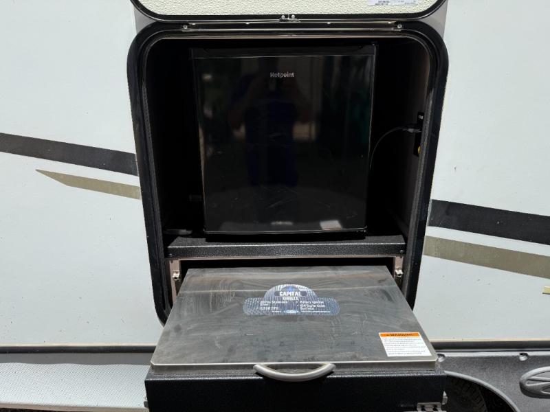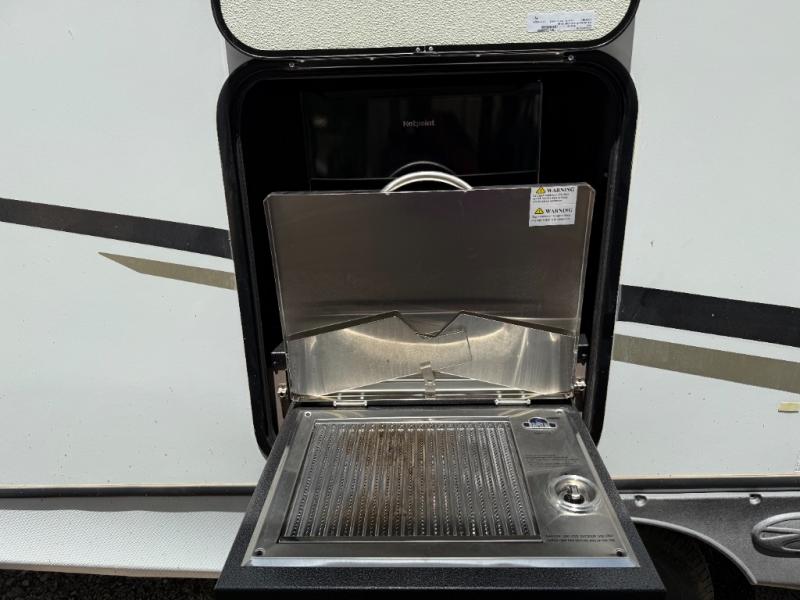 This travel trailer can comfortably sleep ten people each night, so invite the cousins for whole-family fun! The kids are sure to love the double-size bunks, and the owners will have their own private bedroom up front with a king bed. Within the large slide out you'll find the XL booth dinette which can sleep two, plus the tri-fold sofa that can be replaced by an optional theater seating if you choose. Whip up dinner in a flash on the glass top range or use the exterior camp kitchen. The full bath includes its own exterior entrance door for convenience, and there is a power awning with LED lights for the perfect outdoor living space!