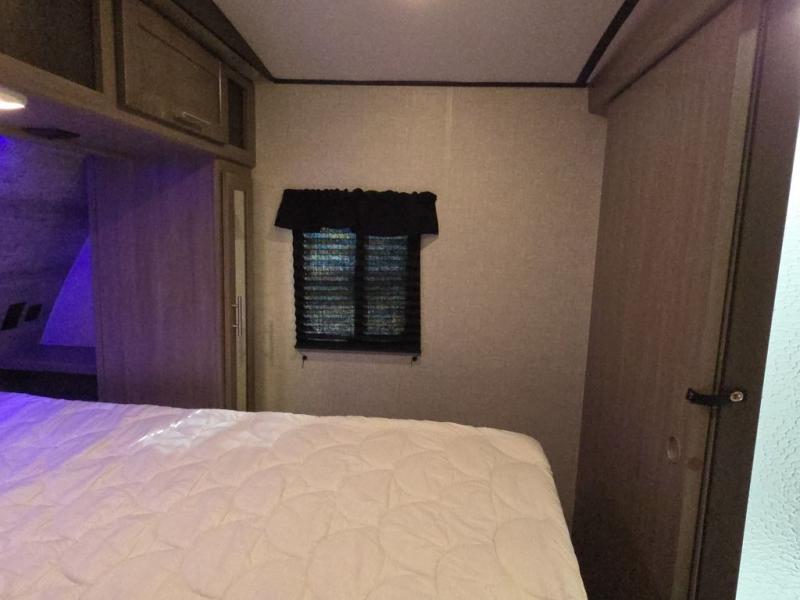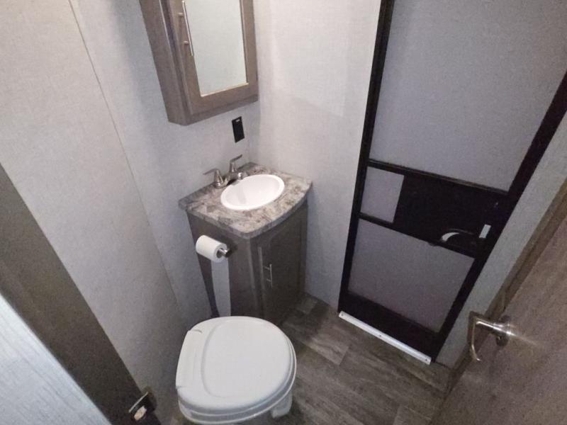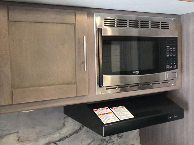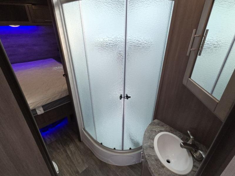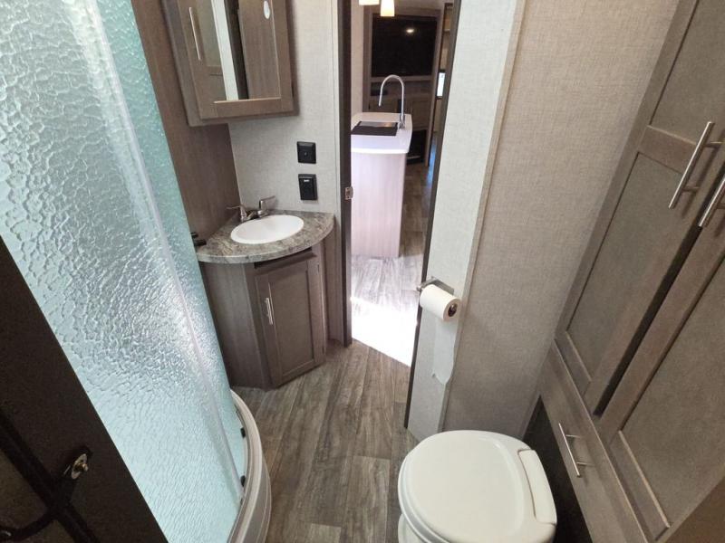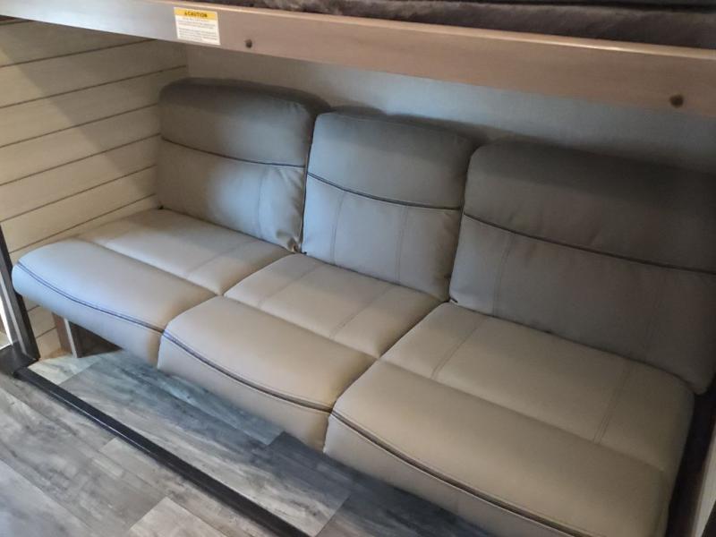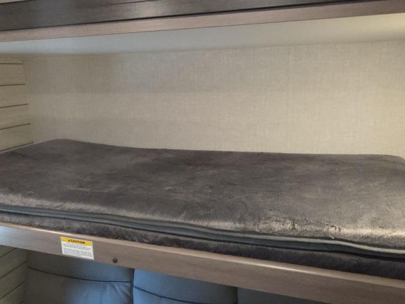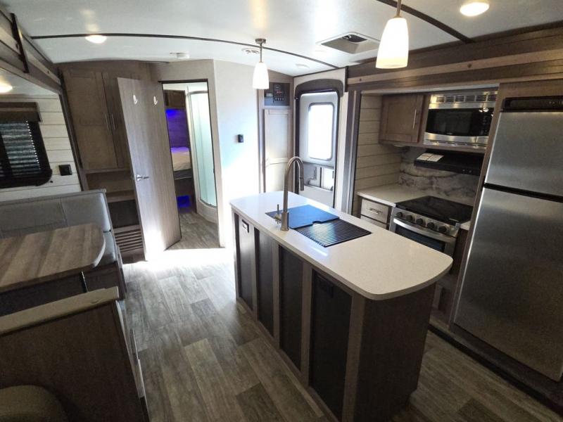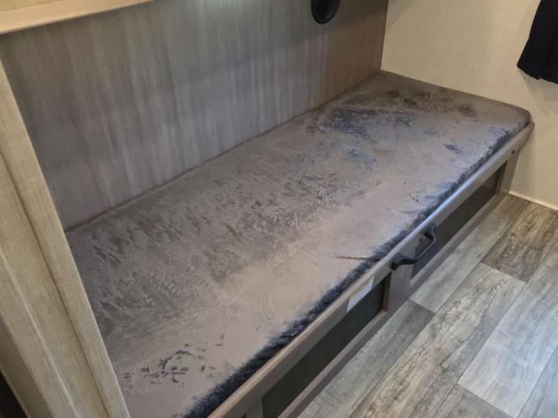 This travel trailer is packed with convenient features and luxury comforts for a camping trip you won't soon forget. Once you arrive at the campground, put out the electric awning and make a quick lunch on the exterior camp kitchen. The kitchen island inside will be the perfect place to cut up all the fixings for the burgers and you can grab the chips from the pantry. The kids will love the private bunkhouse that includes two bunks, a jackknife sofa with a kick, plus a dual entry half bath for convenience. The full walk-through bath will create a front master bedroom you are sure to love. Here, the king bed will provide a great night's rest and there are dual wardrobes for all your clothes. Plus there is a convenient shoe storage and pet station for your trusted loyal friends!
