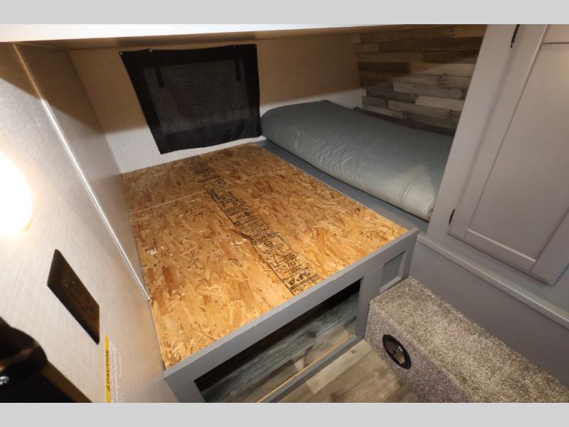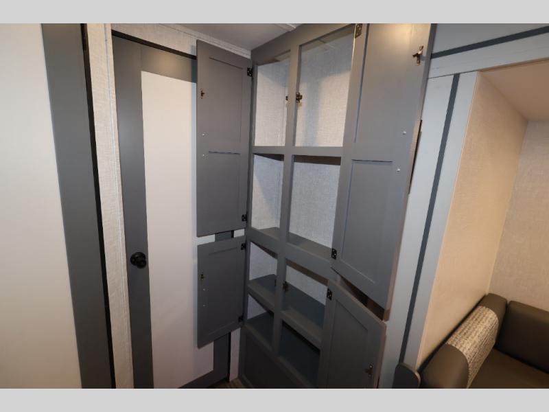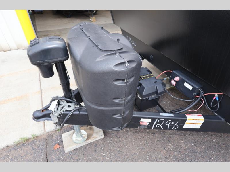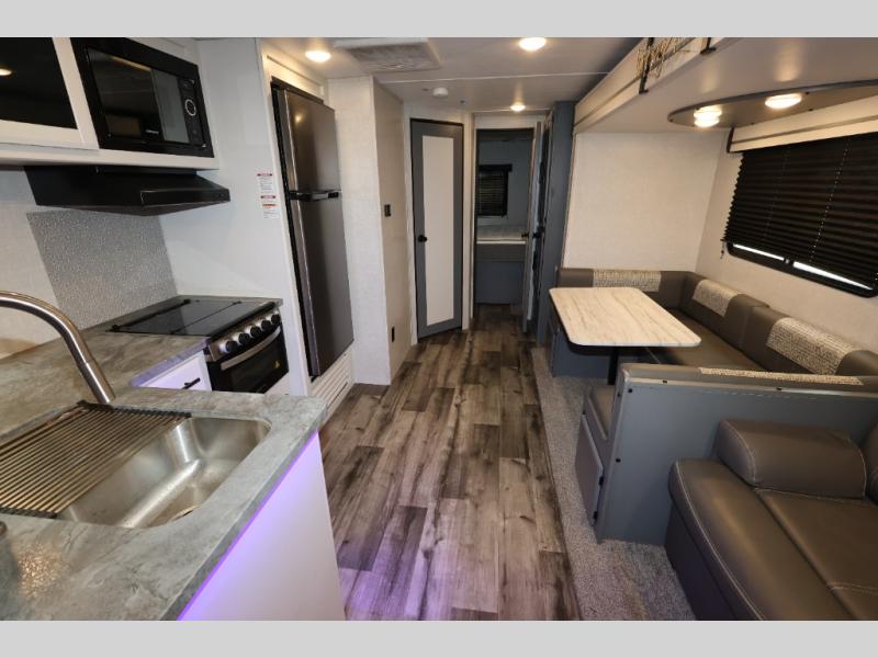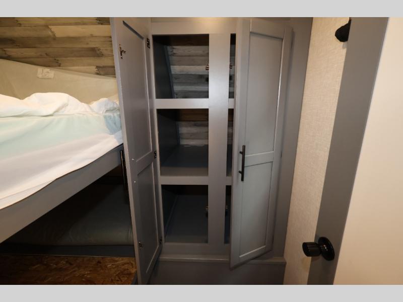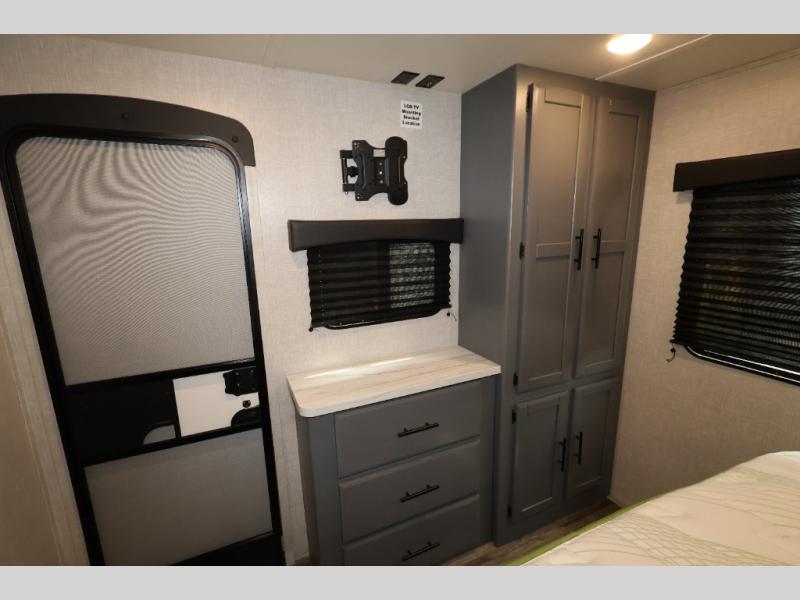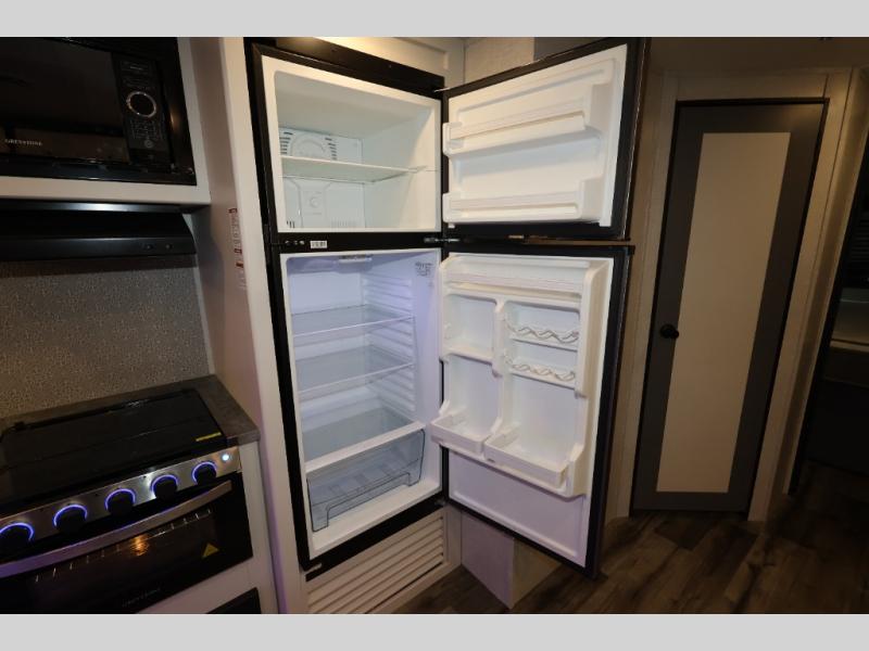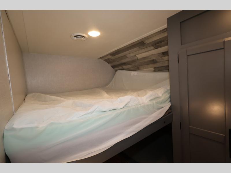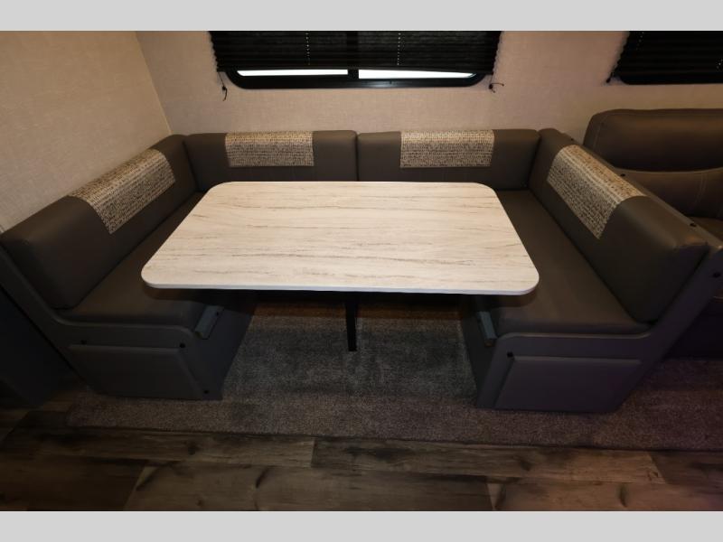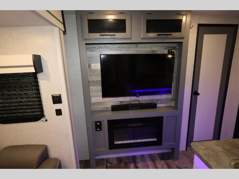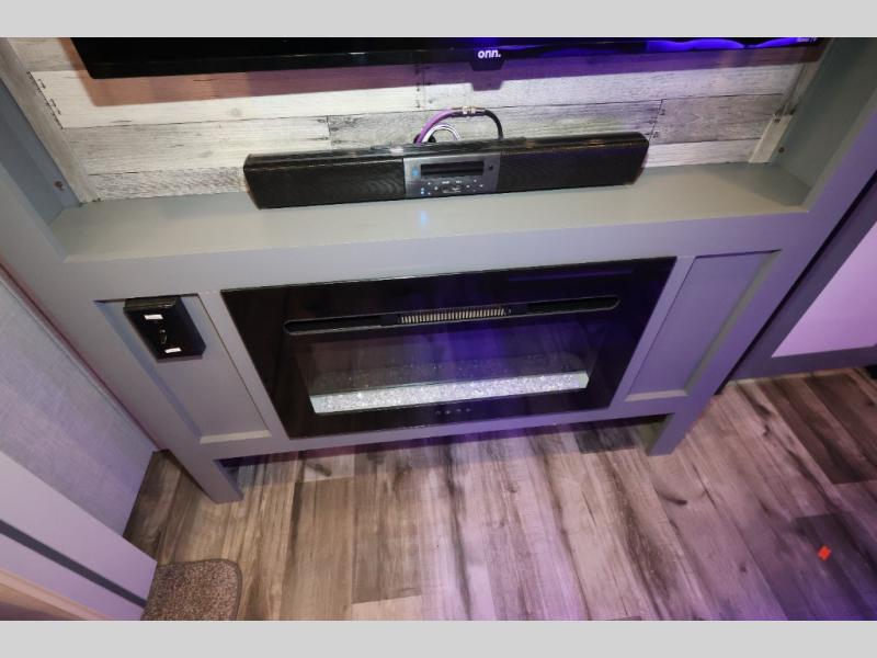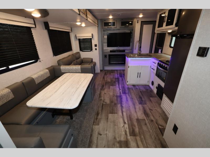 Load up and head out to your favorite state park in this dual entry travel trailer. The double slides will provide additional interior space, and the ten person sleeping capacity allows you to make this a whole-family trip! Once you arrive at your destination, prepare a quick lunch on the outside cooktop under the power awning. You'll also find indoor appliances to make meals when the weather isn't cooperating. Take a load off on the jackknife sofa or play a game of cards around the U-shaped dinette, and the fireplace will provide a more at-home feel. This model includes a rear master bedroom with its own exterior entrance, and up front you'll find queen-size bunks that will be perfect for the kids or your guests!