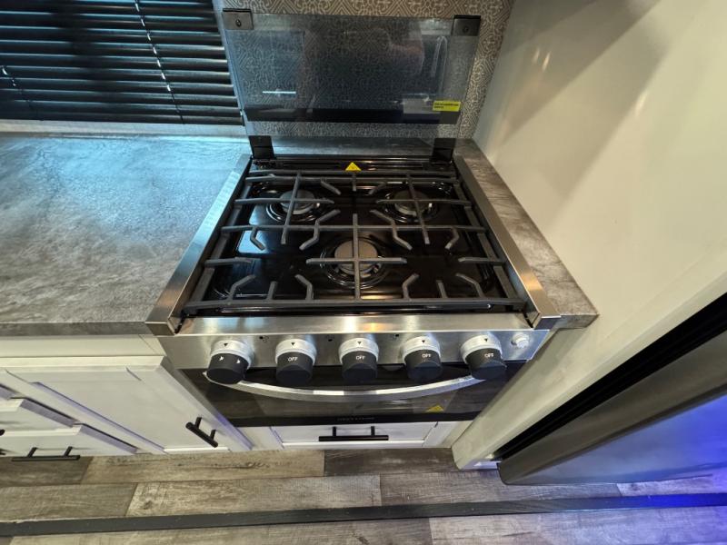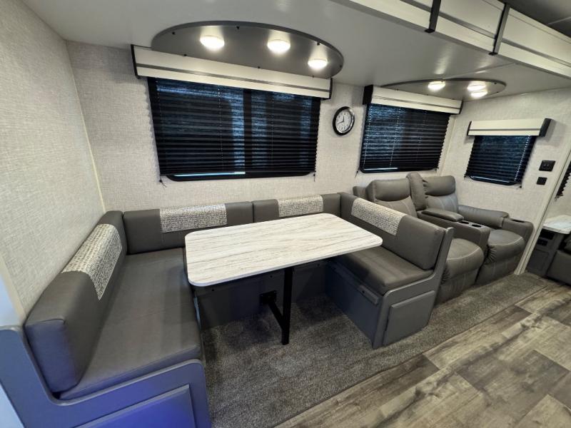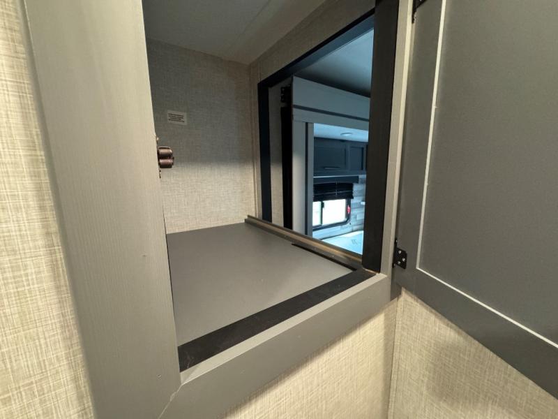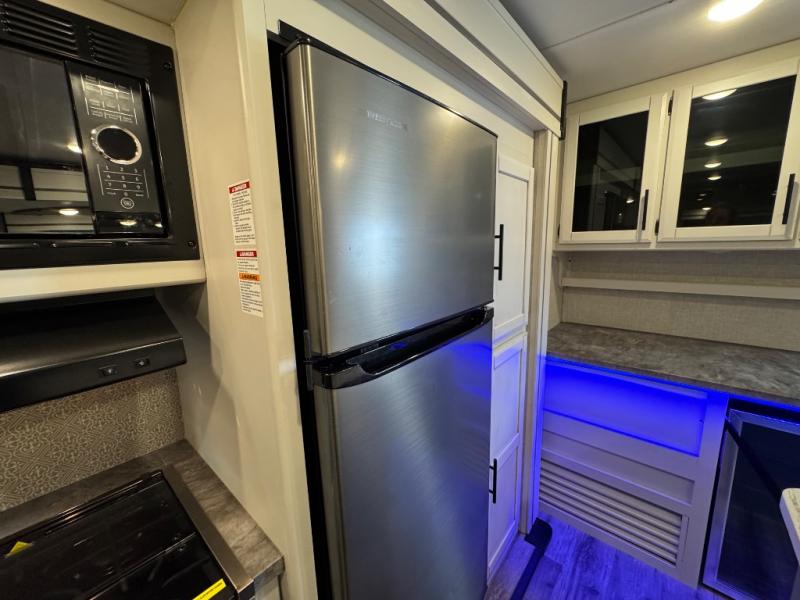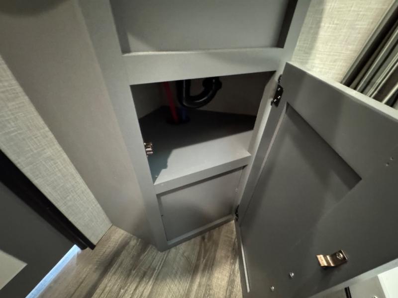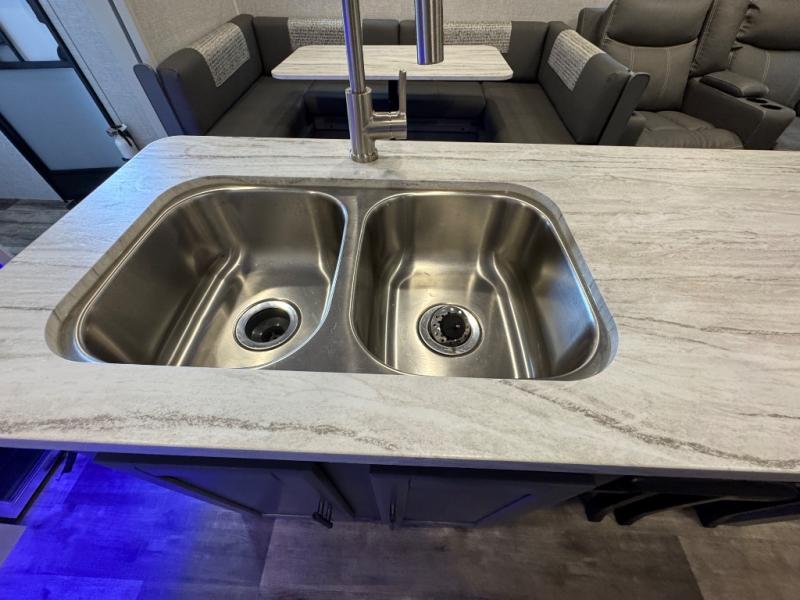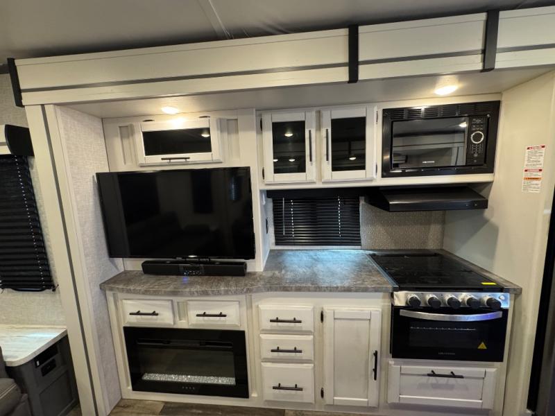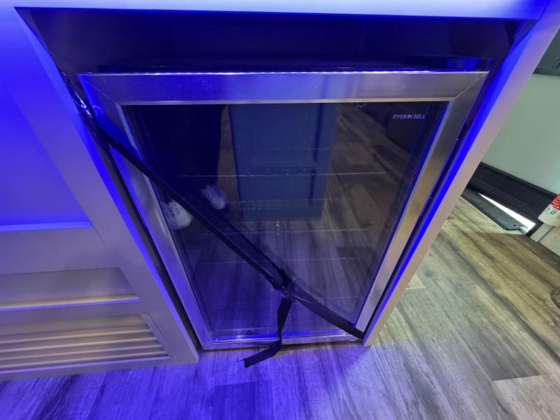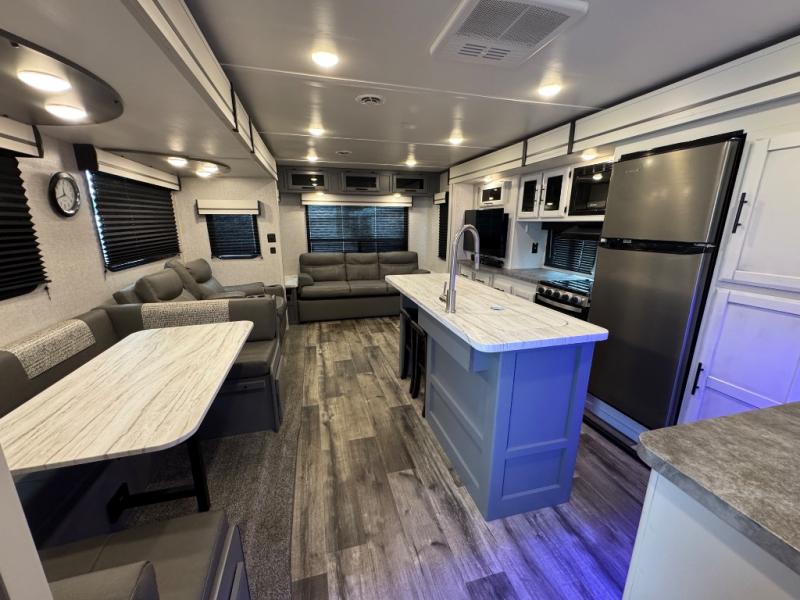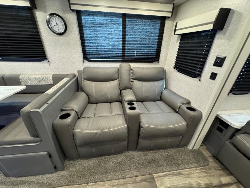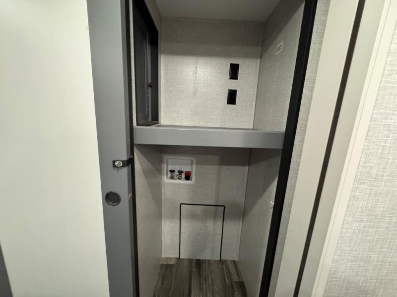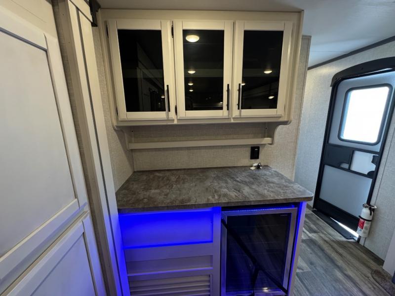Whether you're relaxing on the theater seats, preparing a meal at the kitchen island, or taking a rest on the slide out king bed, you will enjoy every minute spent in this travel trailer. Your guests will love to sit at the stools around the kitchen island, or they can play a game around the U-shaped dinette. This model includes a hutch with a wine cooler to serve your guests, and the pantry can store snacks for everyone. When it's time to call it a night, the front private bedroom will feel just like home with its king bed and a large front wardrobe. There is even a space that has been prepped to add an optional washer and dryer if you choose!