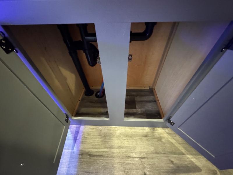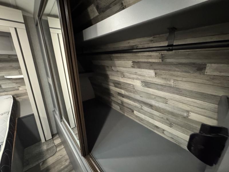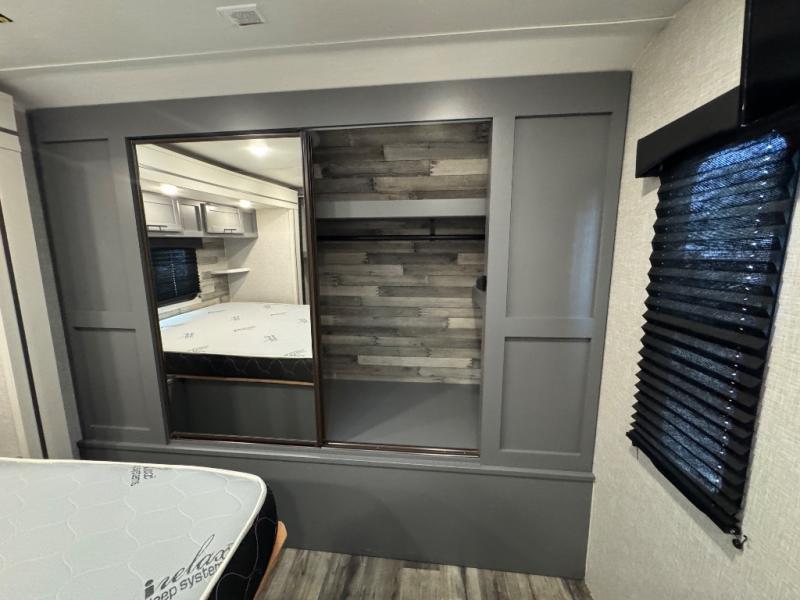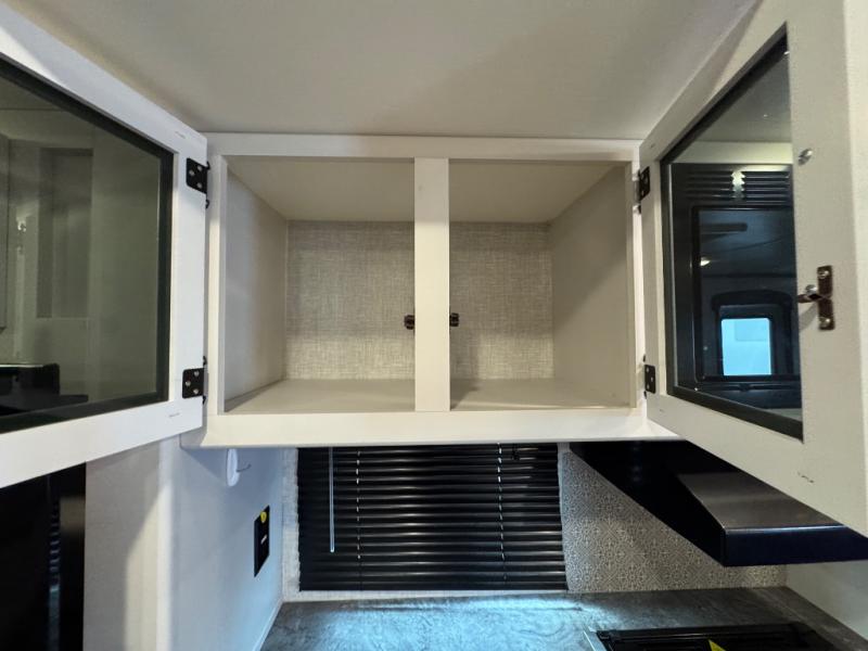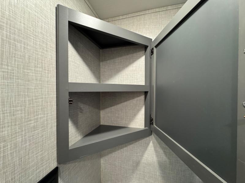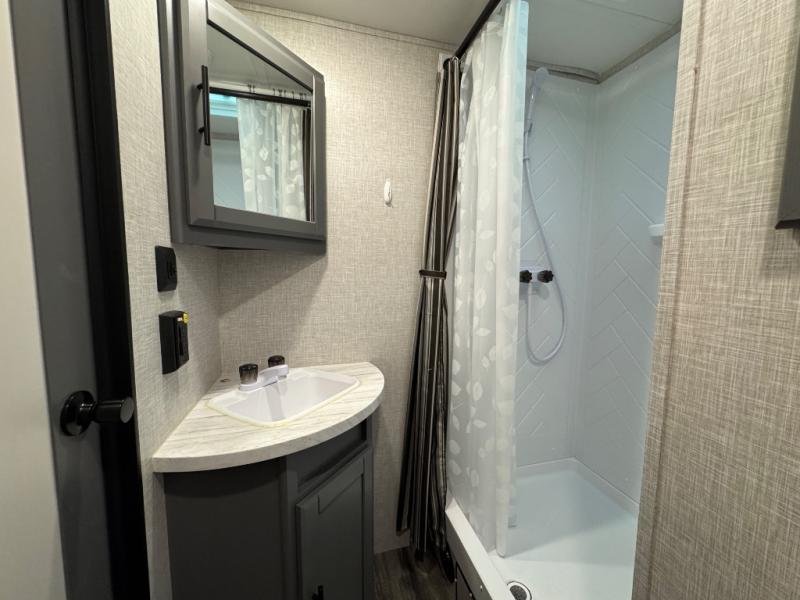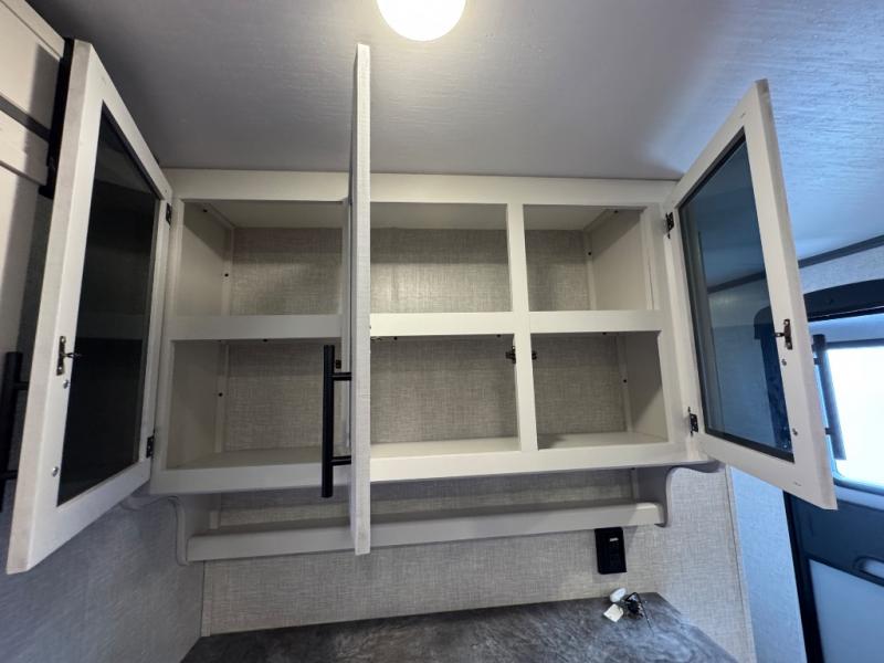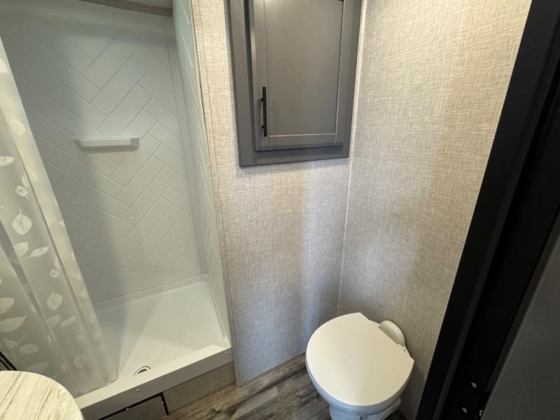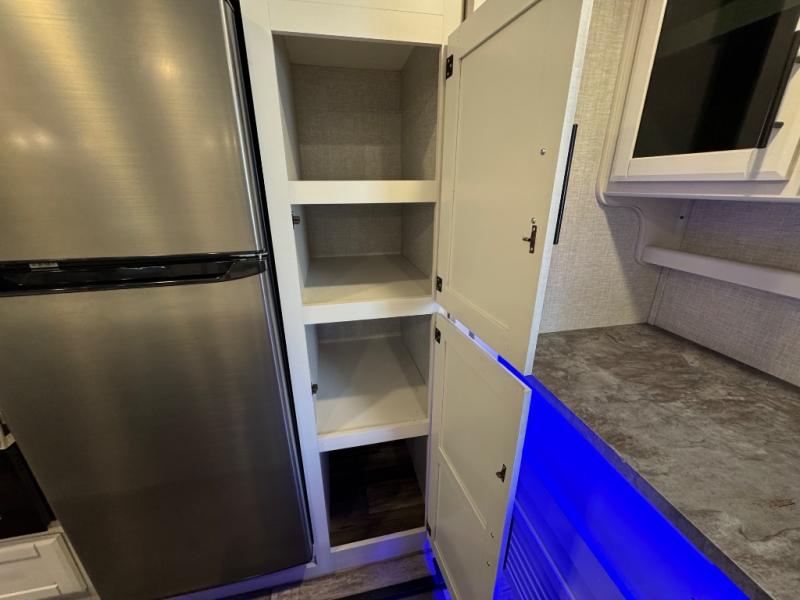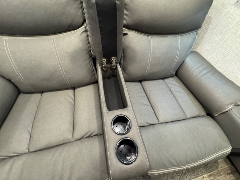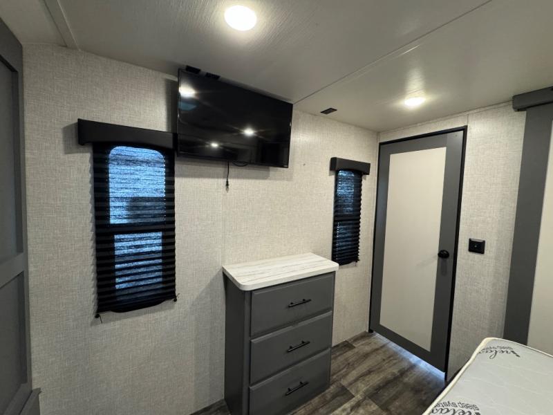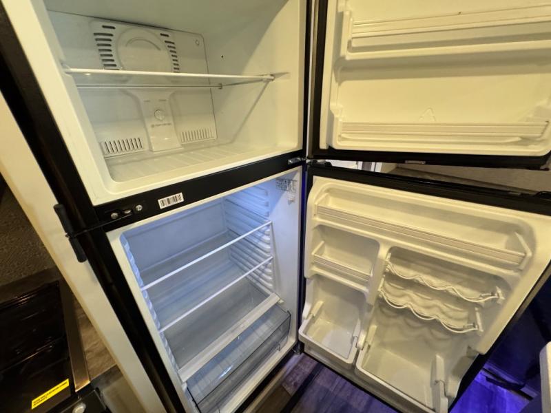 Whether you're relaxing on the theater seats, preparing a meal at the kitchen island, or taking a rest on the slide out king bed, you will enjoy every minute spent in this travel trailer. Your guests will love to sit at the stools around the kitchen island, or they can play a game around the U-shaped dinette. This model includes a hutch with a wine cooler to serve your guests, and the pantry can store snacks for everyone. When it's time to call it a night, the front private bedroom will feel just like home with its king bed and a large front wardrobe. There is even a space that has been prepped to add an optional washer and dryer if you choose!
