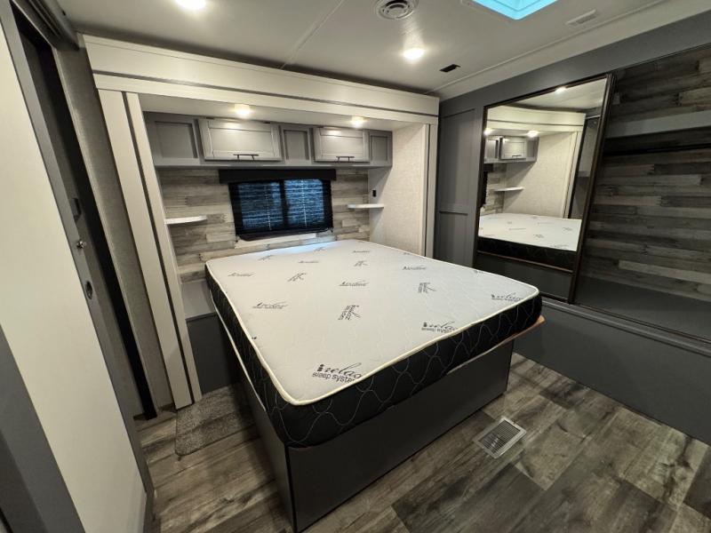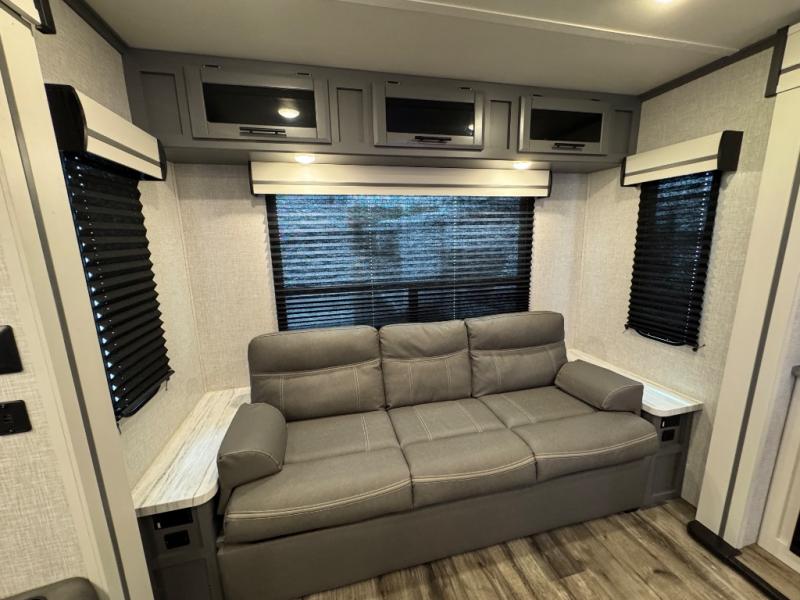 Each Volante fifth wheel or travel trailer by CrossRoads RV includes features and options that will enhance your camping experience. The fiberglass front cap is sure to be eye-catching, and you can plan to camp year around with the fully enclosed and forced air heated underbelly. There is also an outside shower, an electric awning with LED lights, outdoor speakers with LED accents, plus many more exterior conveniences. The interior of each Volante will have you feeling right at home with premium residential furniture, coordinating window treatments in the bedroom, nightstands with outlets in the bedroom, plus USB ports to keep your electronics charged. You will also appreciate a 13,500 BTU A/C, plus solar power prep and WiFi prep if you need to get some work done while you're away from home.