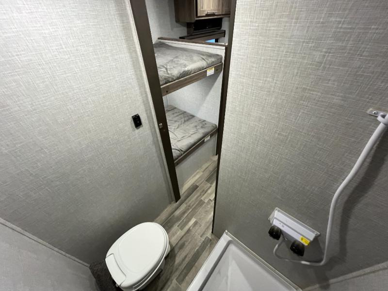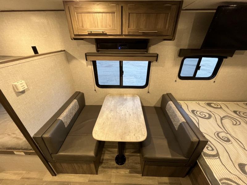 This Zinger Lite travel trailer is perfect for your next family vacation or weekend at the lake with friends. With room for five, this unit gives you the space you need to pack up the kids and the dog and get ready to hit the road! With an RV queen bed and bunk beds, everyone will have a place to sleep. The 38" booth dinette can comfortably hold one to two little ones or an adult guest. Use the oven with an LED glass top to make a home-cooked meal and easily store your dry goods in the maple cabinet drawers. Enjoy extra privacy with a rear corner bath that includes a 36" tub. This unit features multiple overhead compartments, so bring along the board games and other valuables from home.