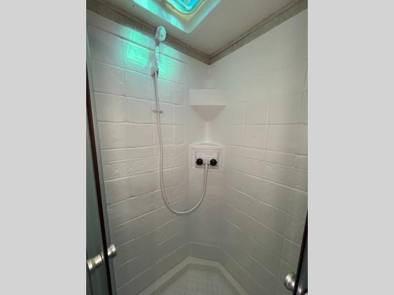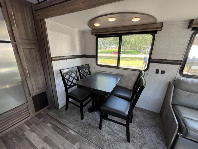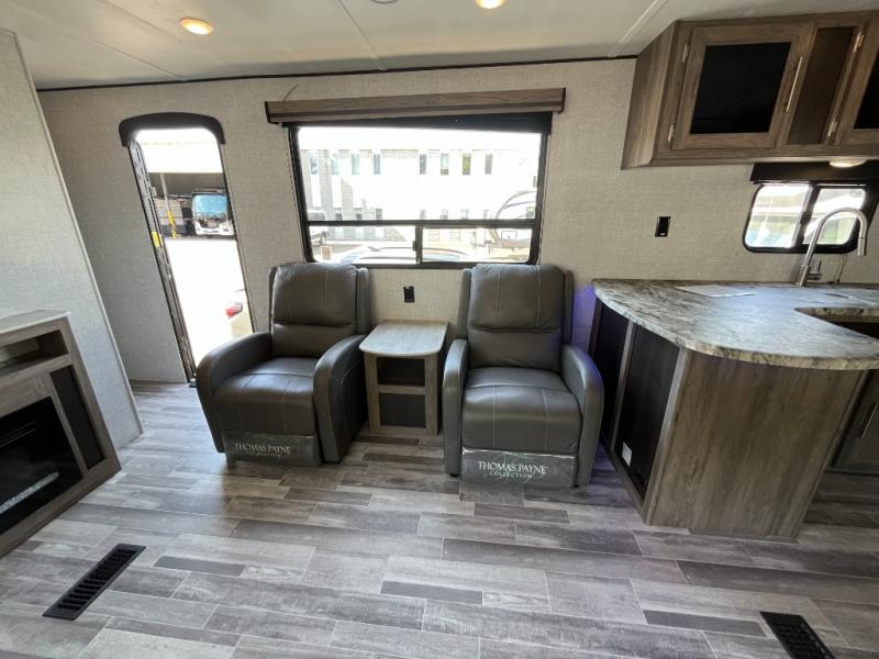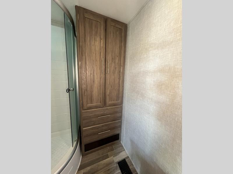 The chef of your group will love cooking in this rear kitchen travel trailer! It not only features a 10-cu. ft. refrigerator, an oven with an LED glass top, and a pressed countertop with a sink cover, but also a stainless steel sink with a stainless steel high-rise faucet and lots of counter space to prep your meals. While the chef is preparing dinner, you can socialize at the U-shaped dinette or 60" jackknife sofa slide while two others sit in the chairs with an end table in between to set a cup of coffee. There is even an outside kitchen, so you can take the fun outdoors while still cooking dinner. The full bathroom has a 34" radius shower with a linen closet next to it for you to grab a towel without dripping water all over the place. Head to the front private bedroom and grab your pajamas from one of the two shirt closets or even from the overhead cabinets above the 60" x 74" RV queen bed!
