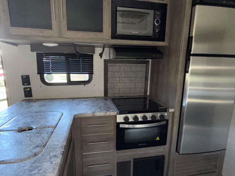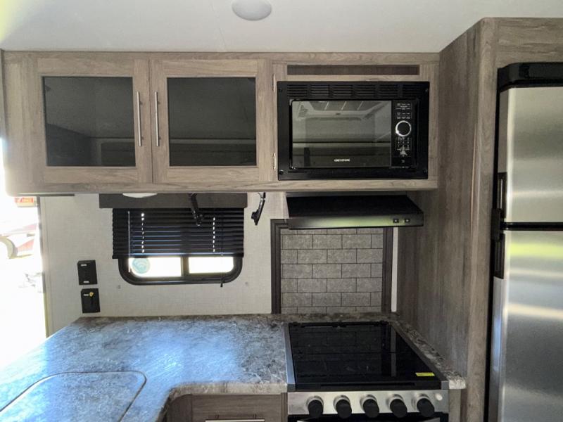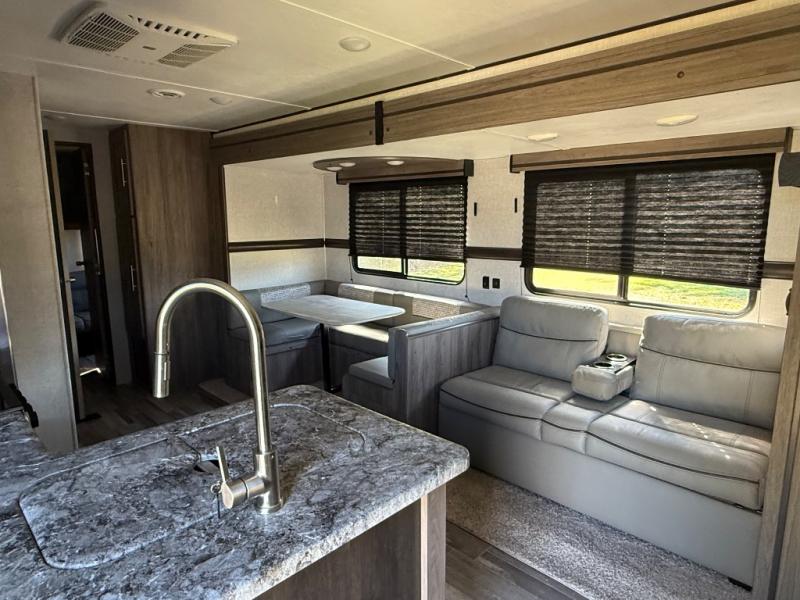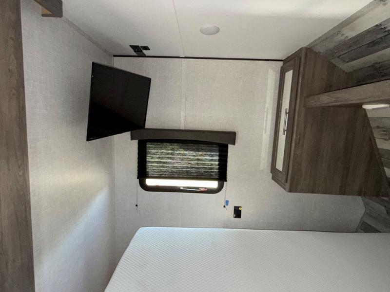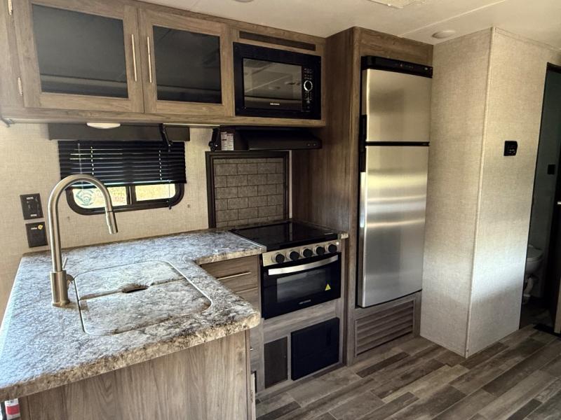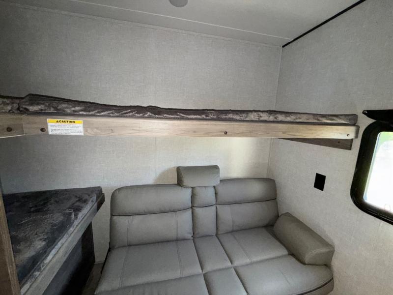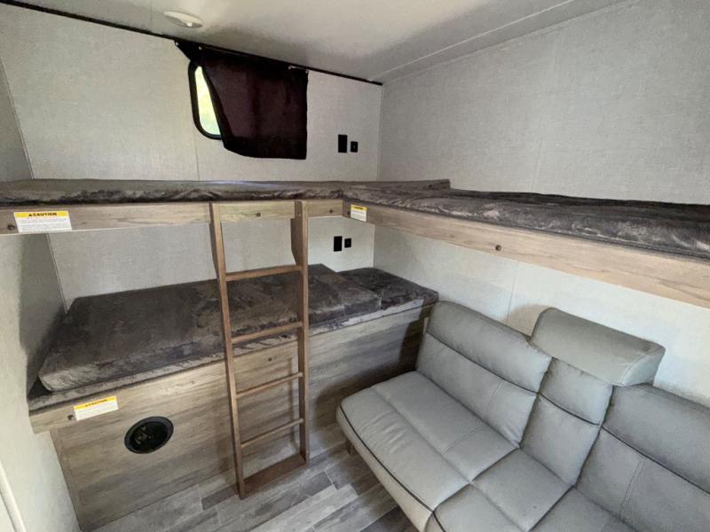 Pack your bags and load up the kids for a family vacation with this travel trailer! The kids will love having their own private bunkhouse with a set of bunk beds with a ladder, a dresser, and a bunk above a jackknife sofa. Just outside the bunkhouse is a linen closet across from full bathroom for everyone to start their days feeling clean and fresh. You can prepare delicious meals in the oven or even the microwave, and clean up easily with the stainless steel sink and stainless steel high-rise faucet. There is an entertainment center for all to enjoy while relaxing on either the jackknife sofa or the U-shaped dinette slide. You and your spouse will enjoy a good night's rest on the 60" x 74" RV queen bed, and you can charge your electronics too with the USB ports. There is also a TV hook-up for those nights when you just can't fall asleep.