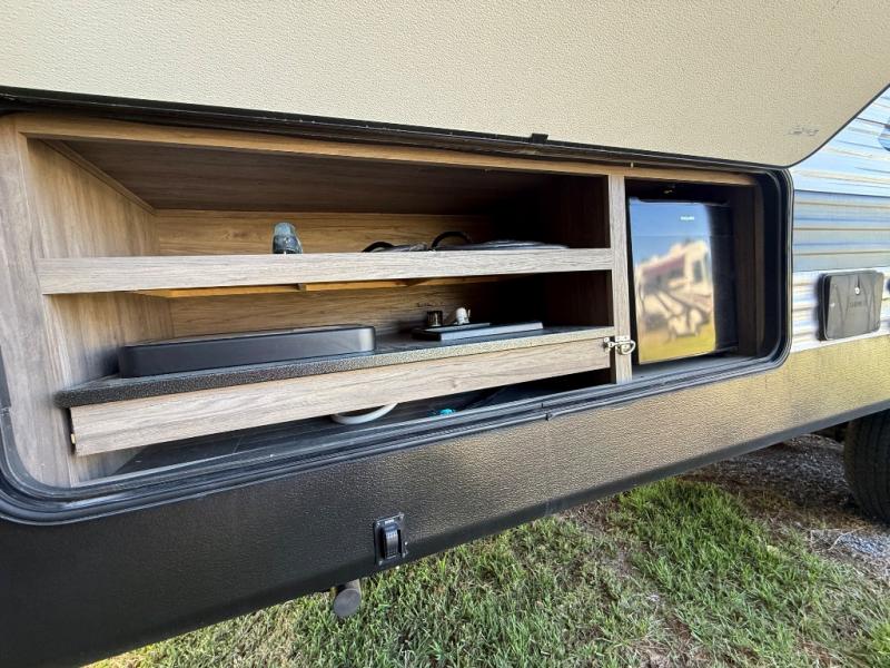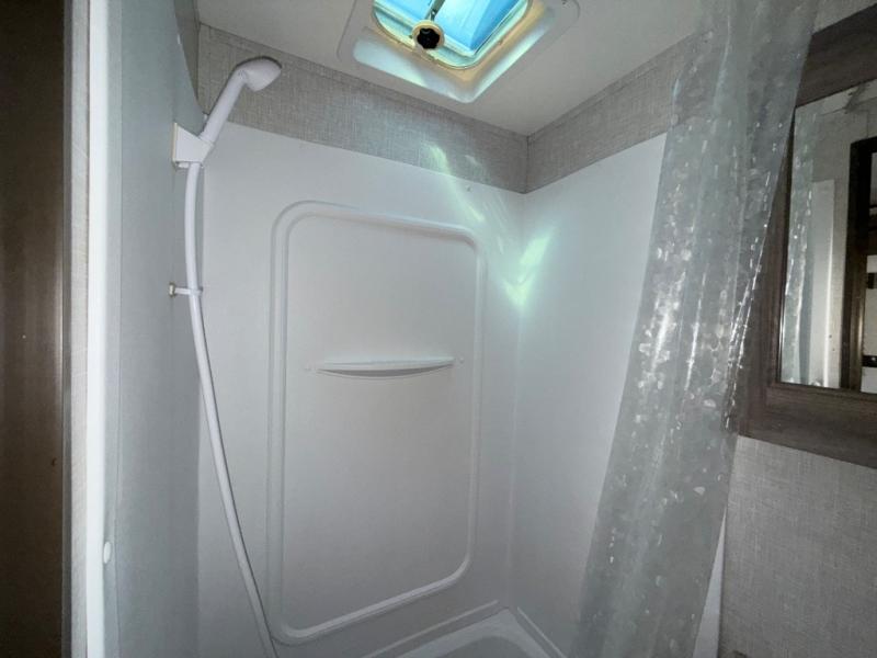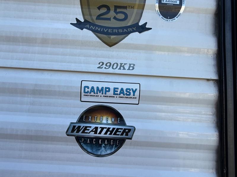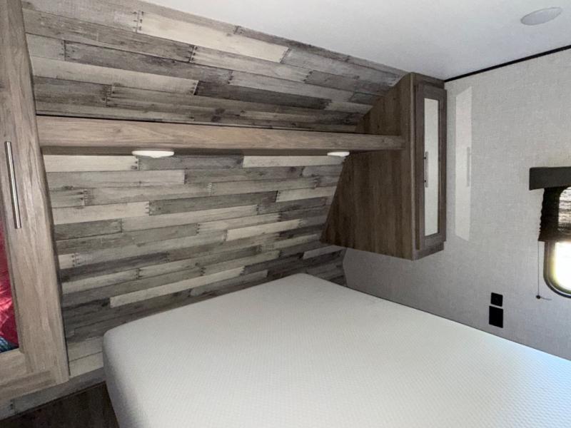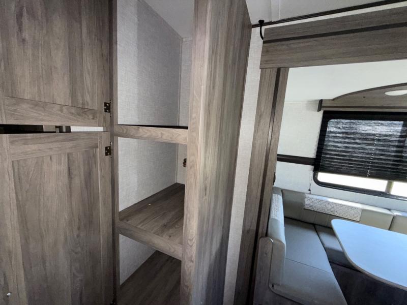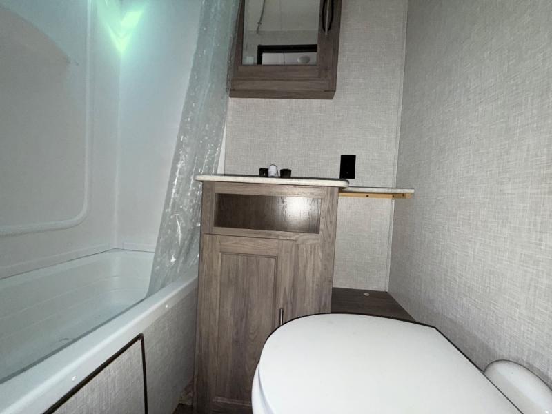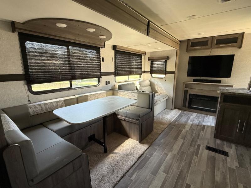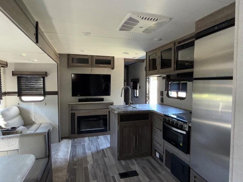 Pack your bags and load up the kids for a family vacation with this travel trailer! The kids will love having their own private bunkhouse with a set of bunk beds with a ladder, a dresser, and a bunk above a jackknife sofa. Just outside the bunkhouse is a linen closet across from full bathroom for everyone to start their days feeling clean and fresh. You can prepare delicious meals in the oven or even the microwave, and clean up easily with the stainless steel sink and stainless steel high-rise faucet. There is an entertainment center for all to enjoy while relaxing on either the jackknife sofa or the U-shaped dinette slide. You and your spouse will enjoy a good night's rest on the 60" x 74" RV queen bed, and you can charge your electronics too with the USB ports. There is also a TV hook-up for those nights when you just can't fall asleep.