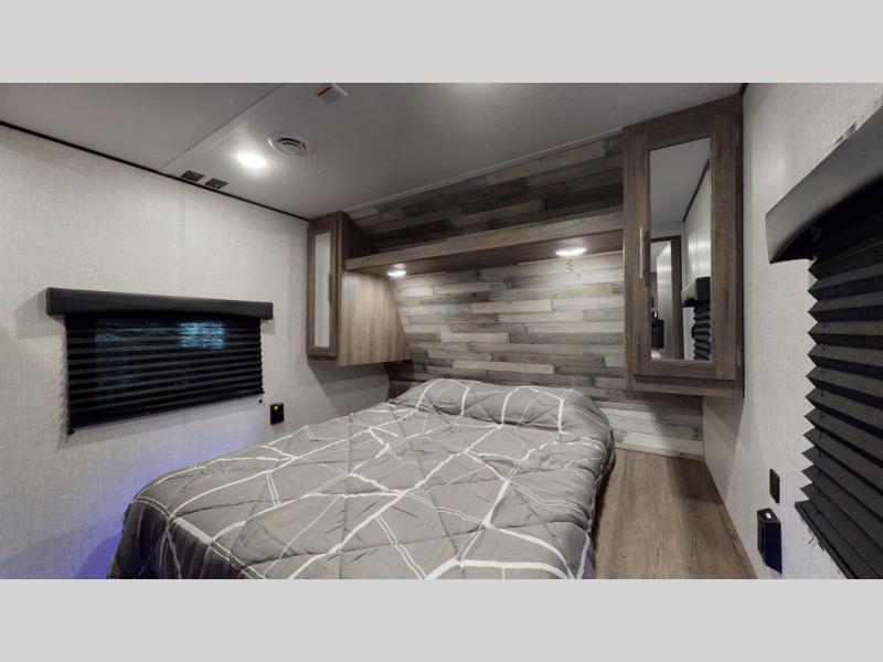 You will enjoy a good night's rest each night in this travel trailer with the 60" x 74" RV queen bed in the front private bedroom, plus there is a closet prepped to add the optional washer and dryer to enjoy clean clothes throughout your entire trip. In the rear you will find the perfect atmosphere to relax at night with the 60" jackknife sofa, the swiveling entertainment center with a fireplace and a 50" TV, and even a wine cooler to keep your beverage close by and cool. During the day you can stay outdoors as long as you want, you can even stay outside while cooking dinner thanks to the outside kitchen which has counter space to prepare your meal too!