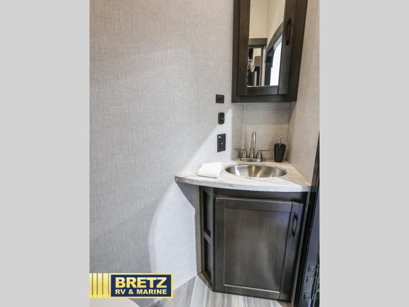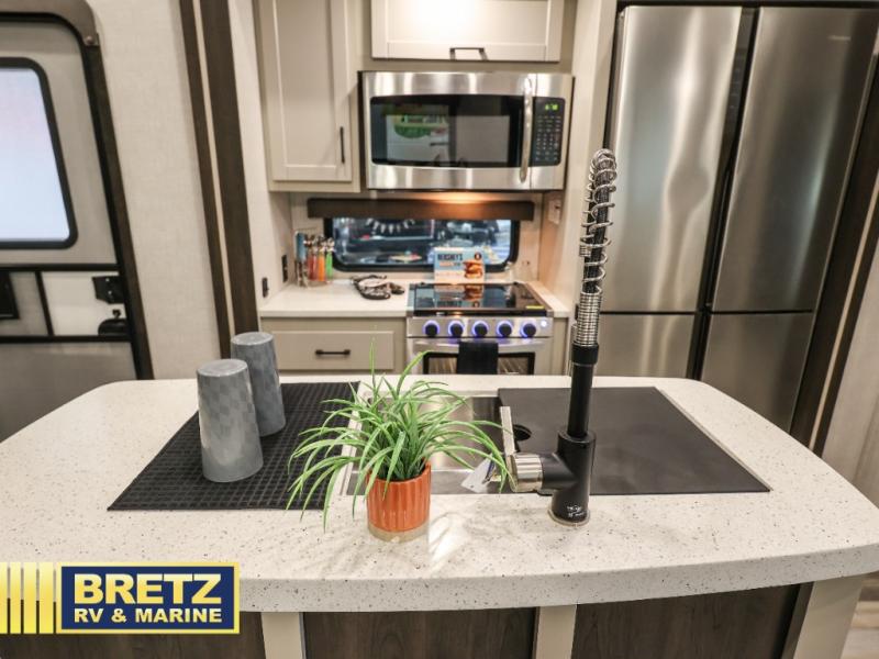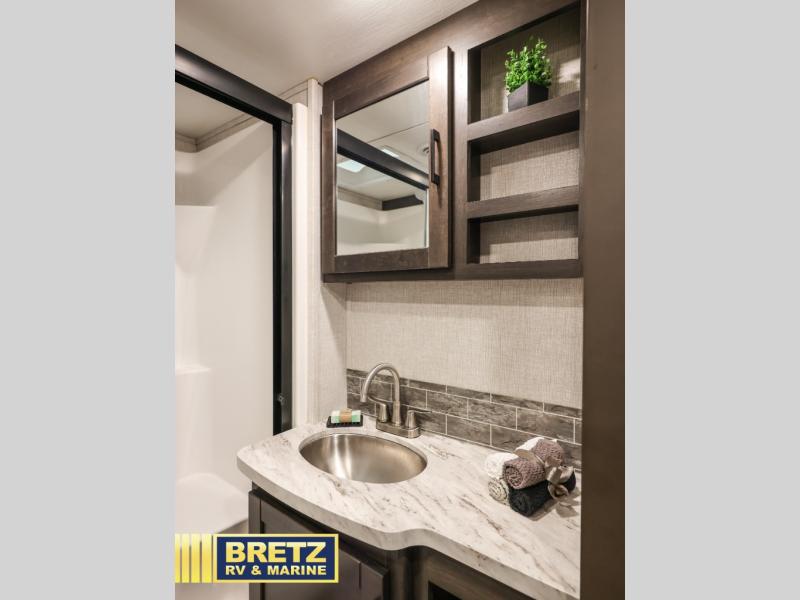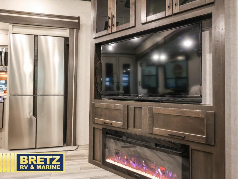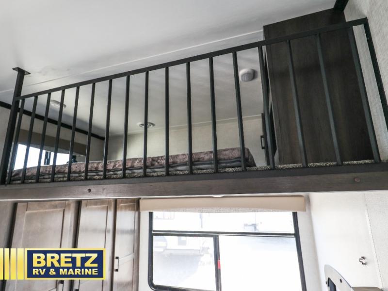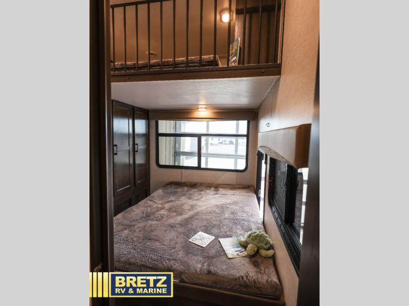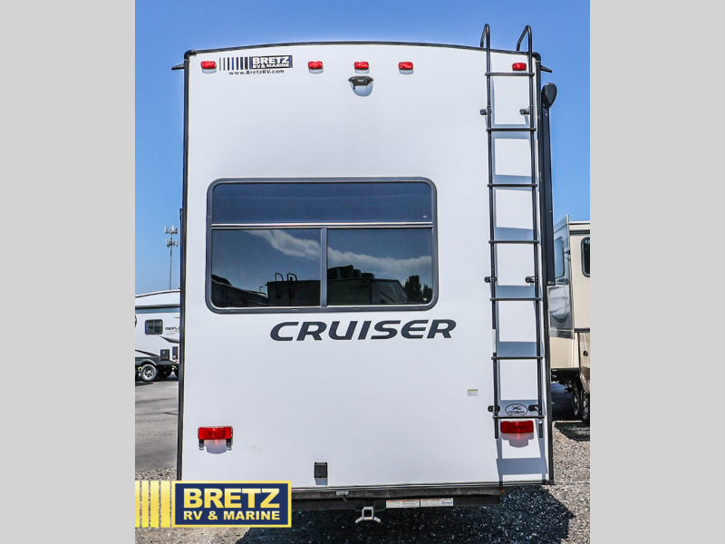 This award-winning Cruiser fifth wheel literally has it all! You will be completely impressed by the many fabulous features found all throughout this model, like the king bed slide in the front private bedroom, the rear bunkhouse suite that has its own half bath and second exterior entry door, and the comfortable living area with a free-standing table with chairs, 50" LED HDTV, and a fireplace. Since there are a set of opposing slides in the main living area, you'll have plenty of room to work around the kitchen island while you prepare dinner. If you are tired of remaining indoors, you can simply take your ingredients outside to use the outdoor kitchen.