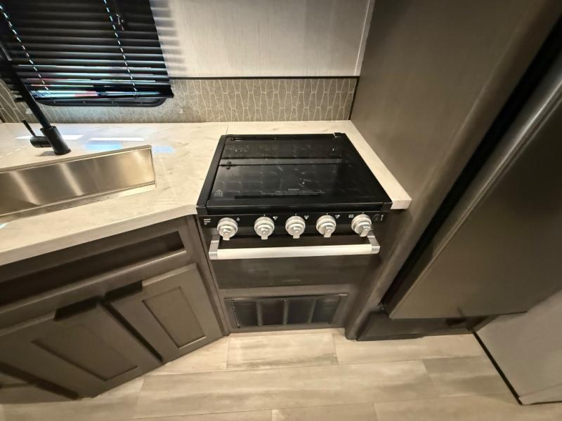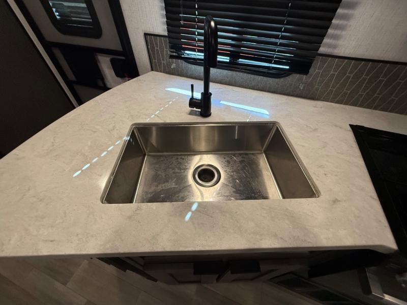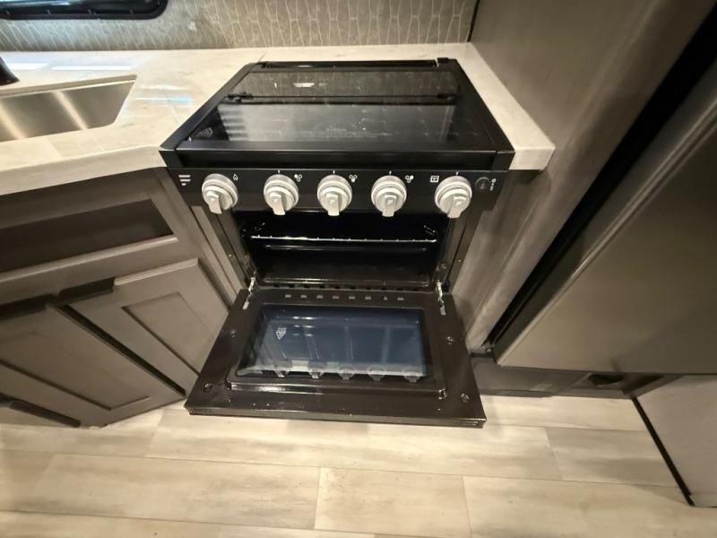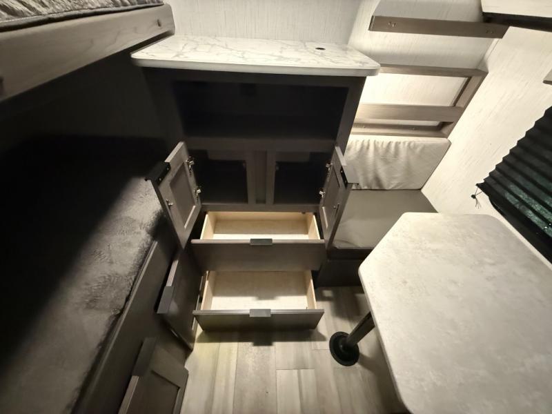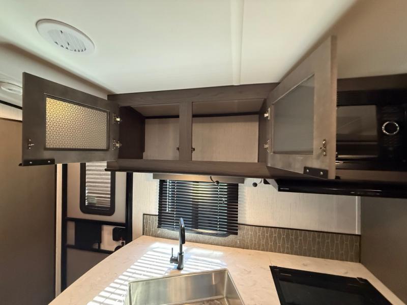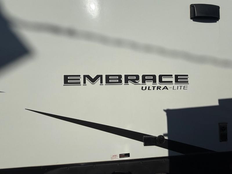 Step inside and you'll find a light and airy interior with residential-style finishes, a fully equipped kitchen, and a slide-out that opens up the living space for relaxing or entertaining. Whether you're cooking dinner, watching a movie, or enjoying a rainy day indoors, the Embrace EL280 keeps you comfortable and connected to nature—all at once.