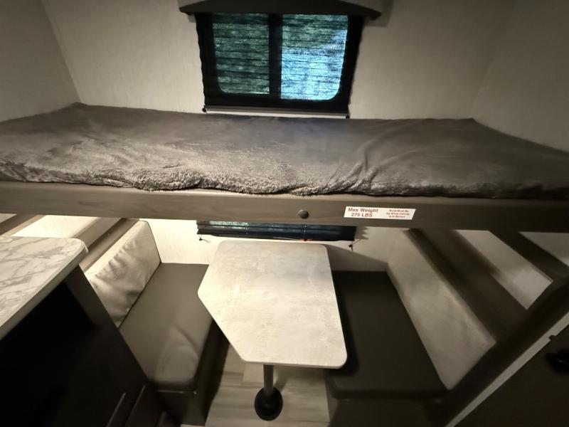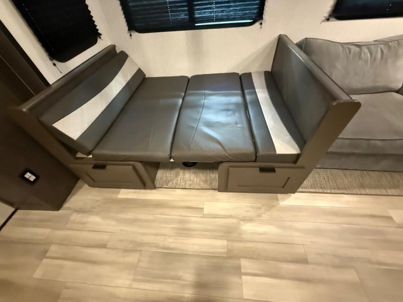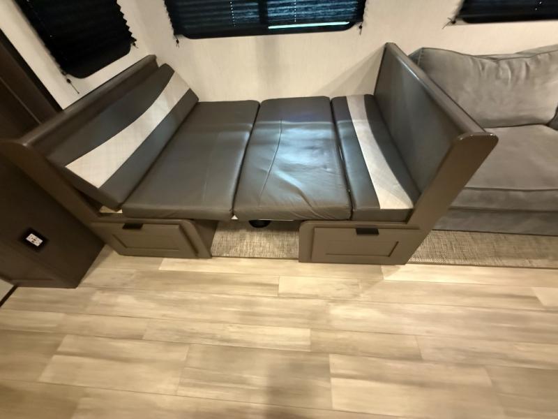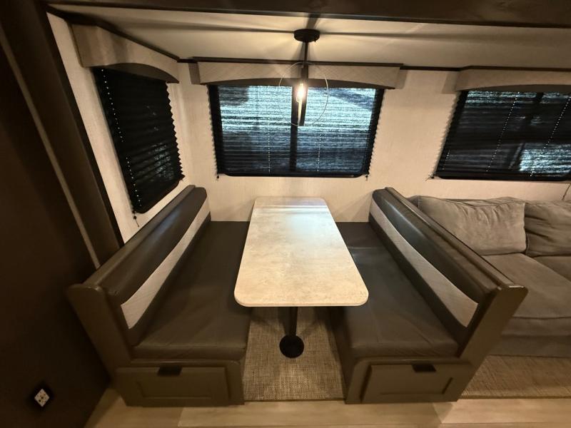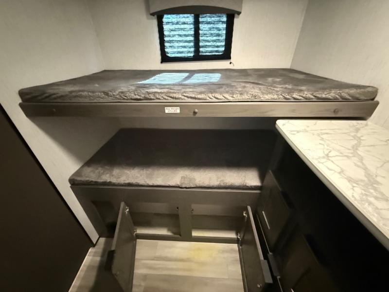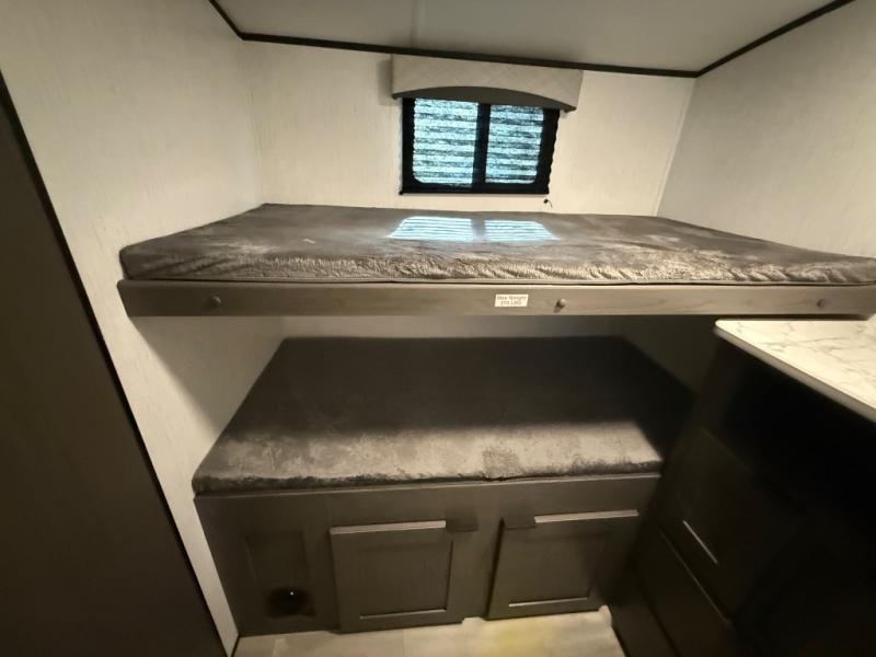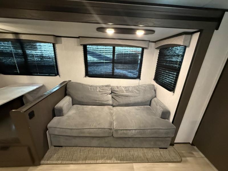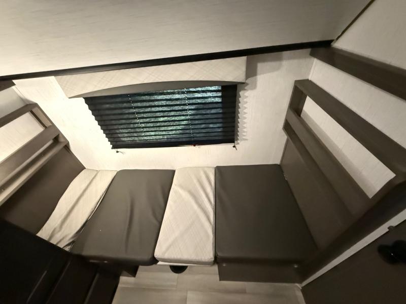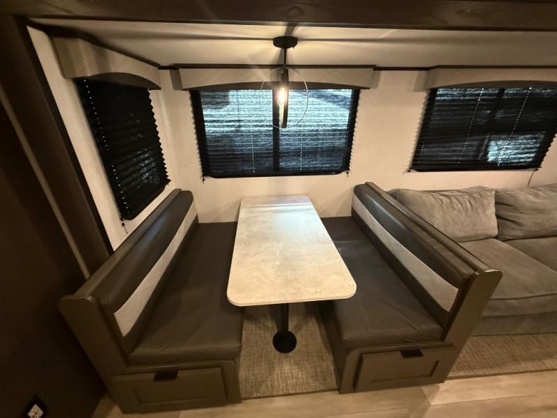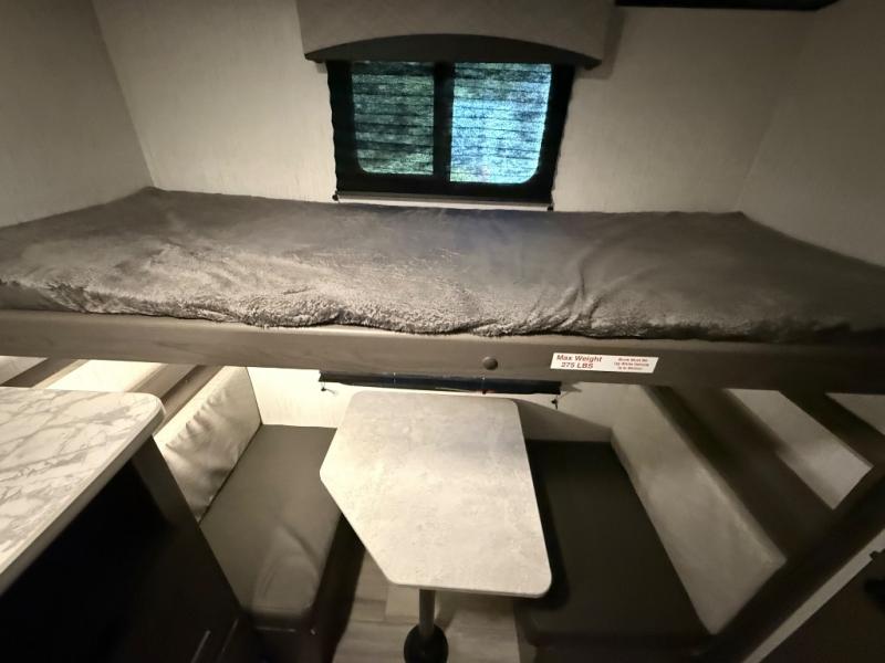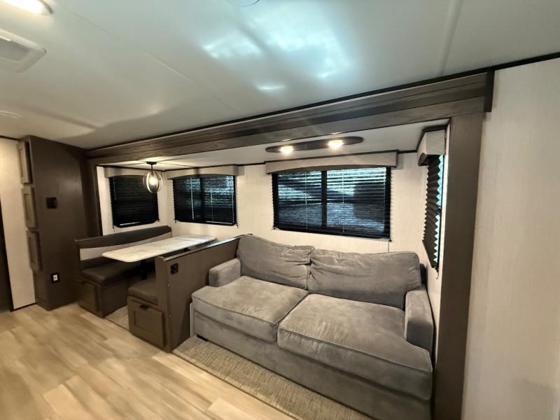 Make unforgettable camping trips in this travel trailer for nine! Your guests or the kids will love the private bunkhouse that includes three bunks, plus a booth dinette where they can enjoy a snack or work on their laptop. The full bath is close by for convenience, and the large slide out in the main living area will allow everyone space to move about freely. This model includes a 39" LED TV within the entertainment center, plus a tri-fold sofa and a booth dinette for comfortable seating space. You will love the king bed sliding system in the front bedroom that allows you move the bed from left to right so you can easily access the dual bedroom wardrobes. You can't pass this travel trailer up!