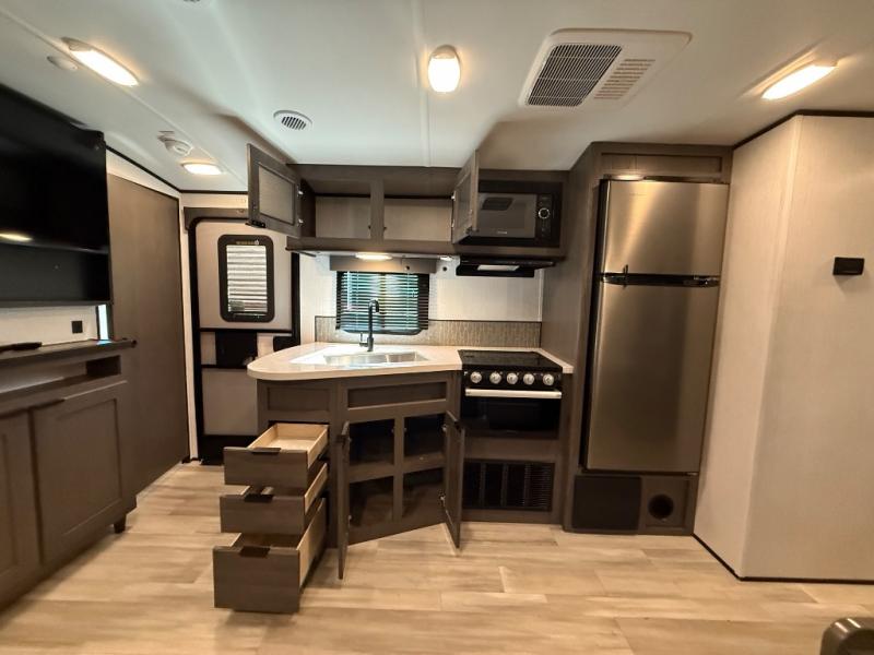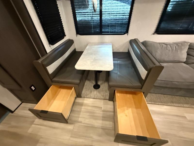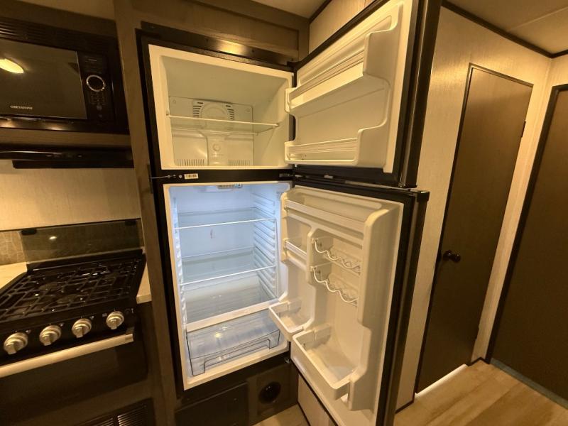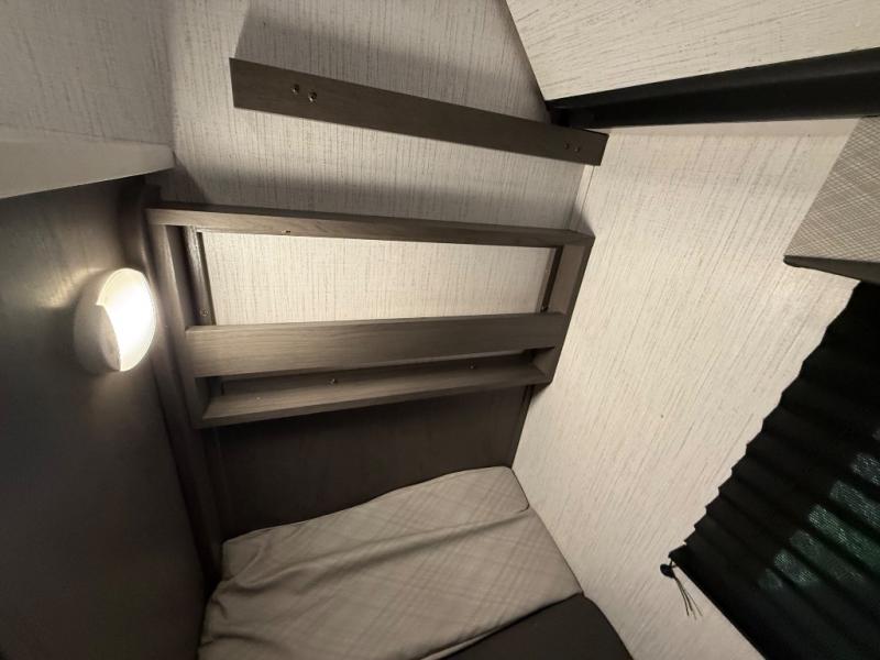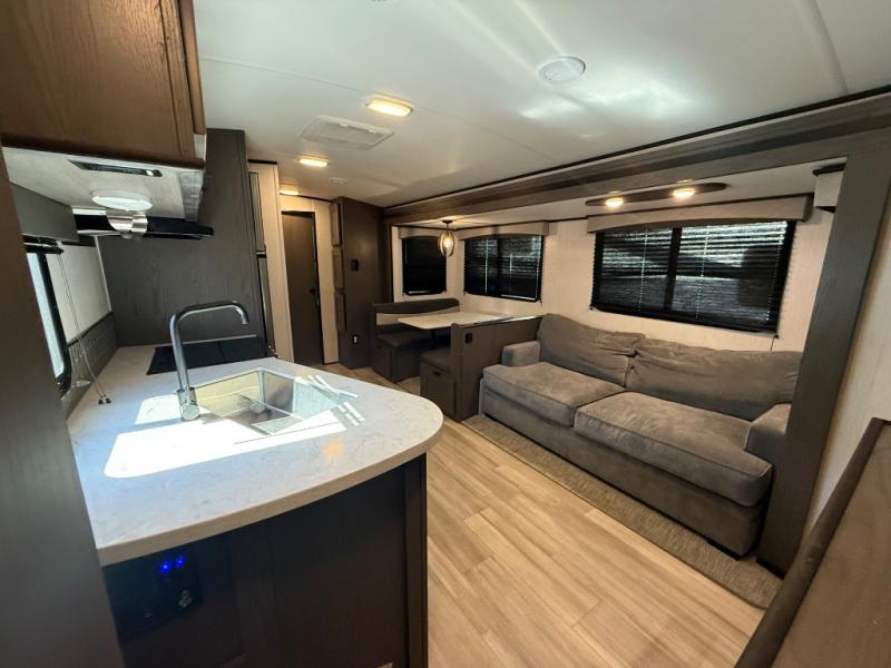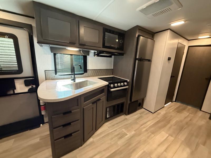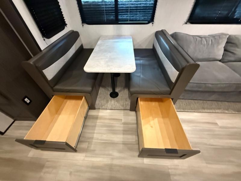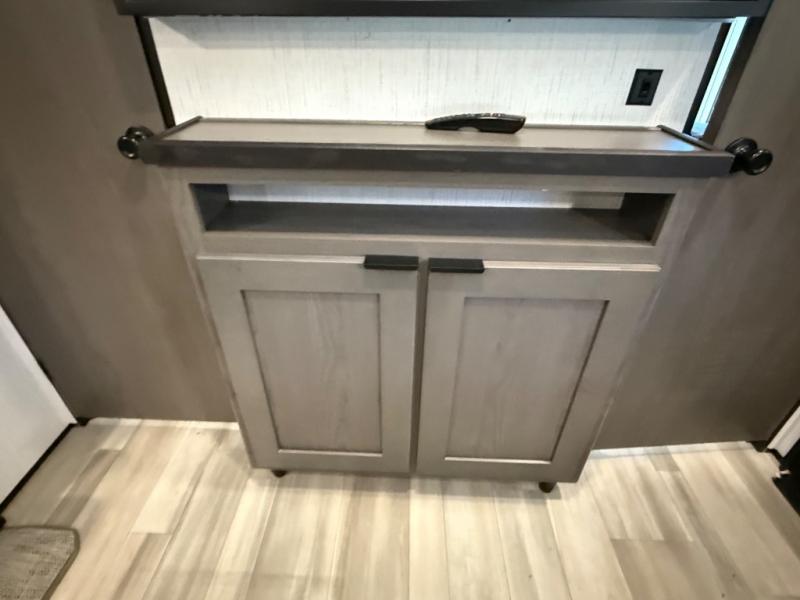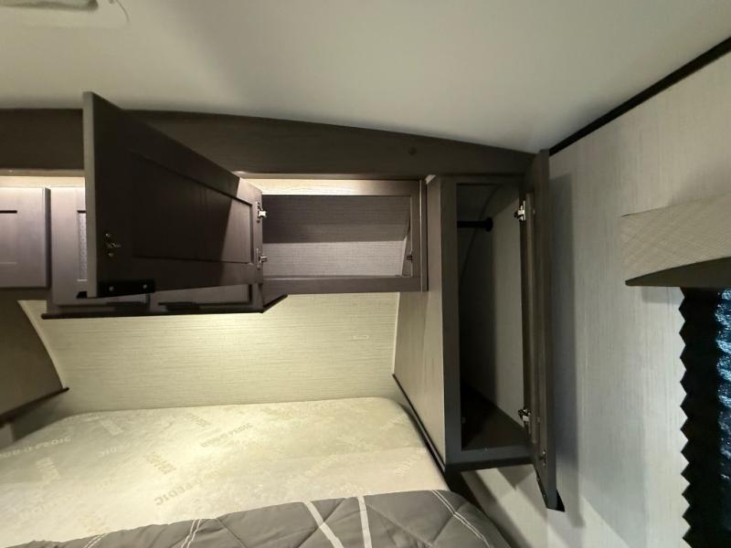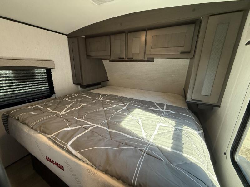 Make unforgettable camping trips in this travel trailer for nine! Your guests or the kids will love the private bunkhouse that includes three bunks, plus a booth dinette where they can enjoy a snack or work on their laptop. The full bath is close by for convenience, and the large slide out in the main living area will allow everyone space to move about freely. This model includes a 39" LED TV within the entertainment center, plus a tri-fold sofa and a booth dinette for comfortable seating space. You will love the king bed sliding system in the front bedroom that allows you move the bed from left to right so you can easily access the dual bedroom wardrobes. You can't pass this travel trailer up!
