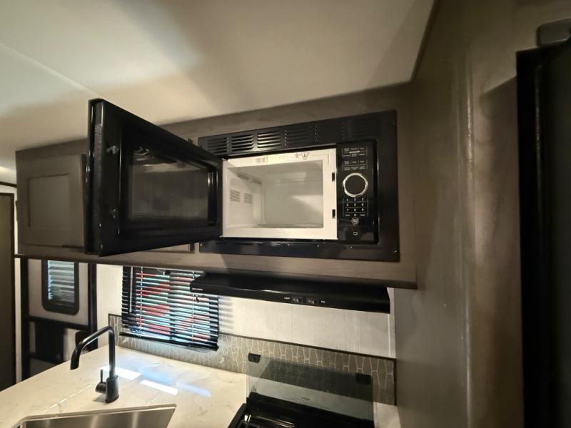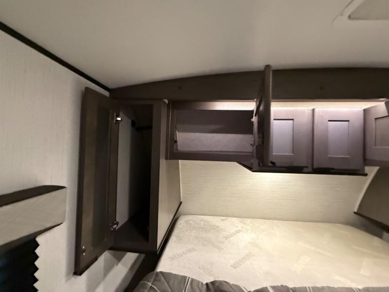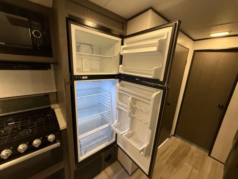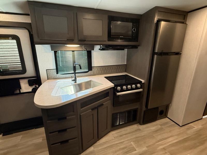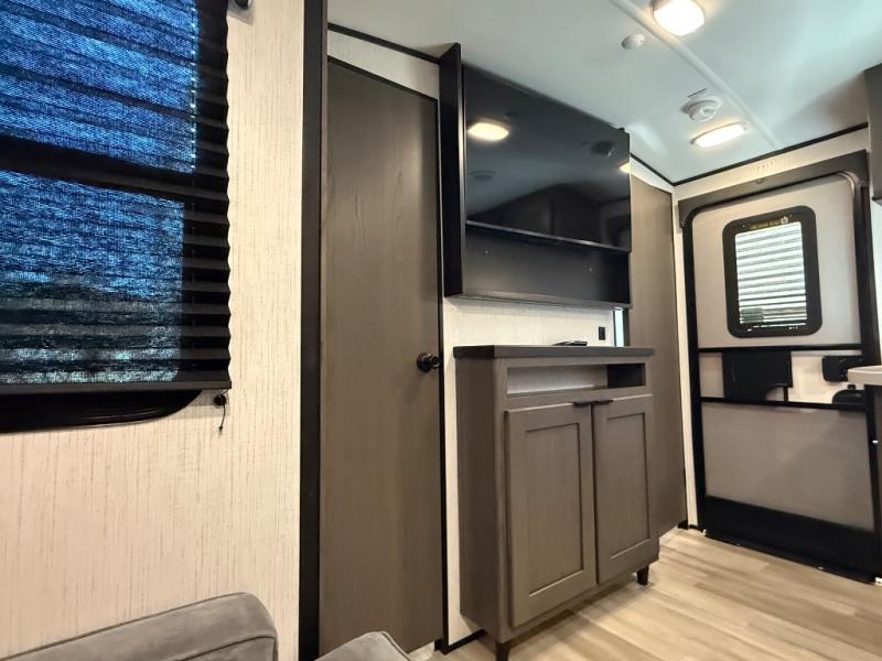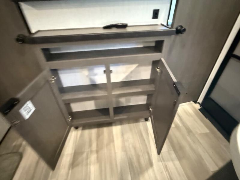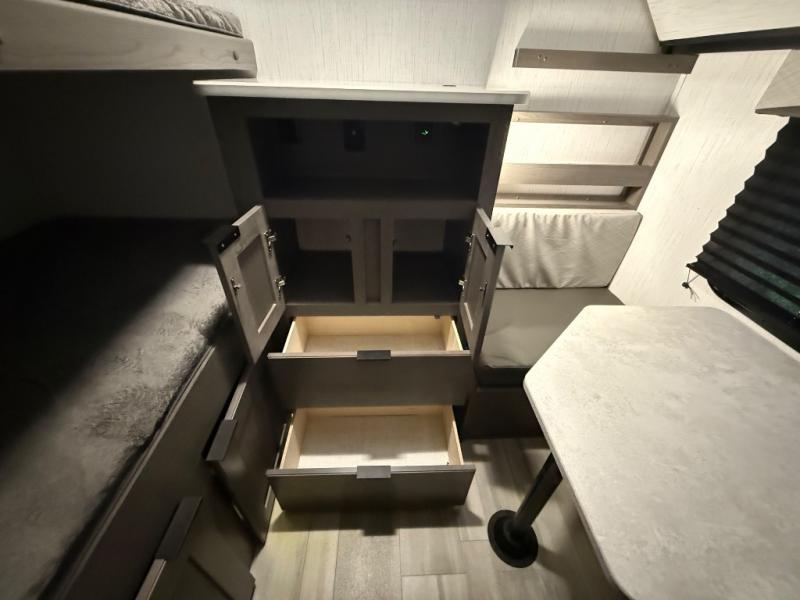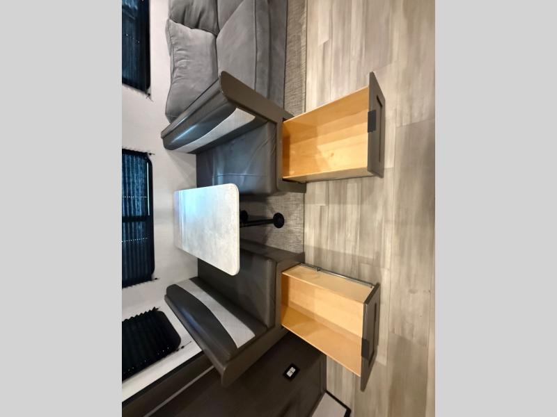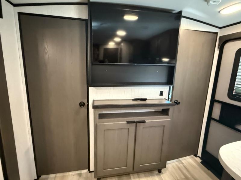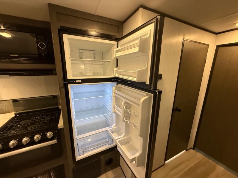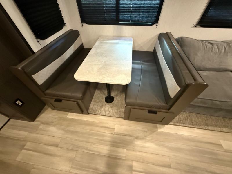 Make unforgettable camping trips in this travel trailer for nine! Your guests or the kids will love the private bunkhouse that includes three bunks, plus a booth dinette where they can enjoy a snack or work on their laptop. The full bath is close by for convenience, and the large slide out in the main living area will allow everyone space to move about freely. This model includes a 39" LED TV within the entertainment center, plus a tri-fold sofa and a booth dinette for comfortable seating space. You will love the king bed sliding system in the front bedroom that allows you move the bed from left to right so you can easily access the dual bedroom wardrobes. You can't pass this travel trailer up!