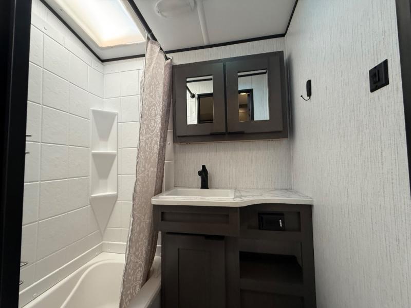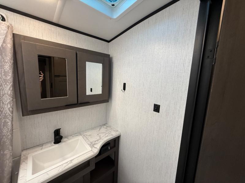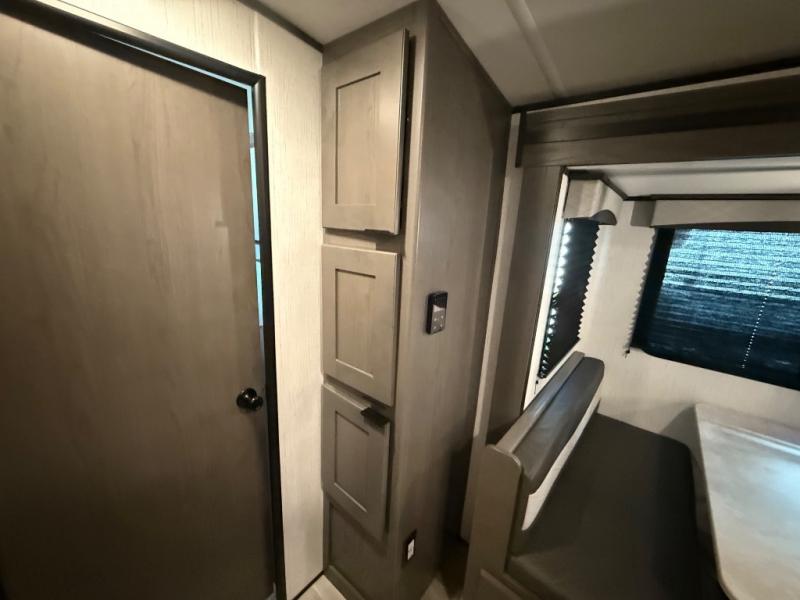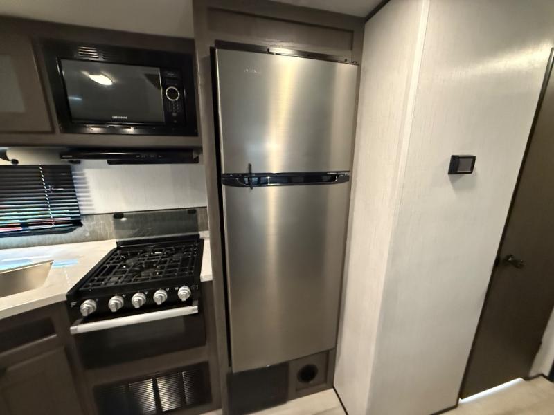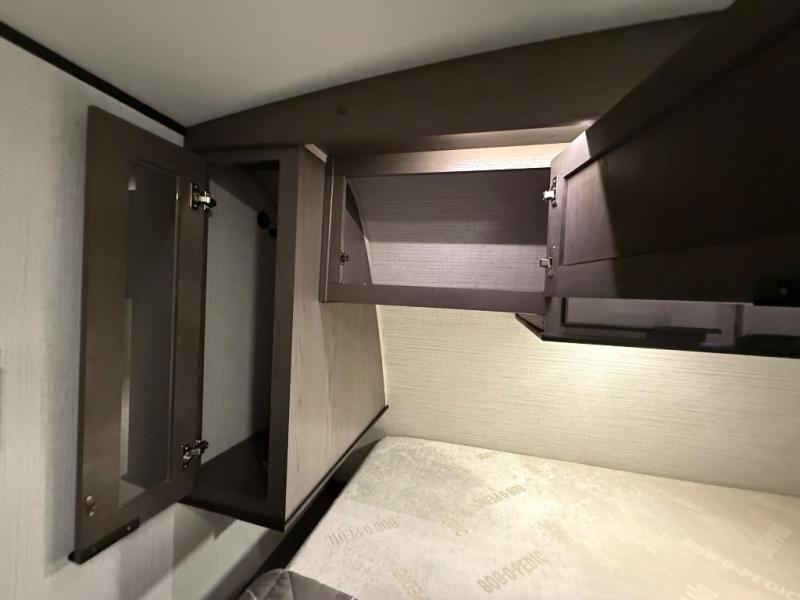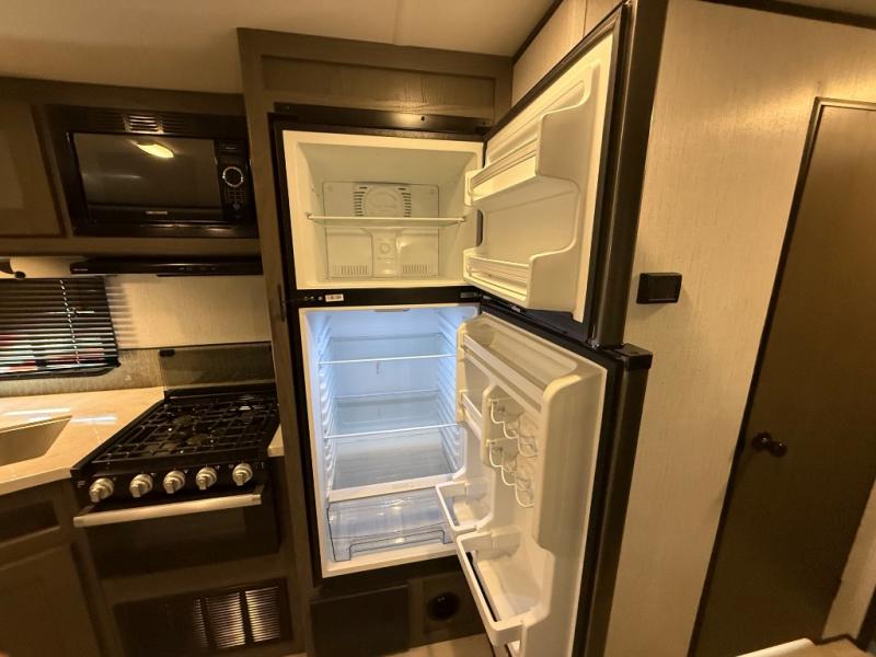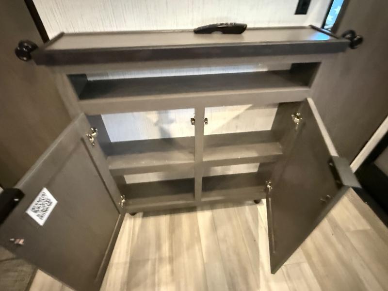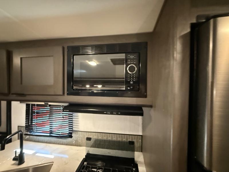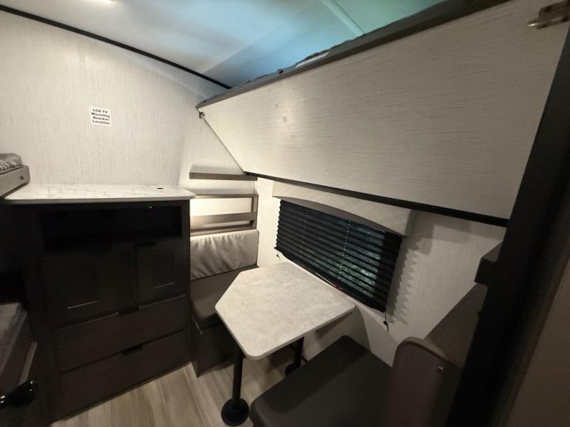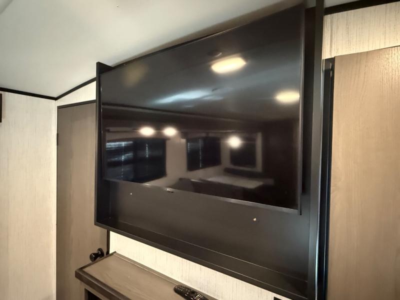Make unforgettable camping trips in this travel trailer for nine! Your guests or the kids will love the private bunkhouse that includes three bunks, plus a booth dinette where they can enjoy a snack or work on their laptop. The full bath is close by for convenience, and the large slide out in the main living area will allow everyone space to move about freely. This model includes a 39" LED TV within the entertainment center, plus a tri-fold sofa and a booth dinette for comfortable seating space. You will love the king bed sliding system in the front bedroom that allows you move the bed from left to right so you can easily access the dual bedroom wardrobes. You can't pass this travel trailer up!