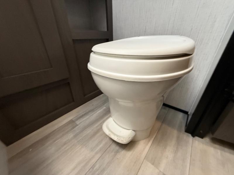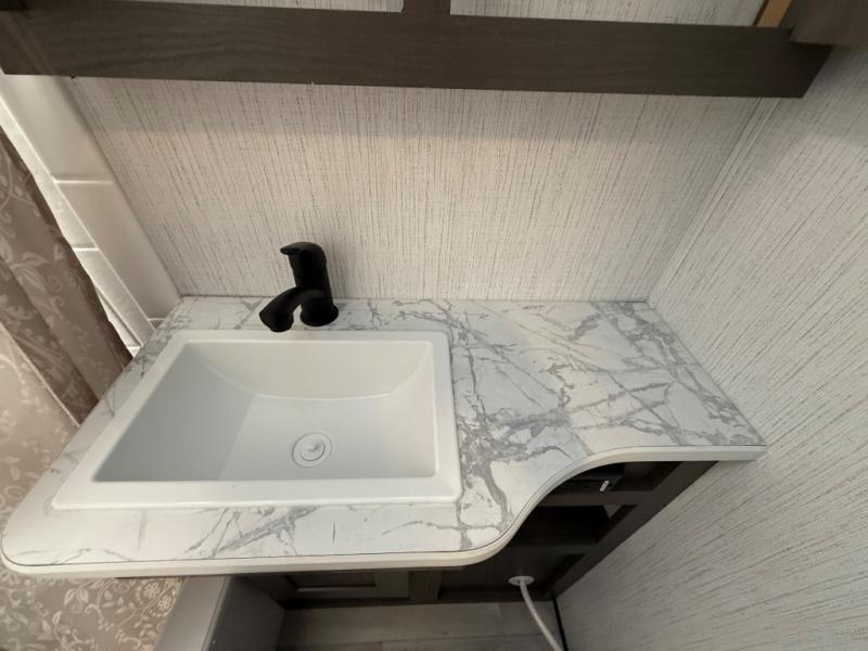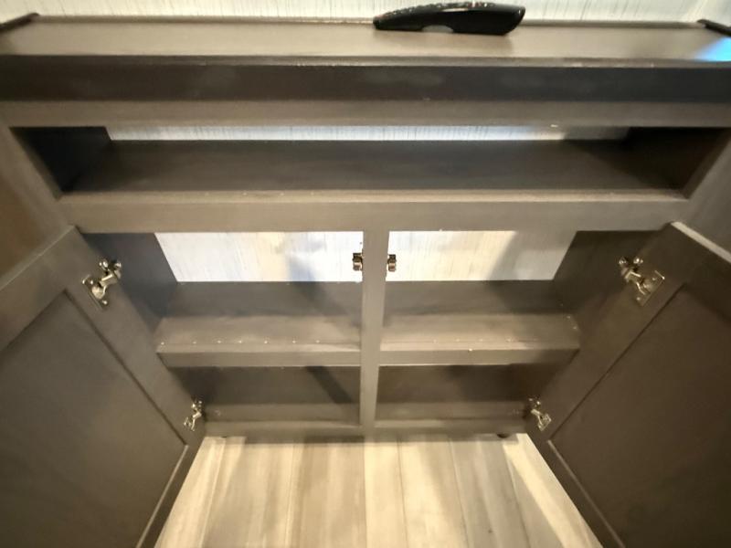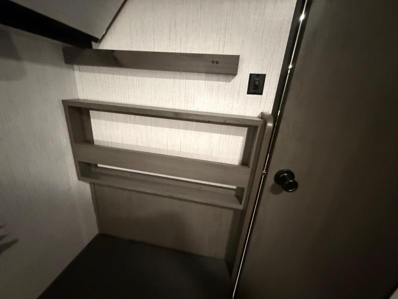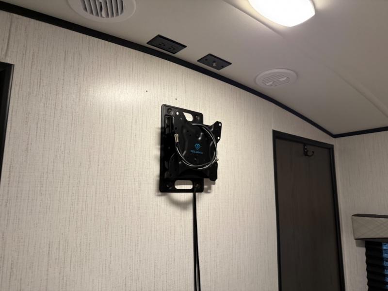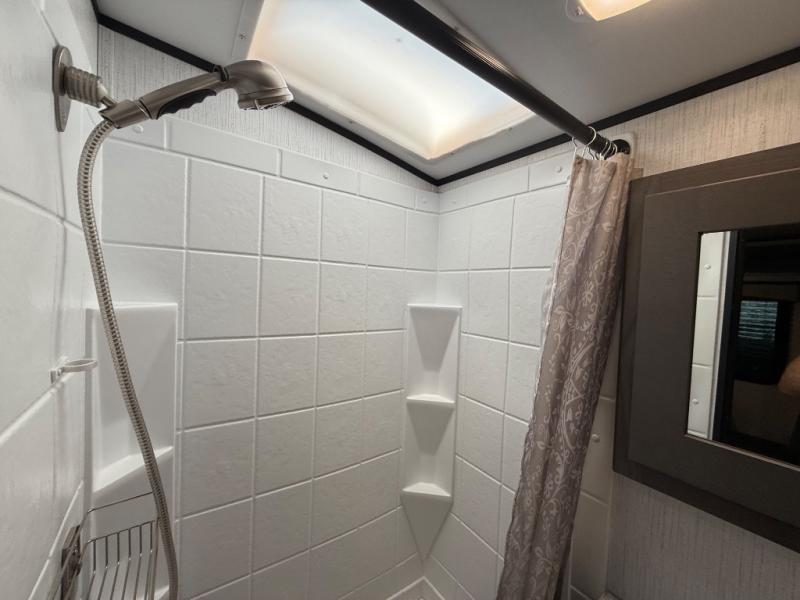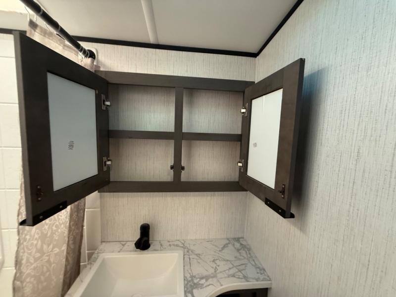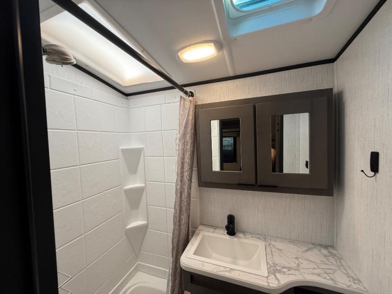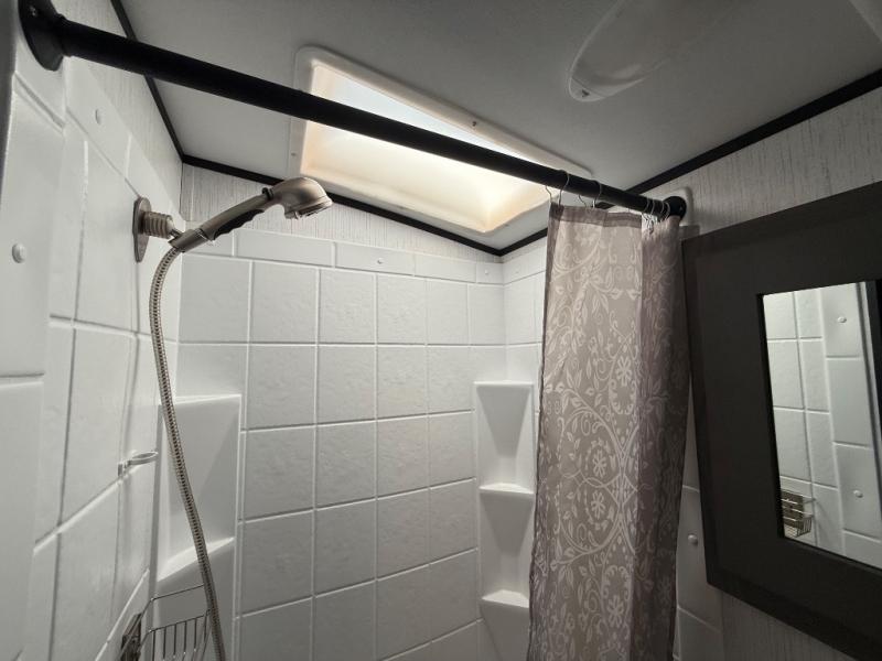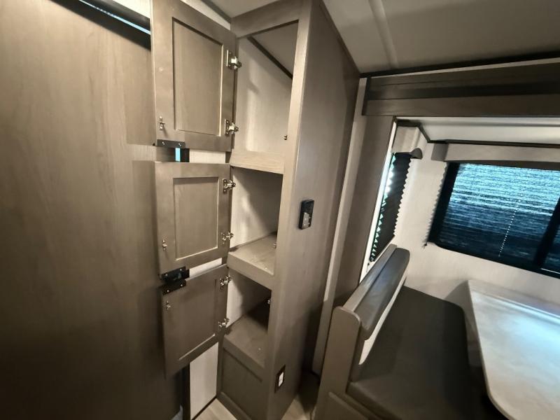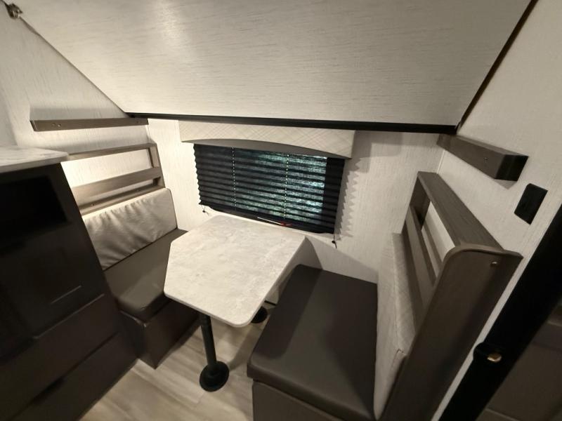 Make unforgettable camping trips in this travel trailer for nine! Your guests or the kids will love the private bunkhouse that includes three bunks, plus a booth dinette where they can enjoy a snack or work on their laptop. The full bath is close by for convenience, and the large slide out in the main living area will allow everyone space to move about freely. This model includes a 39" LED TV within the entertainment center, plus a tri-fold sofa and a booth dinette for comfortable seating space. You will love the king bed sliding system in the front bedroom that allows you move the bed from left to right so you can easily access the dual bedroom wardrobes. You can't pass this travel trailer up!