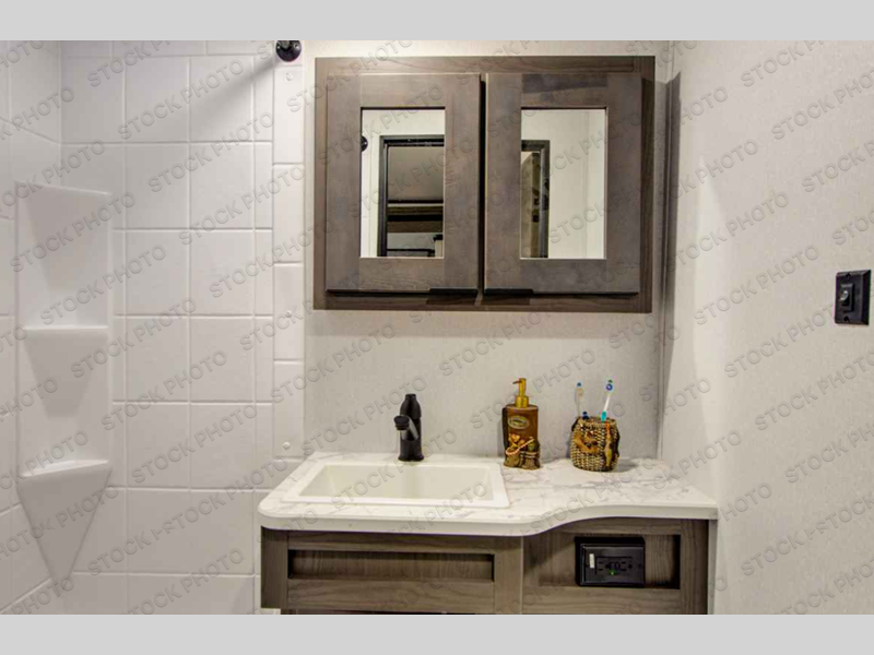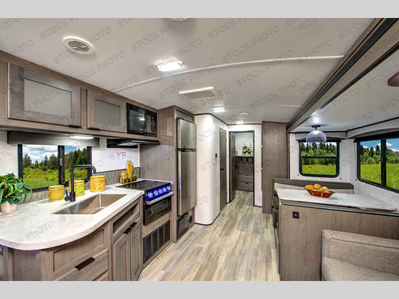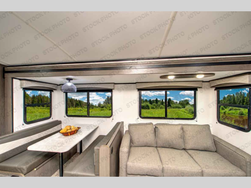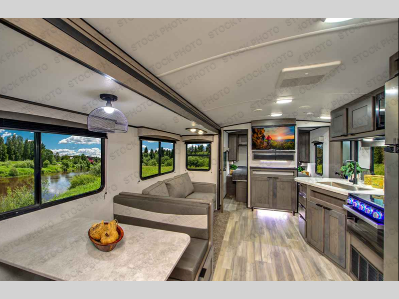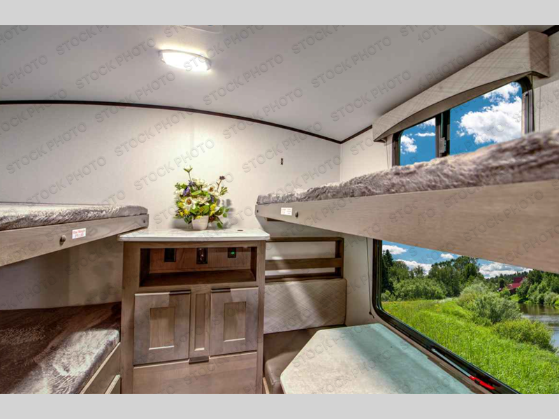 Make unforgettable camping trips in this travel trailer for nine! Your guests or the kids will love the private bunkhouse that includes three bunks, plus a booth dinette where they can enjoy a snack or work on their laptop. The full bath is close by for convenience, and the large slide out in the main living area will allow everyone space to move about freely. This model includes a 39" LED TV within the entertainment center, plus a tri-fold sofa and a booth dinette for comfortable seating space. You will love the king bed sliding system in the front bedroom that allows you move the bed from left to right so you can easily access the dual bedroom wardrobes. You can't pass this travel trailer up!