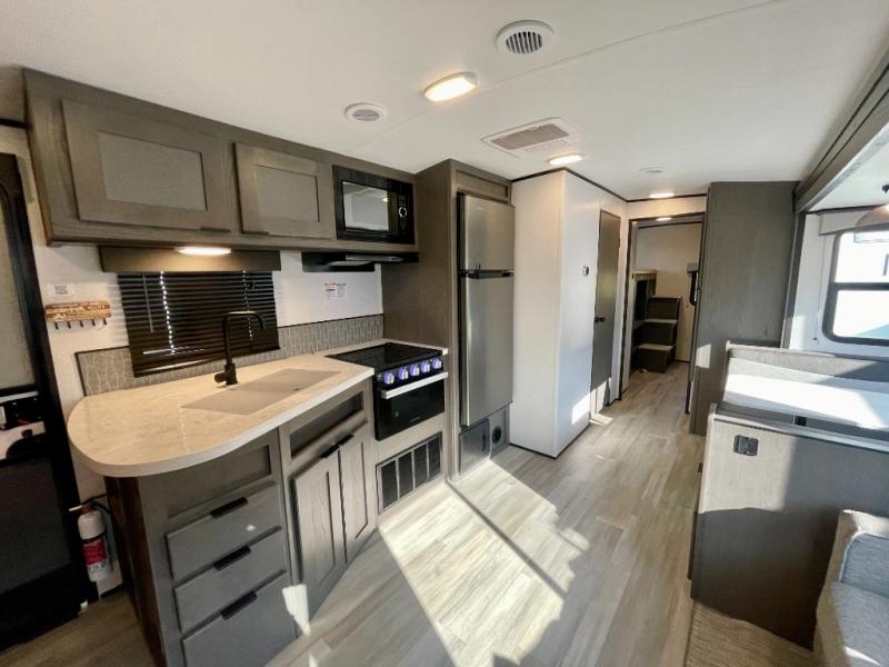 Double slides and double entry doors equal double the fun in this roomy travel trailer. Your guests will love the rear private bunkhouse that includes three bunks, plus a futon to relax on during the day. The full bath is close by and it includes its own exterior entry door for added convenience. Your crew can meet up in the main living area on the tri-fold sofa or at the booth dinette within the large slide out, or you may just want to head outdoors under the 19' power awning with LED lights. The chef can whip up dinner on the exterior kitchen, while the kids grab their scooters from the pass-through storage!