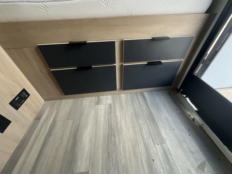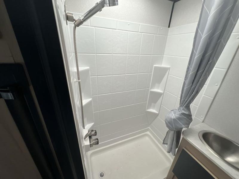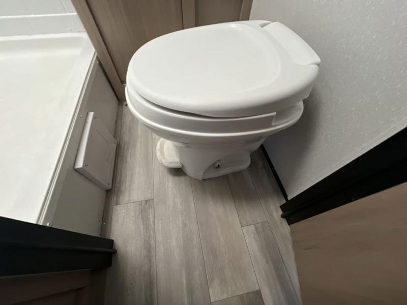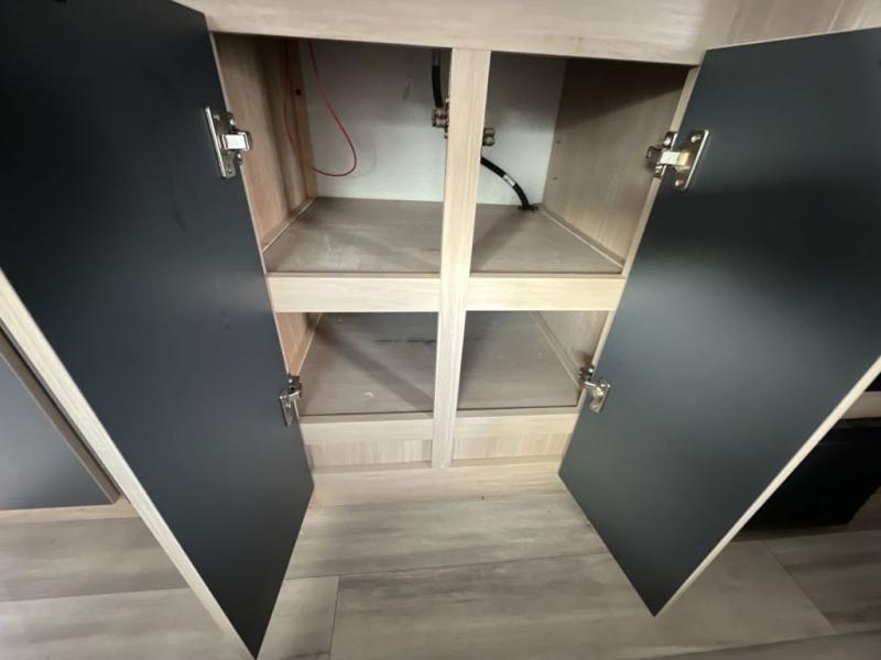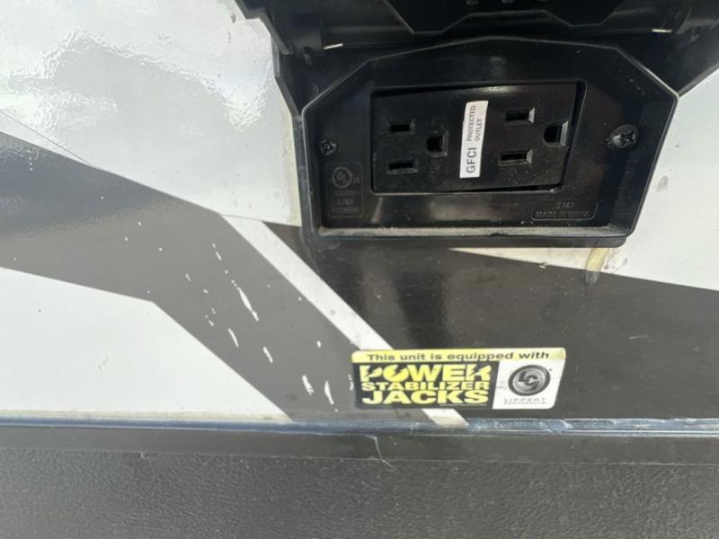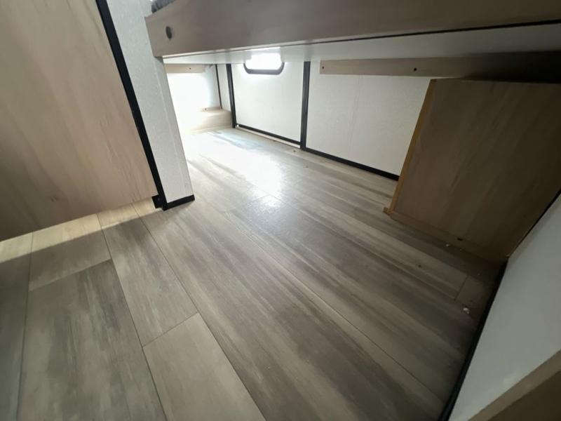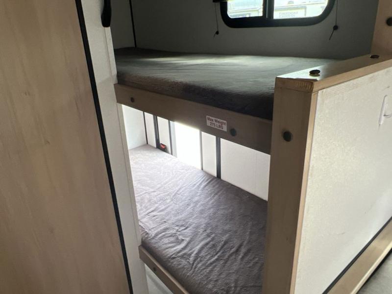 The whole family can camp comfortably in this travel trailer! The kids can sleep on the set of double bunk beds and you can sleep on the front queen bed with drawers underneath to store your necessities. The booth dinette could also transform into an extra sleeping space when you aren't using it to enjoy a meal prepared with the two burner cooktop and 8 cu. ft. refrigerator. Everyone can stay squeaky clean with the shower in the rear corner bathroom. Don't leave any outdoor gear behind when you have a front exterior full pass-through storage area for it all!