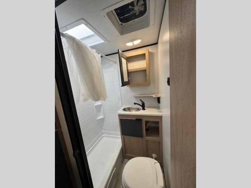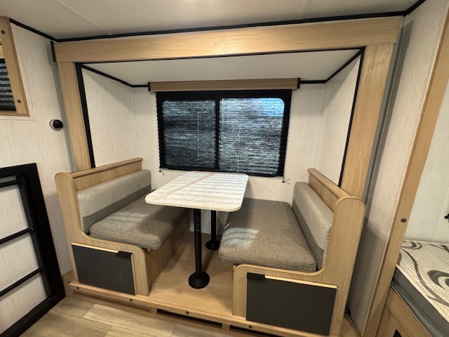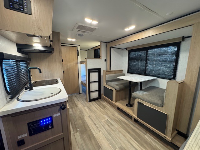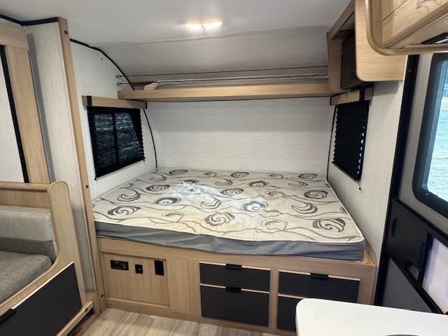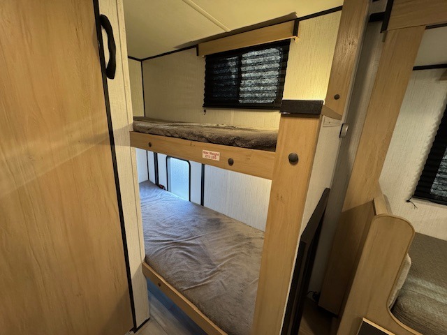 Pack your bags and hitch up this travel trailer for a fun family vacation! The kids can sleep on the set of double bunk beds and you can sleep on the front queen bed with drawers underneath to store your necessities. The booth dinette slide not only opens up the living area, but also transforms into an extra sleeping space when you aren't using it to enjoy a meal prepared with the two burner cooktop and 5 cu. ft. refrigerator. Everyone can stay squeaky clean with the shower in the rear corner bathroom. Don't leave any outdoor gear behind when you have a front exterior full pass-through storage area for it all!